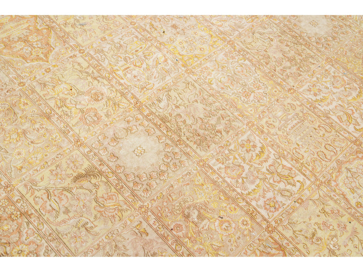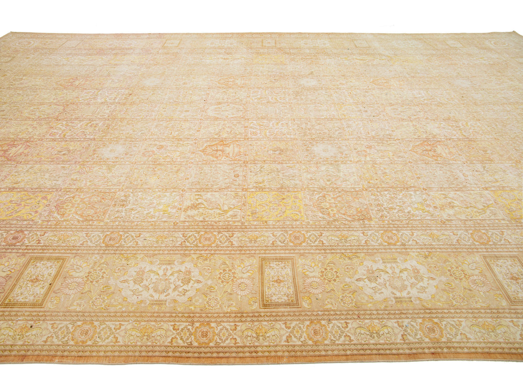 This handcrafted Persian Tabriz wool rug features a traditional floral pattern. The contrast between the beige background highlights the brown, orange, and yellow floral design. This rug measures 13' x 19'6'.