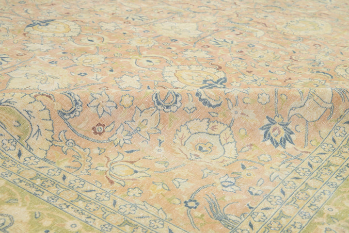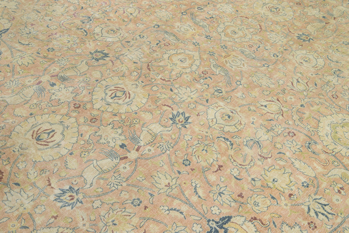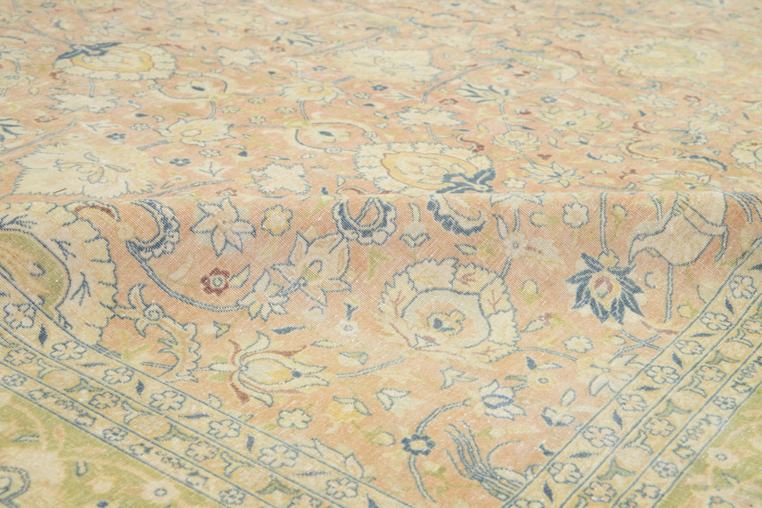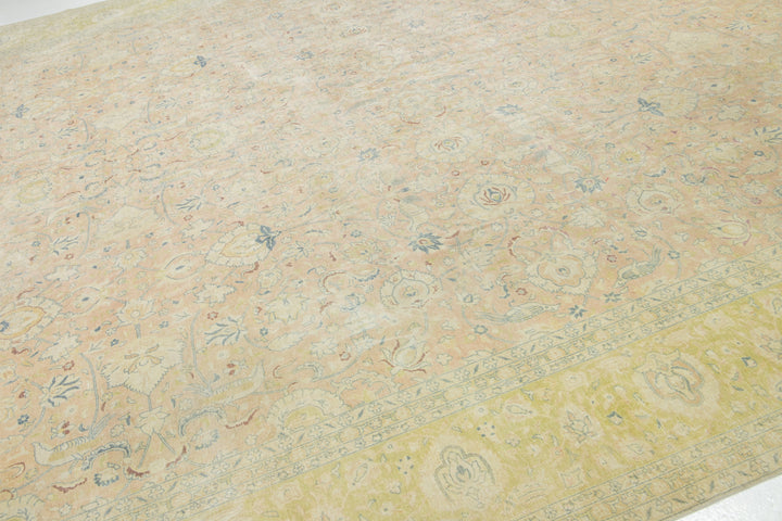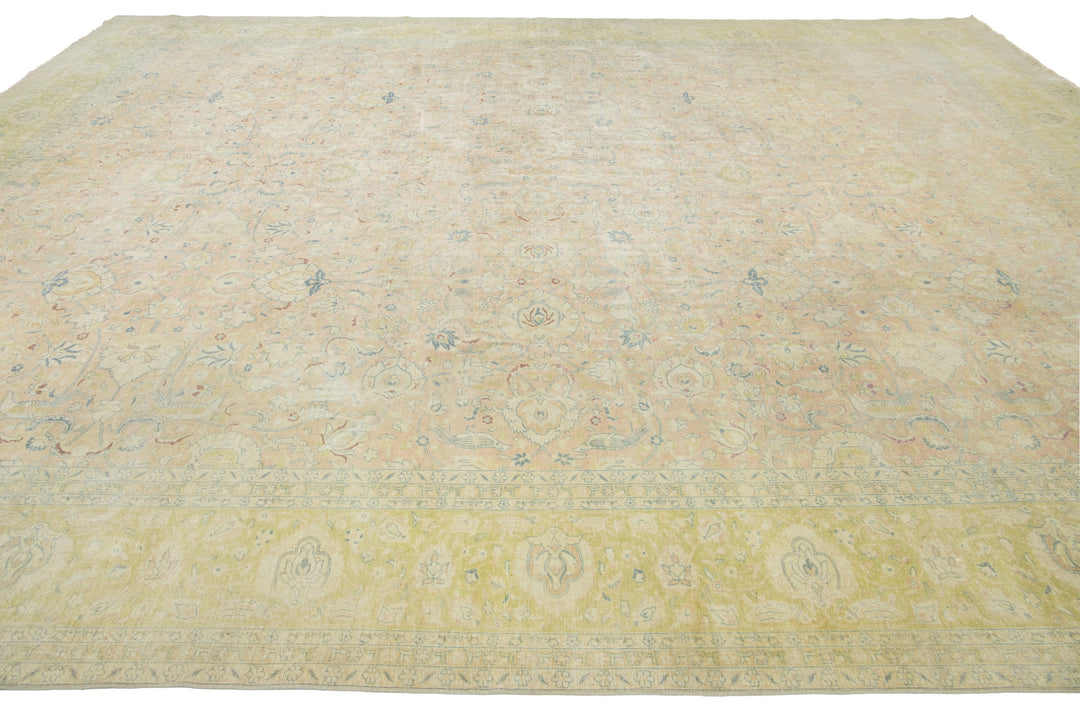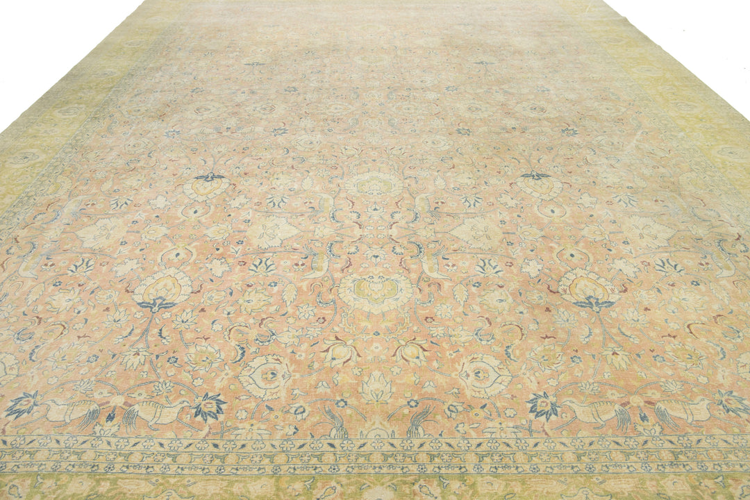 Experience the exquisite charm of this antique Tabriz hand-knotted oversized wool rug. Its captivating tan and peach-hued field showcases an intricate all-over pattern, beautifully complemented by shades of green and blue. This rug measures 12'9" x 15'11".