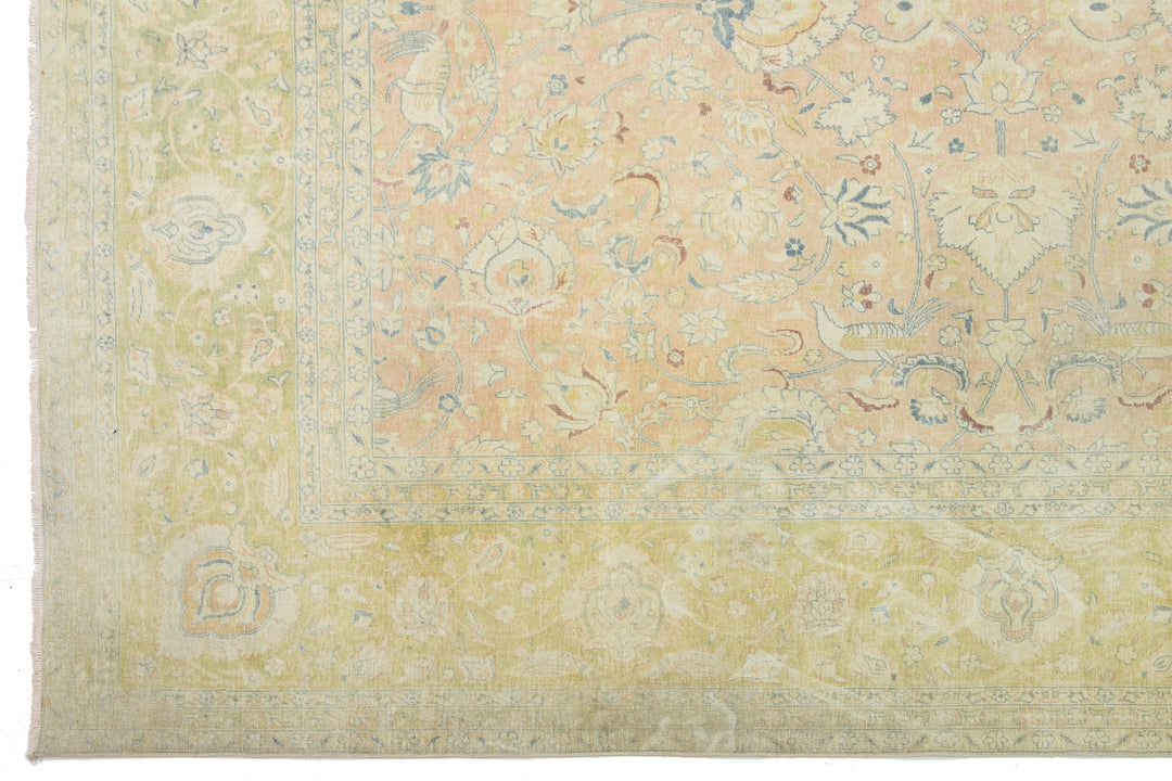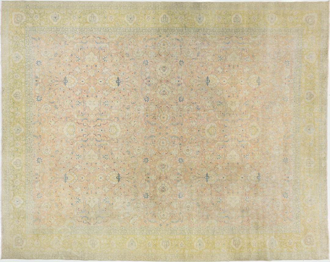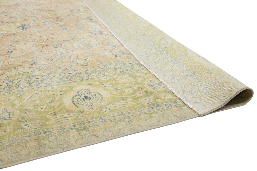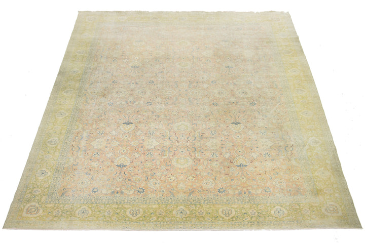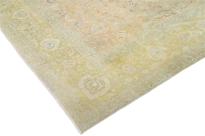 Experience the exquisite charm of this antique Tabriz hand-knotted oversized wool rug. Its captivating tan and peach-hued field showcases an intricate all-over pattern, beautifully complemented by shades of green and blue. This rug measures 12'9" x 15'11".