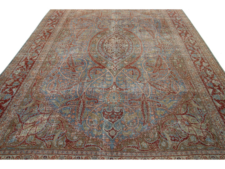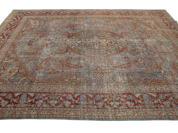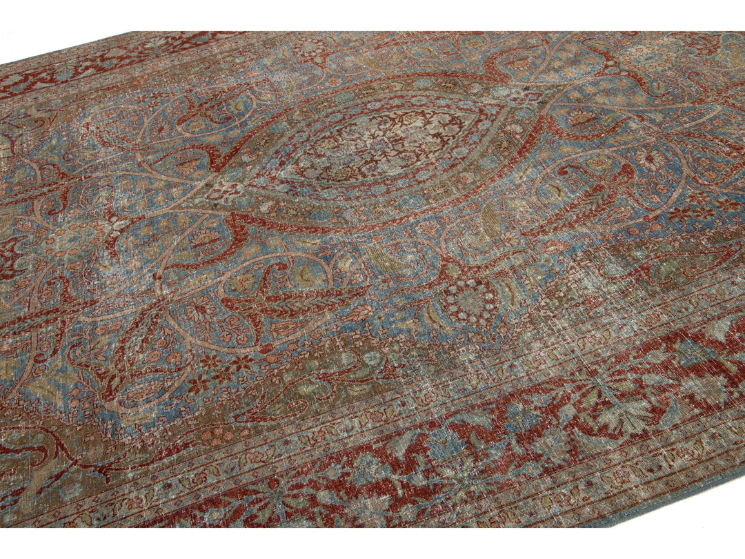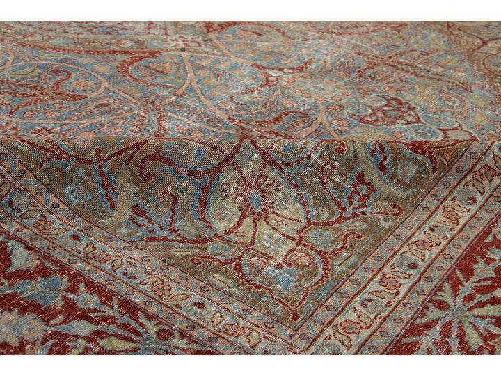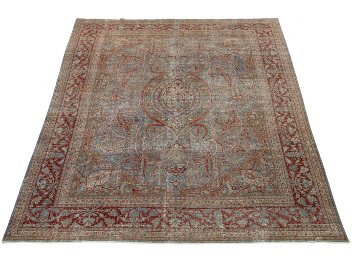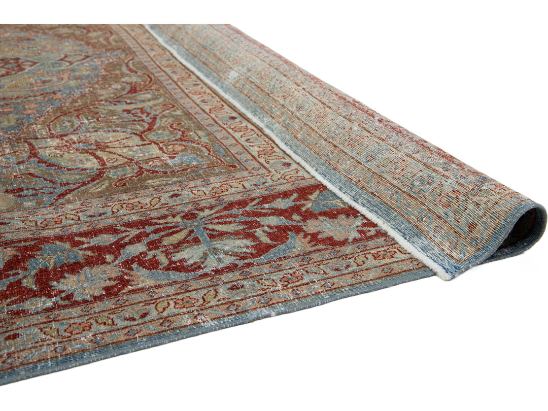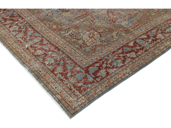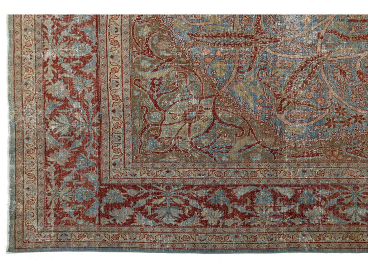 This antique Persian Tabriz rug from the 1910s features a stunning blue field decorated with an intricate floral pattern, highlighted by rich red and brown accents. This rug measures 8'1" x 11'8".
