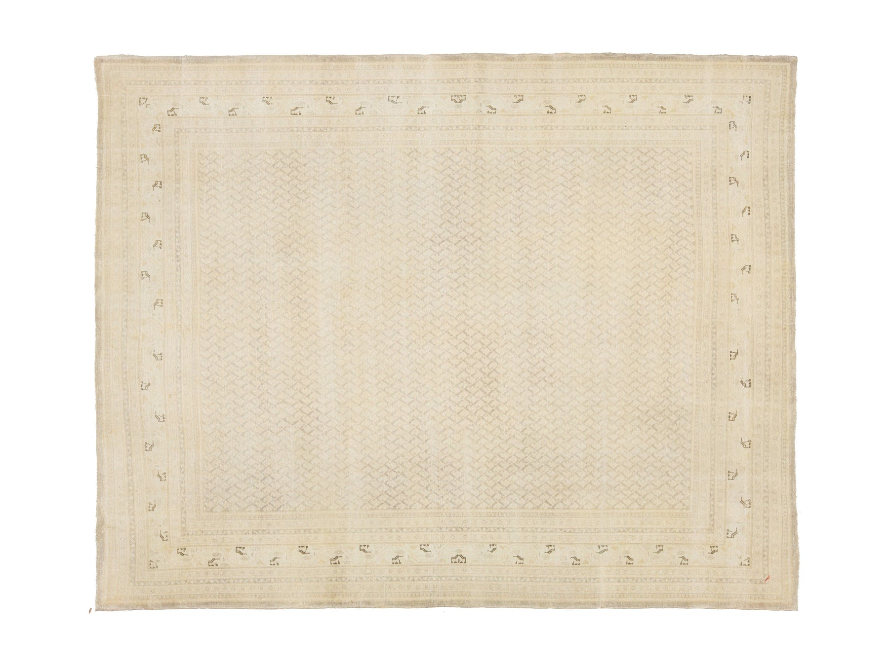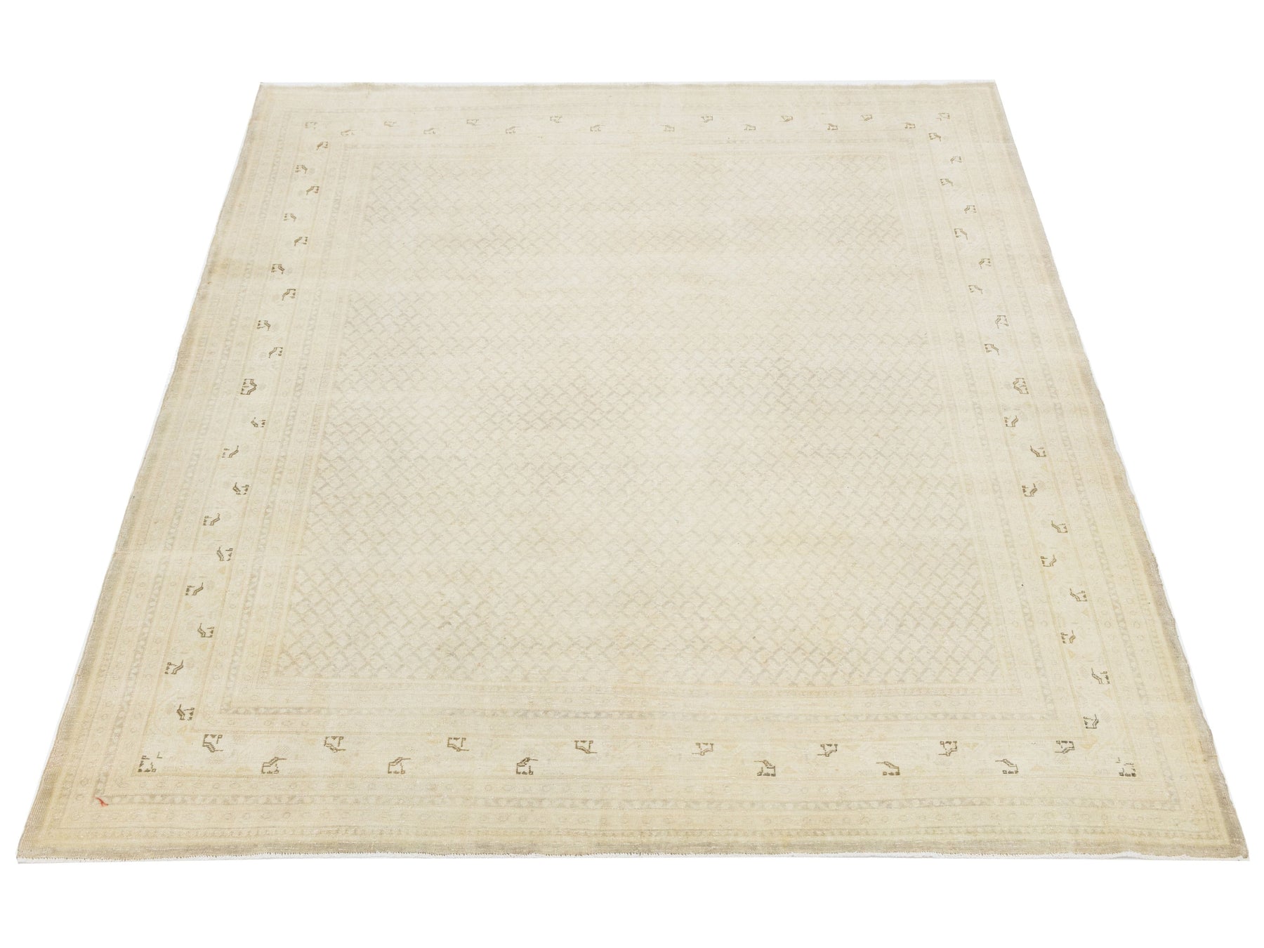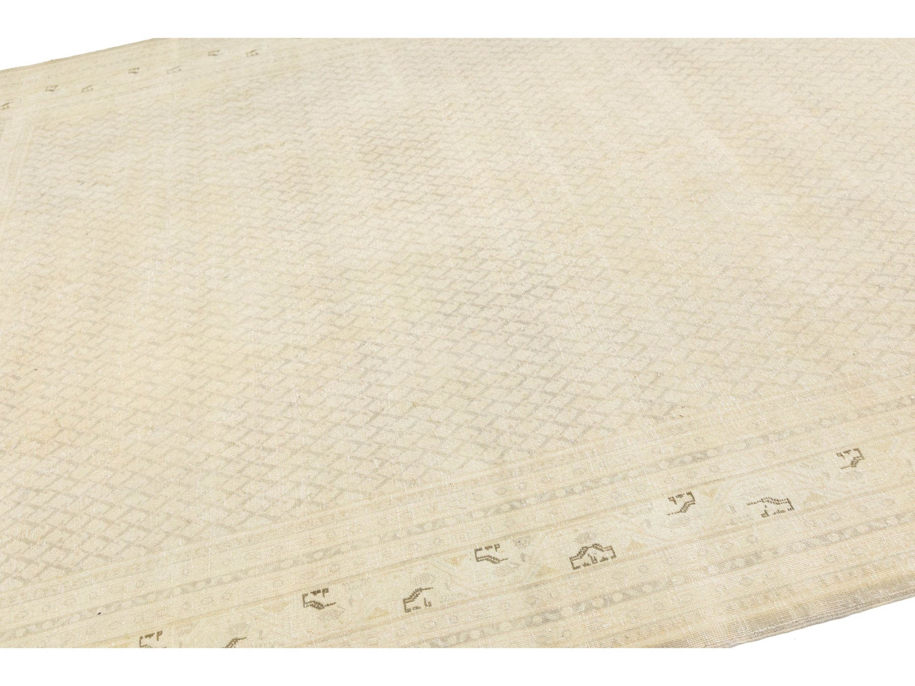Persian Tabriz rug features a refined lattice field framed by a delicate border of stylized floral motifs. Woven in soft ivory and beige tones, its understated palette and precise geometry evoke classical Persian elegance. Hand-knotted in fine wool, it showcases the craftsmanship and subtle artistry characteristic of Tabriz weaving. This rug measures 8' x 9'10".
