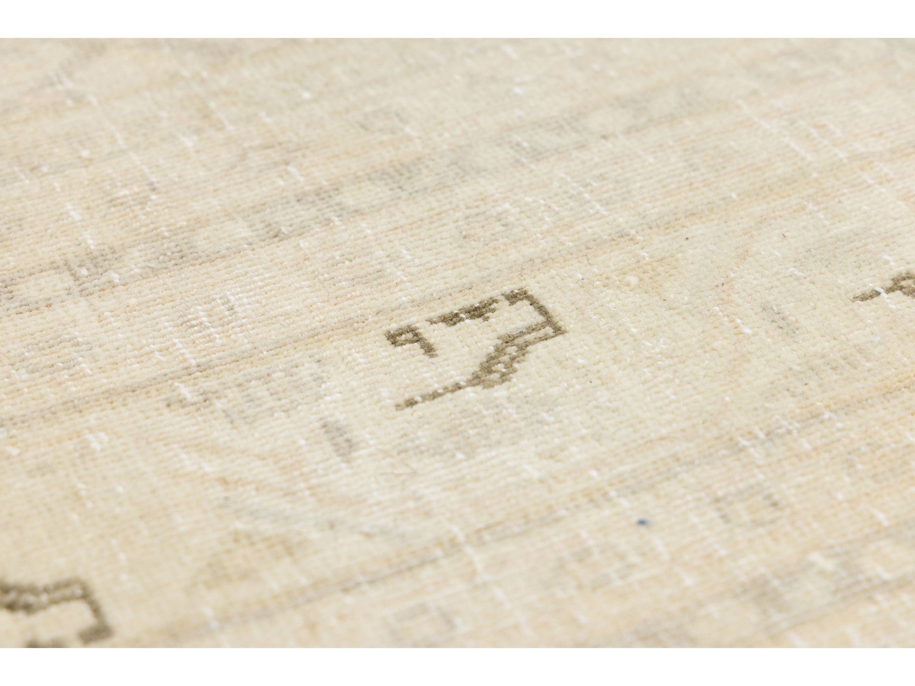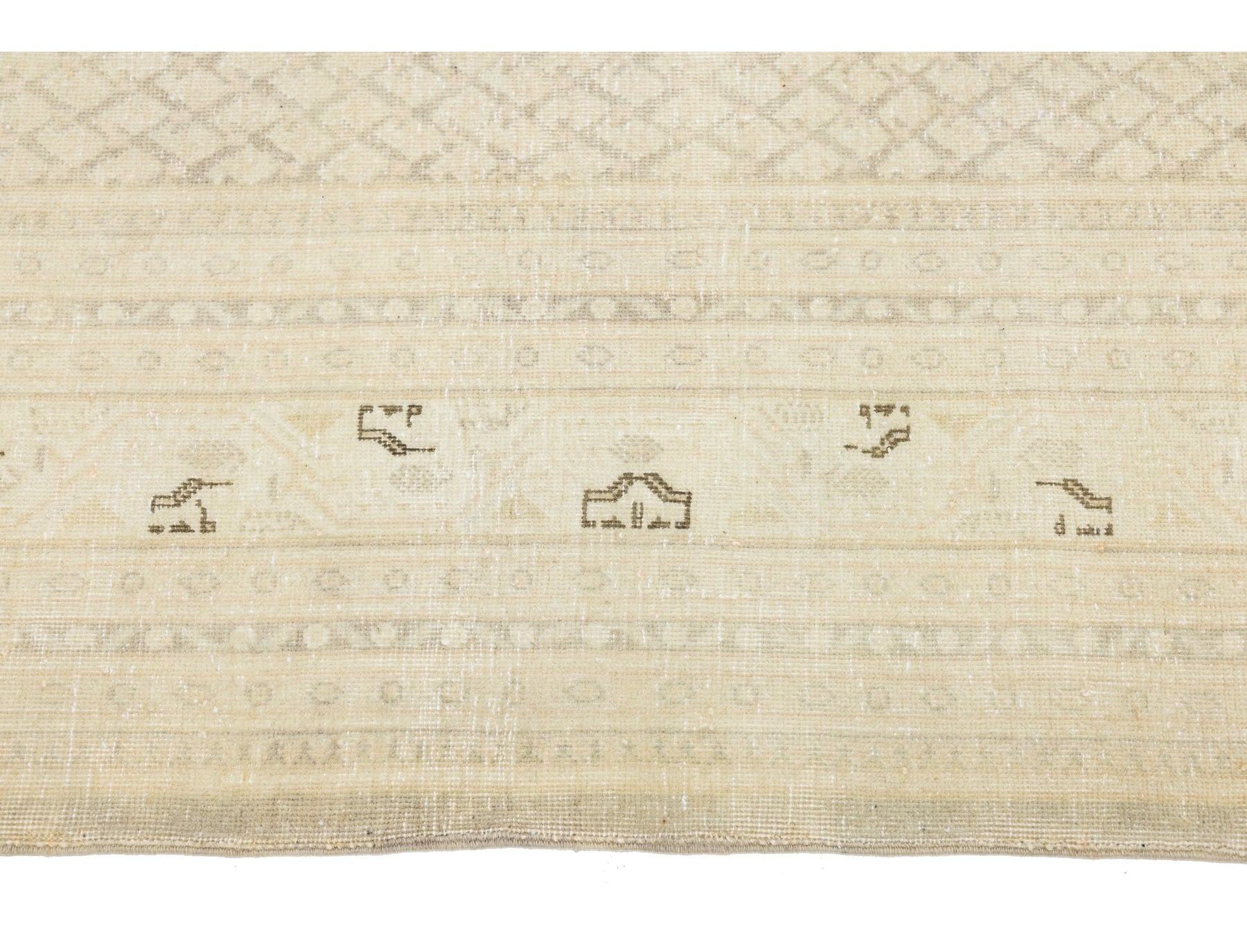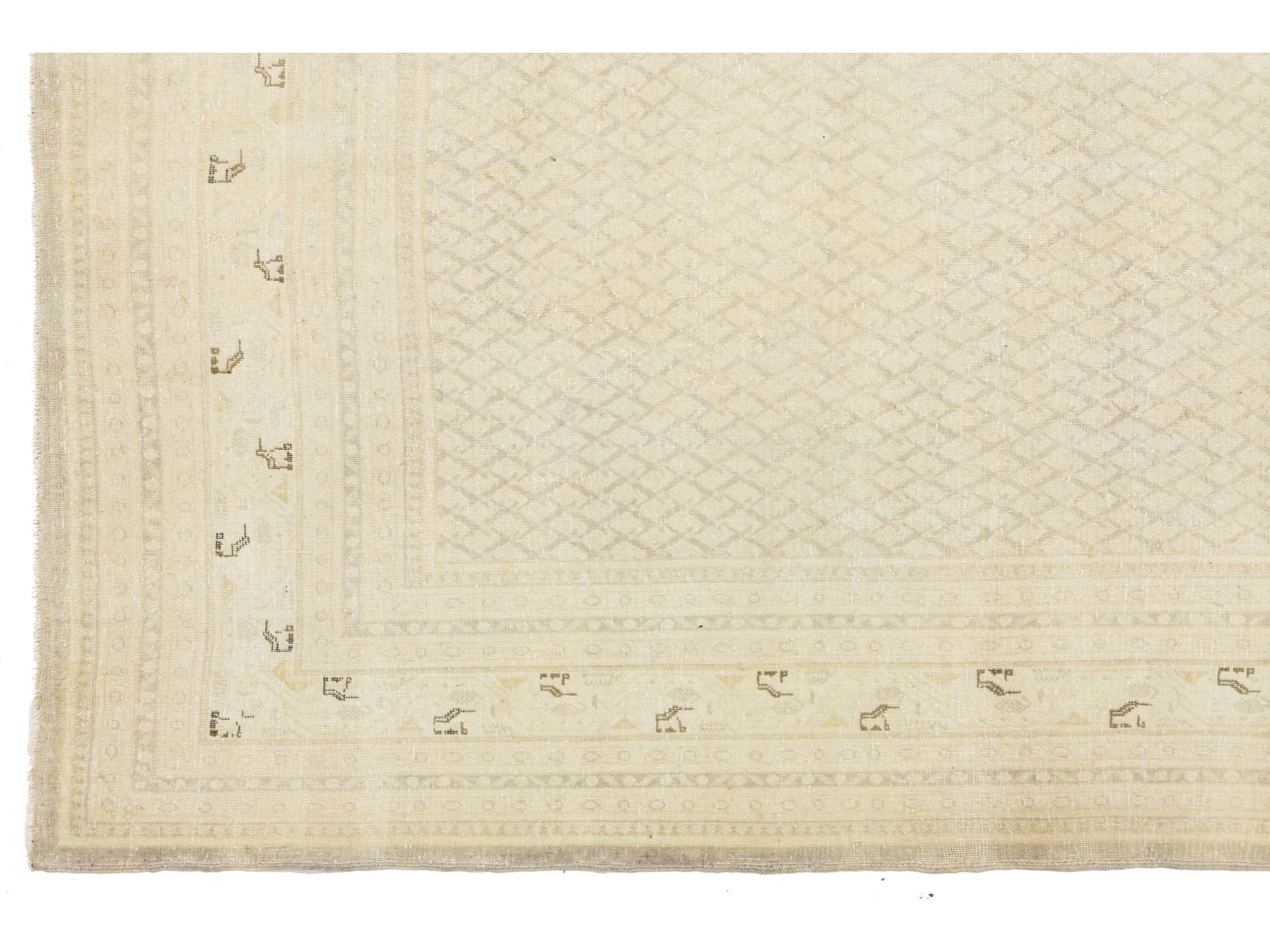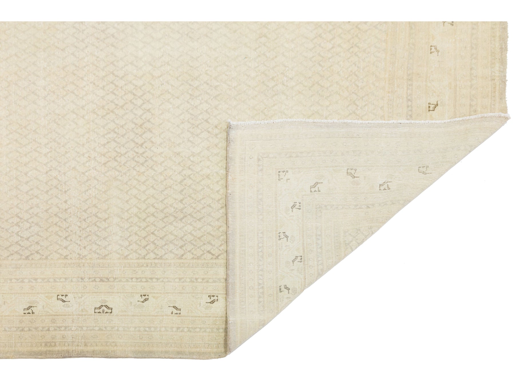 Persian Tabriz rug features a refined lattice field framed by a delicate border of stylized floral motifs. Woven in soft ivory and beige tones, its understated palette and precise geometry evoke classical Persian elegance. Hand-knotted in fine wool, it showcases the craftsmanship and subtle artistry characteristic of Tabriz weaving. This rug measures 8' x 9'10".