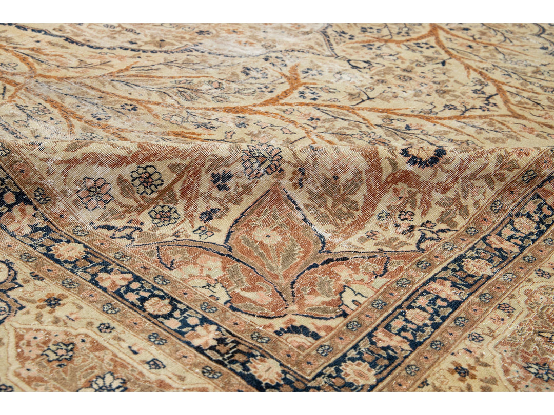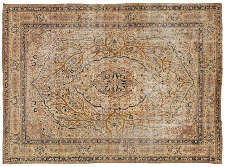 This Persian Tabriz wool rug is beautifully hand-knotted and displays a classic floral pattern on a tan-beige background, accentuating the design's peach, orange, and navy blue shades. This rug measures 9'5" x 12'11'.