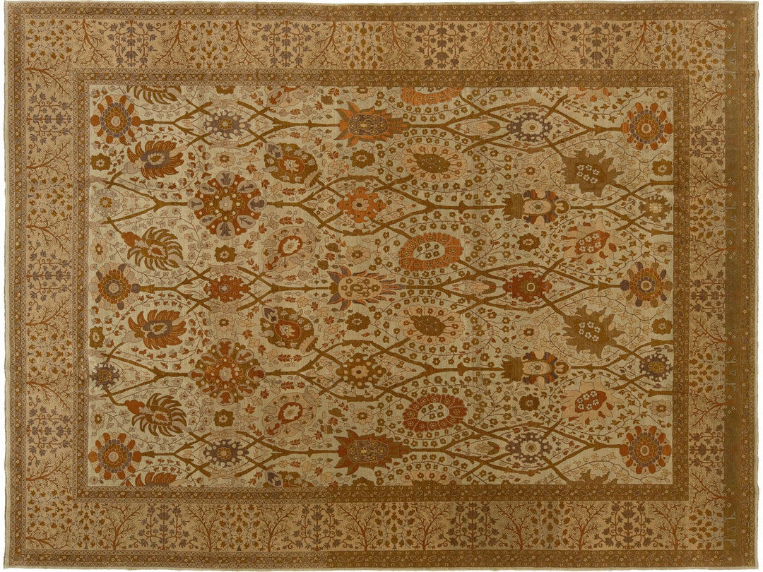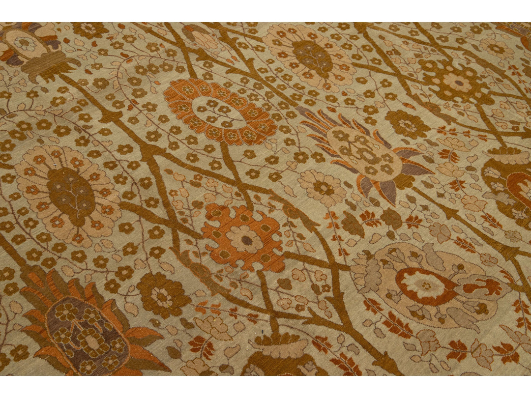 This wool rug is a Persian Tabriz with a classic all-over floral pattern. The beige background contrasts the design, which features shades of orange rust, yellow, purple, and brown. This rug measures 9'1" x 12'1''.
