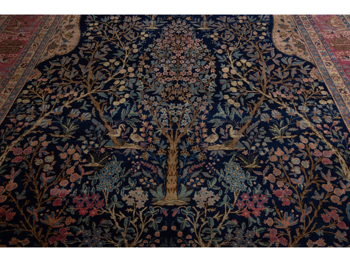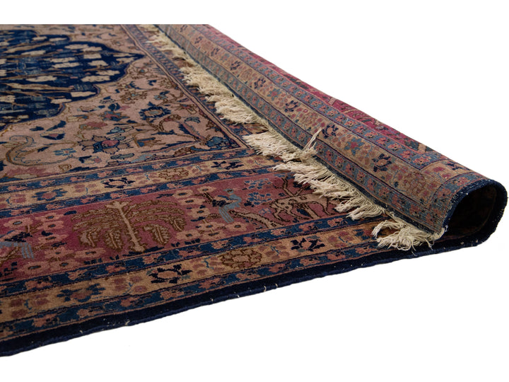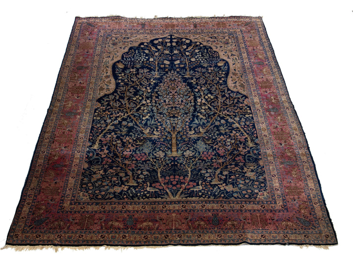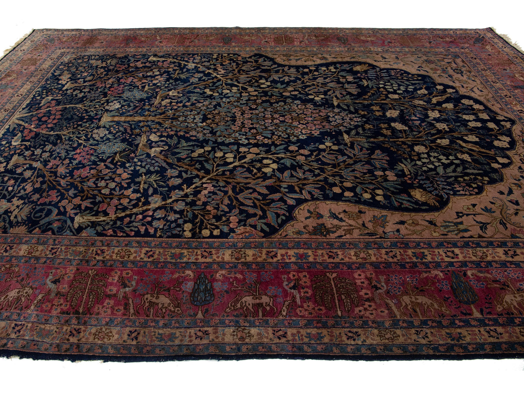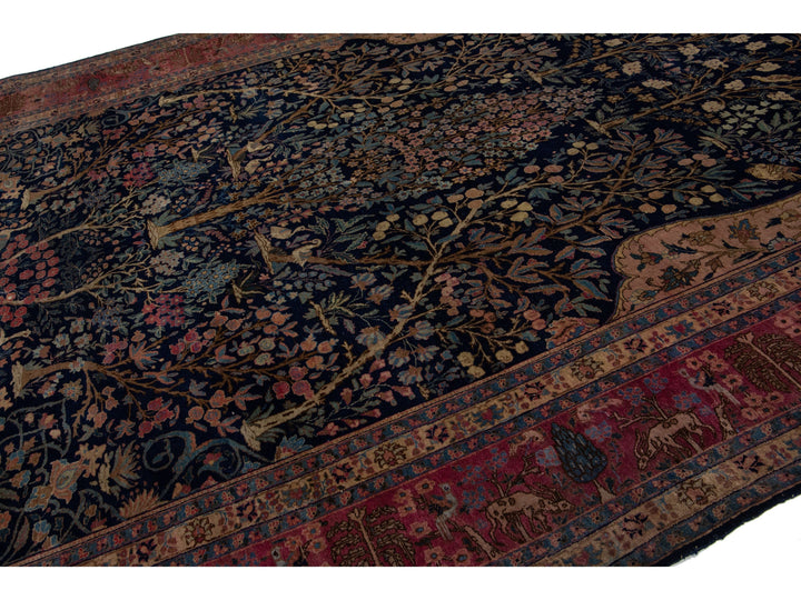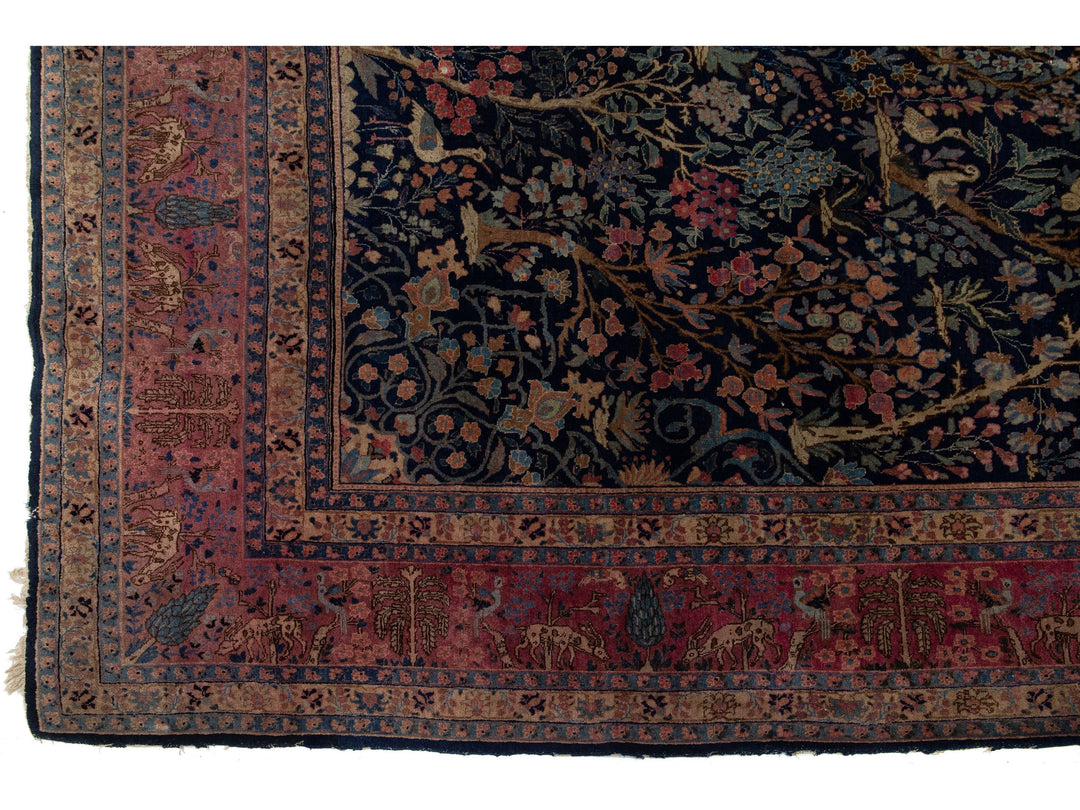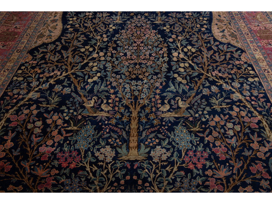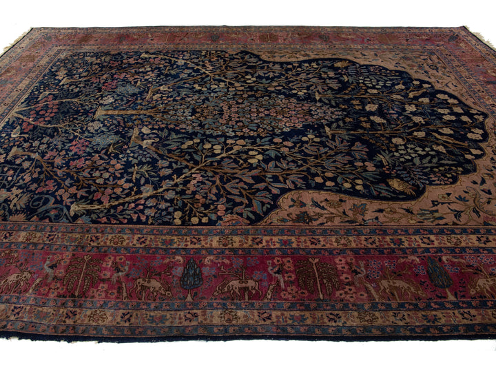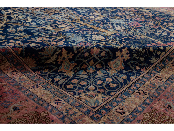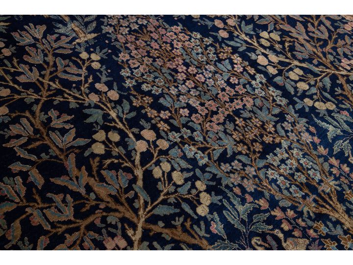This Persian Tabriz wool rug is handcrafted with a classic all-over floral pattern. The navy blue background contrasts the design, which features shades of purple, light blue, and brown. This rug measures 9'3" x 13'3''.