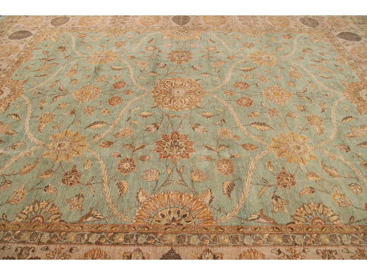 This Tabriz-style wool rug boasts a splendidly intricate floral design, classically presented in a green color field, featuring golden, beige, and brown accents.