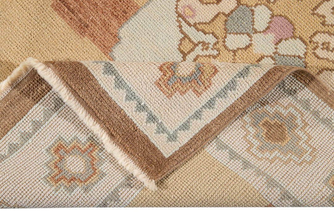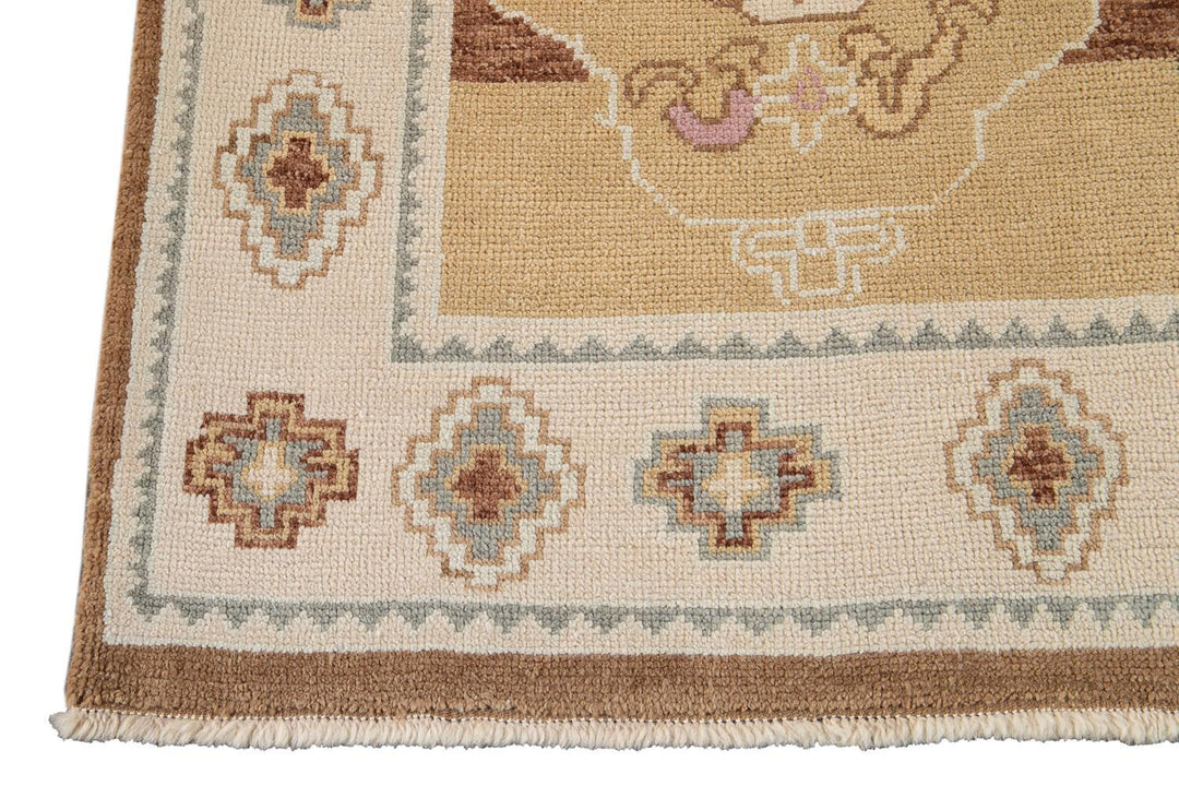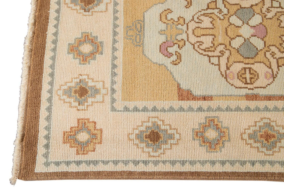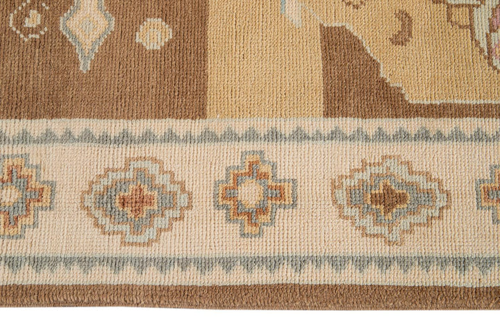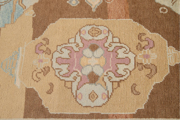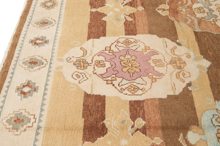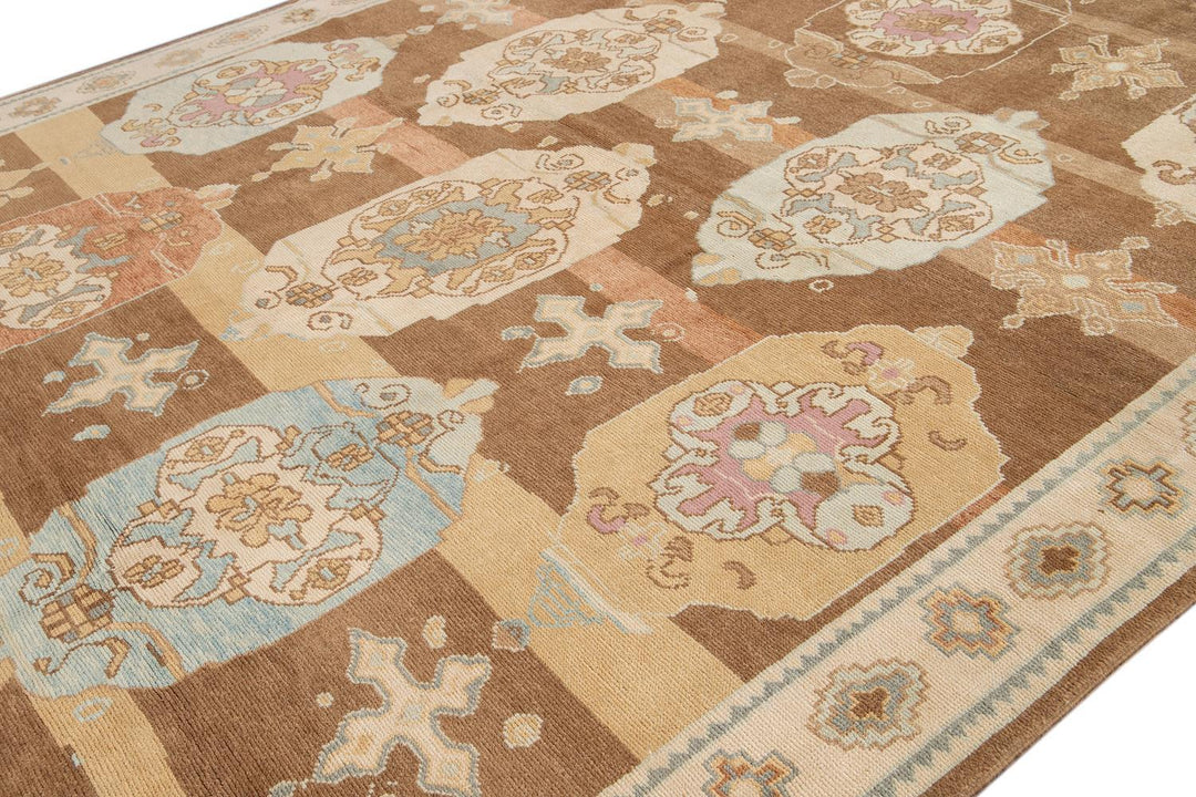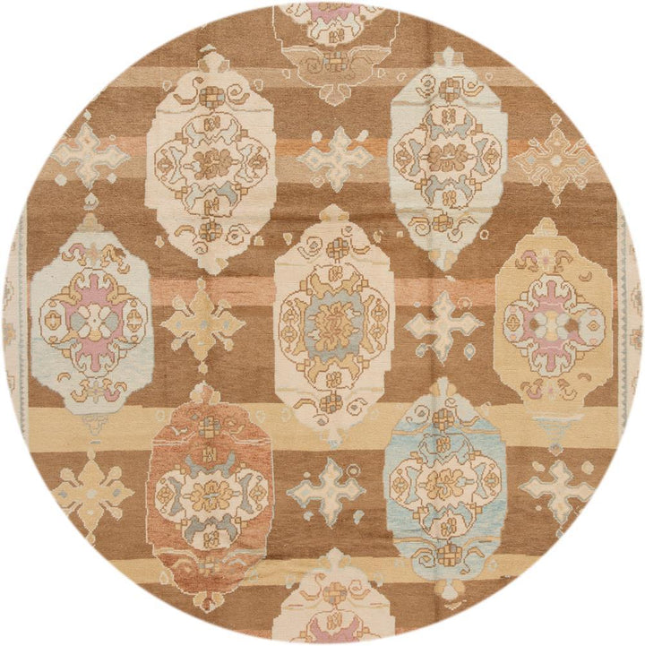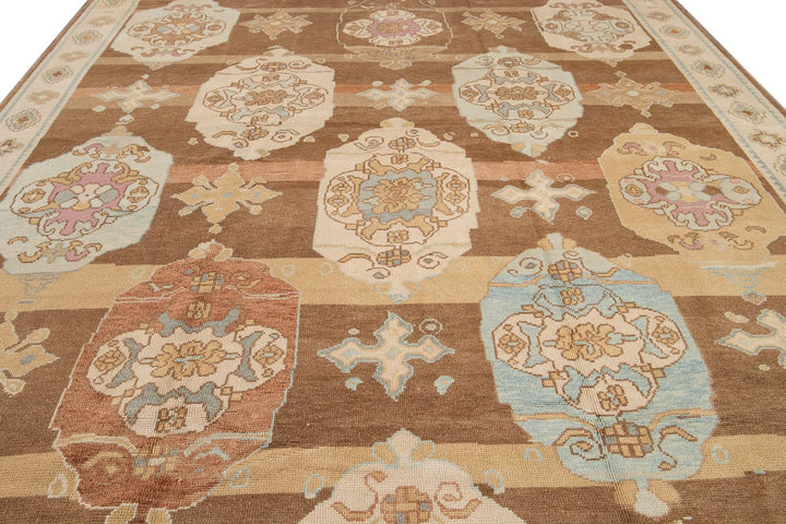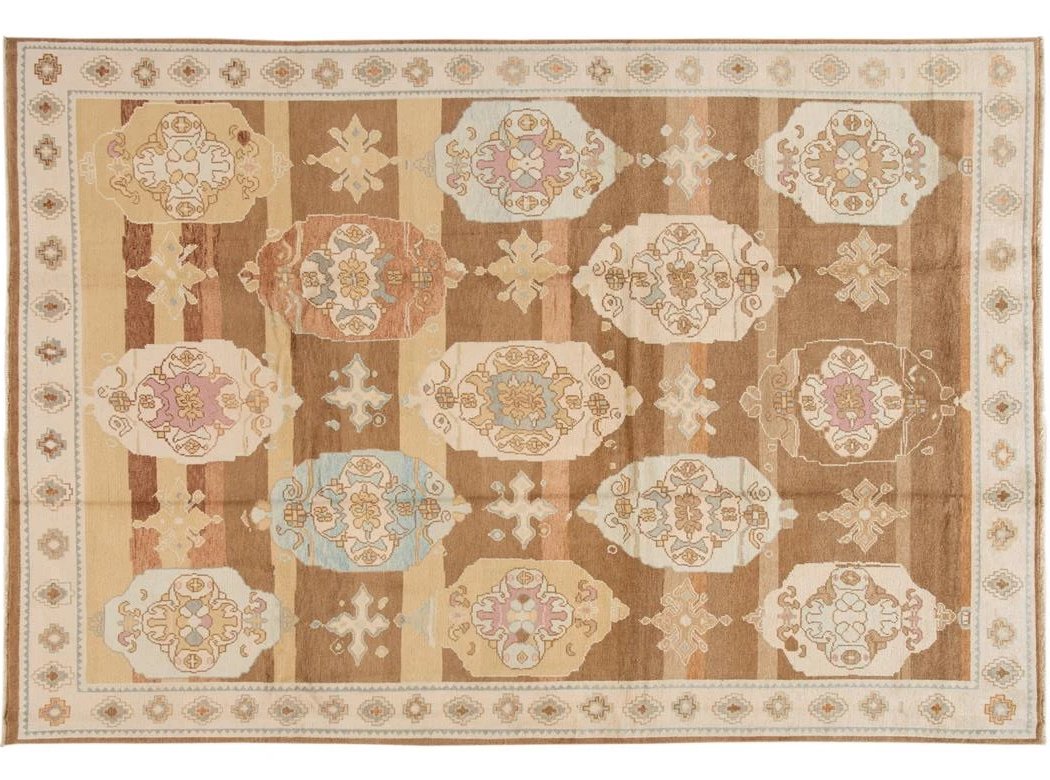 Beautiful contemporary Turkish Kars rug, hand knotted wool with an ivory frame and brown field, multi-color accents in a multi medallion design.