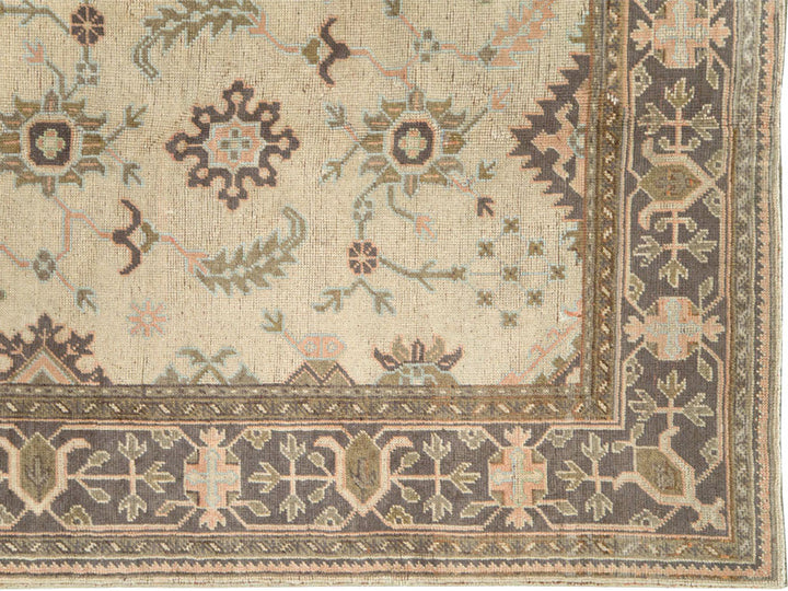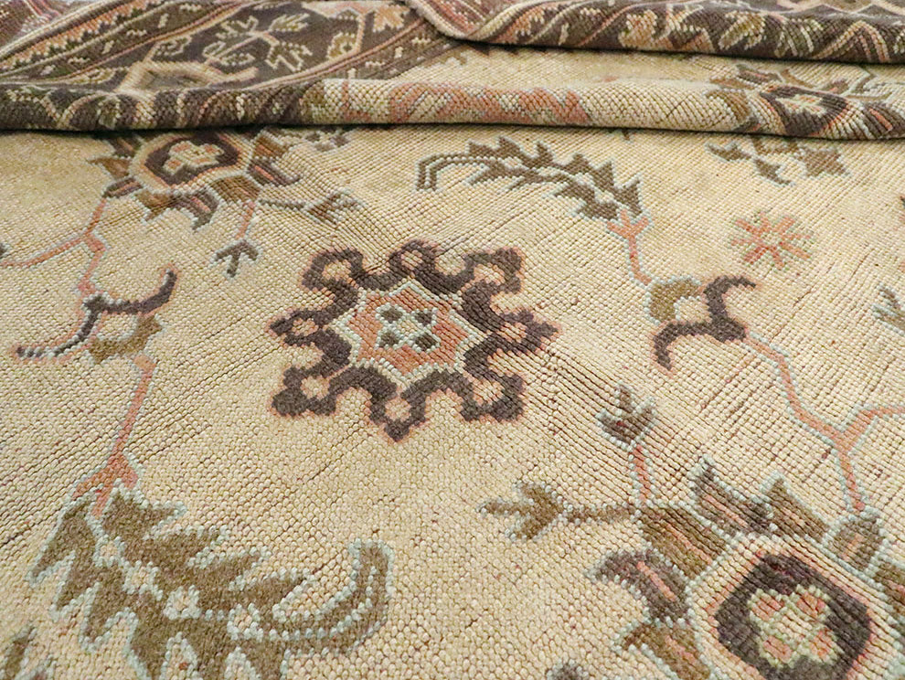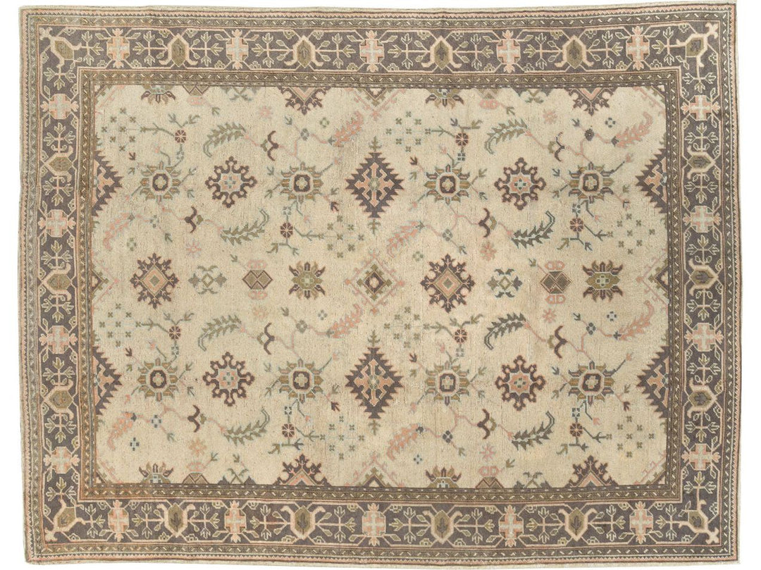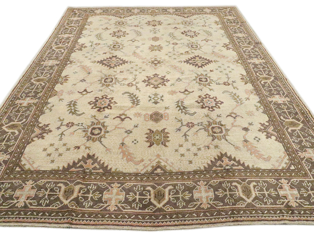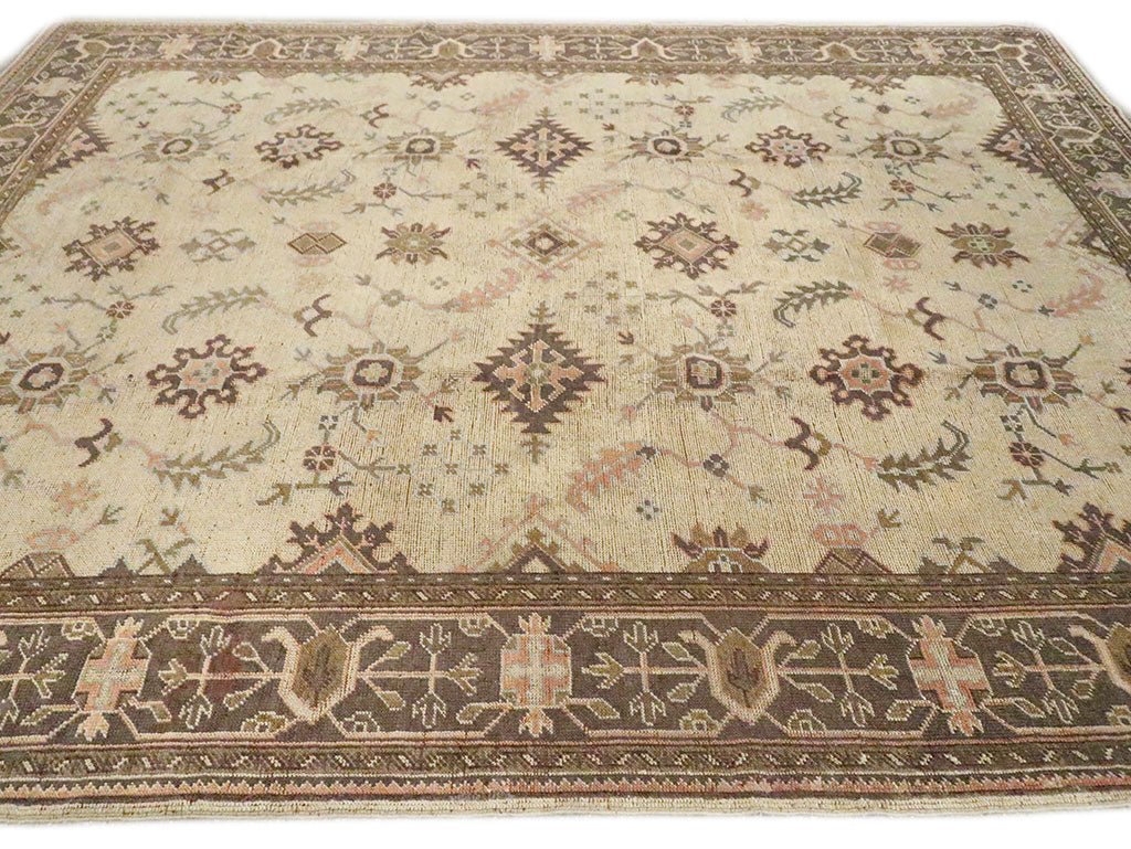 Indulge in the timeless luxury of this Antique Oushak Wool Rug, measuring a grand 9' 1" x 11' 9".