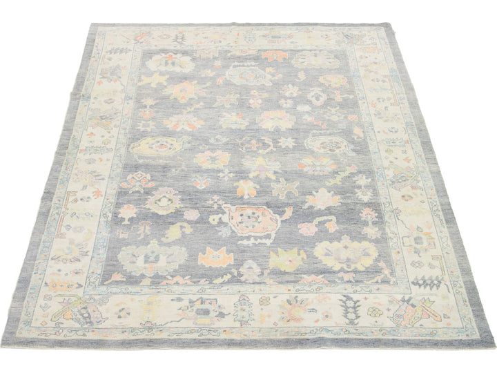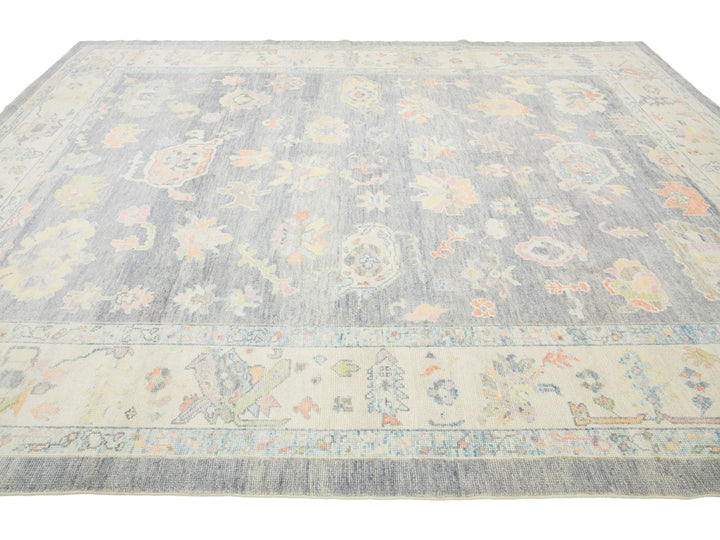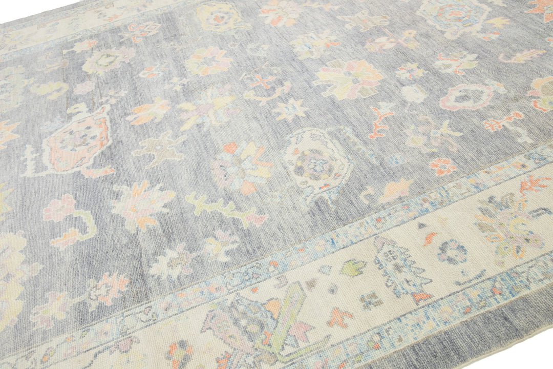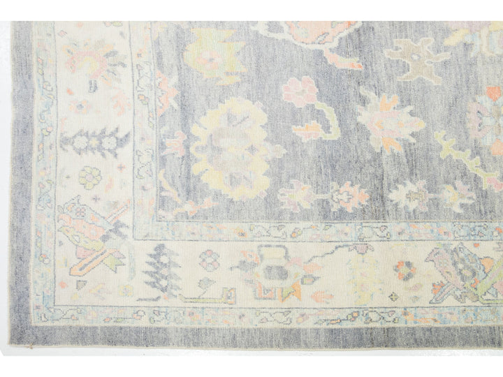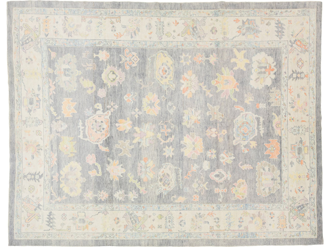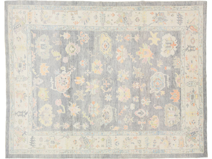 This modern Turkish hand-knotted wool rug boldly presents a gray backdrop with a captivating multicolored floral pattern. This rug measures 10'2" x 13'.