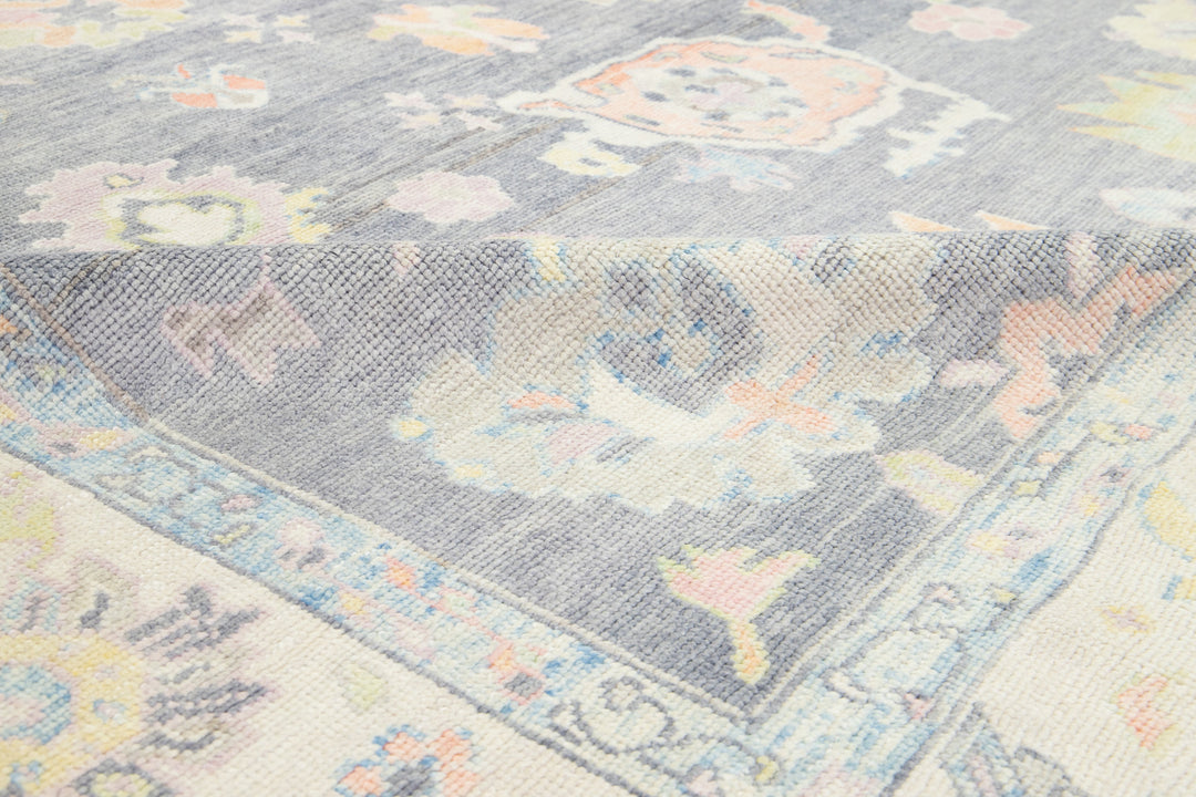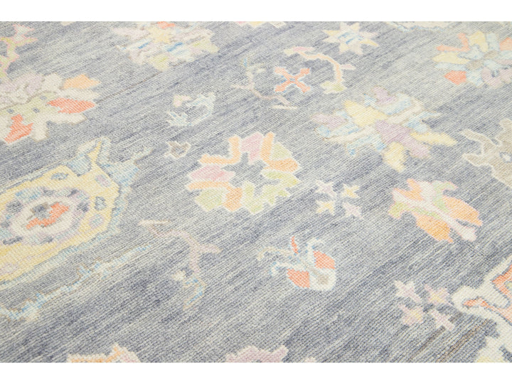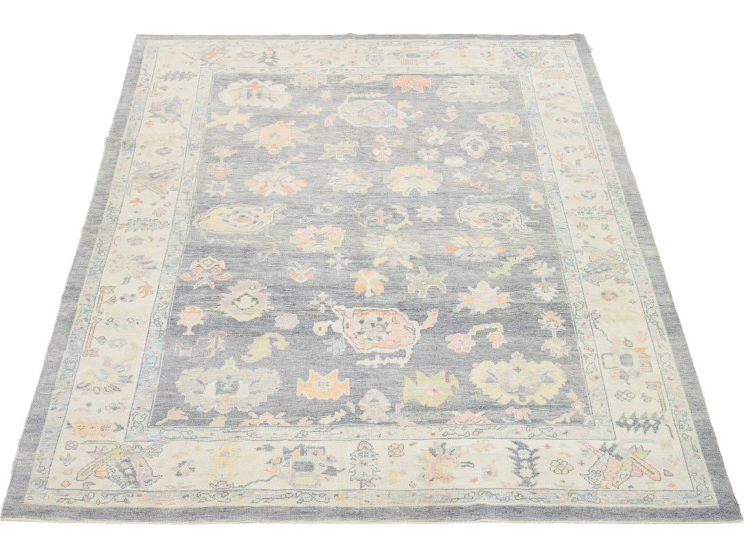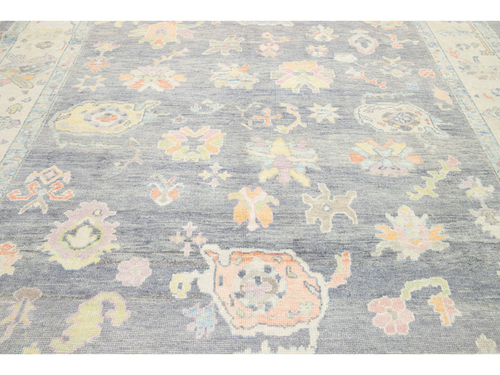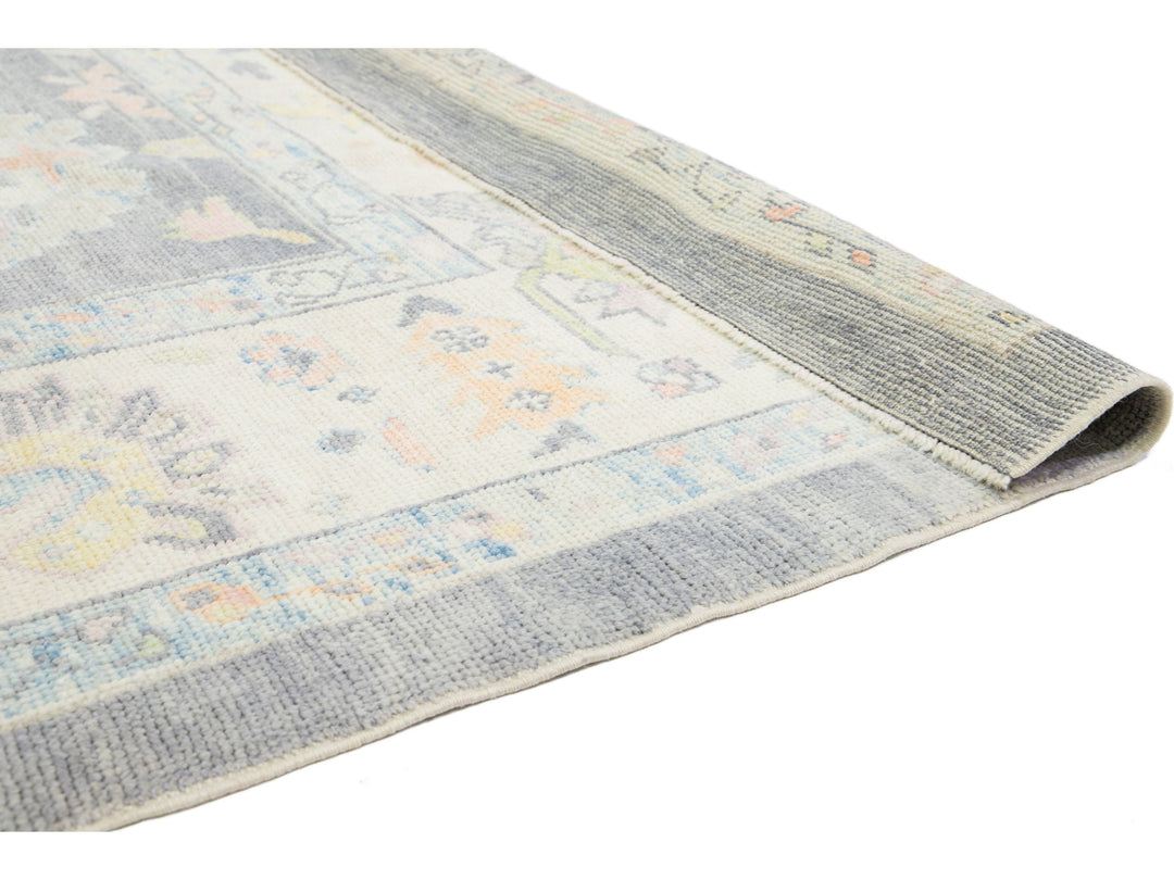 This modern Turkish hand-knotted wool rug boldly presents a gray backdrop with a captivating multicolored floral pattern. This rug measures 10'2" x 13'.