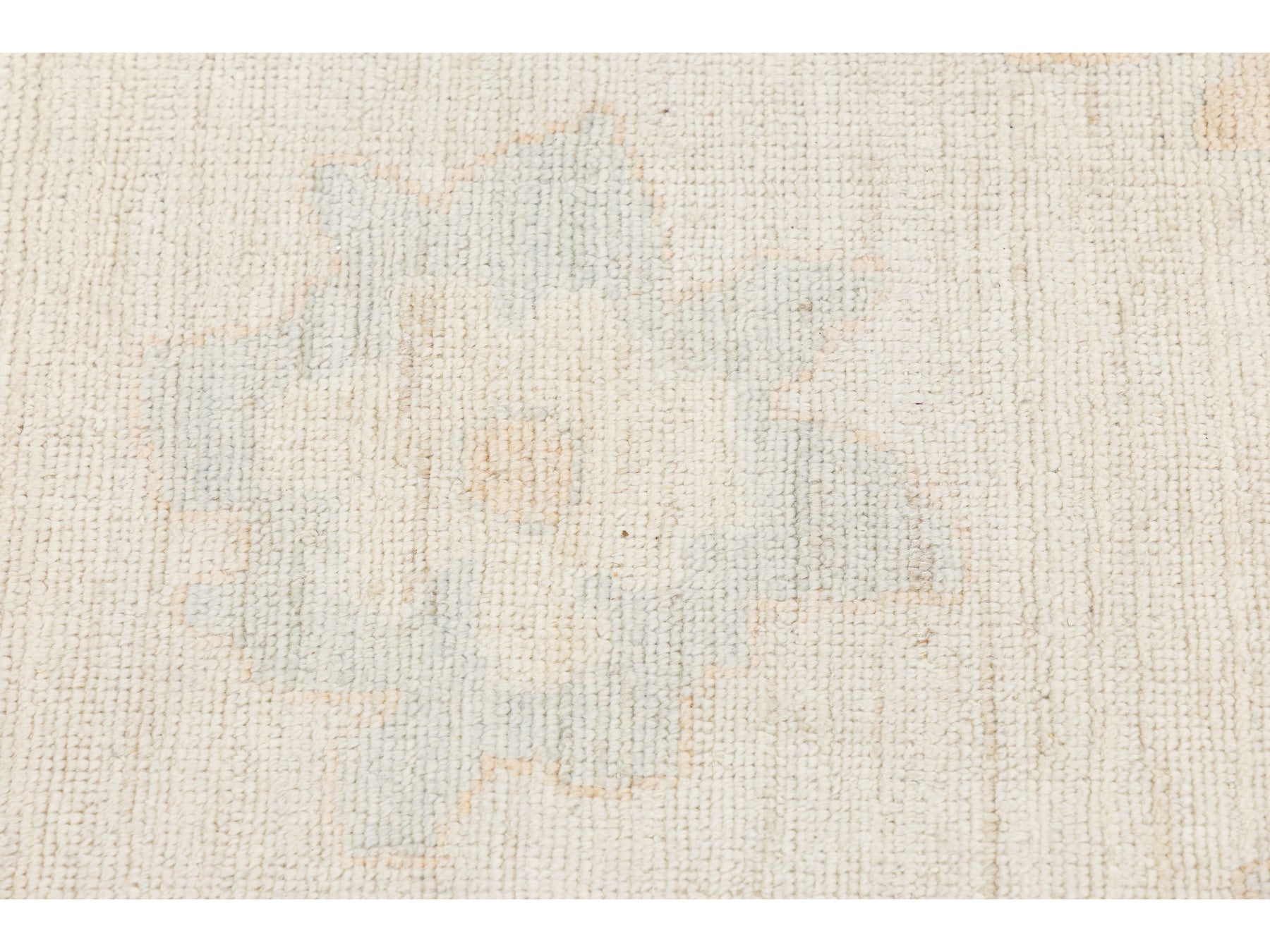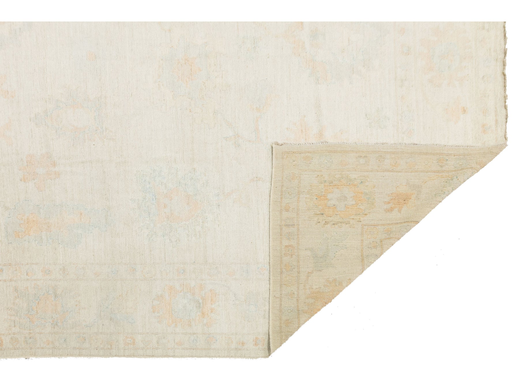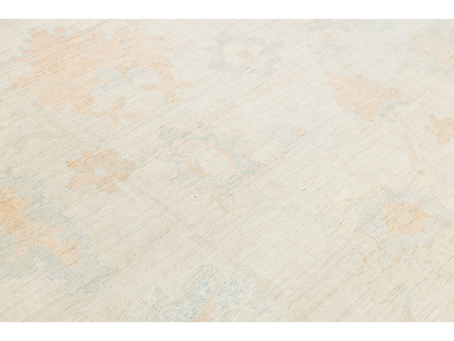 This exquisite hand-knotted wool rug reimagines traditional Turkish Oushak artistry for the modern home. Featuring a luminous ivory field, the design is punctuated by oversized, ethereal palmettes and floral motifs in soft shades of muted sage green, apricot, and sandy gold. Crafted with a premium wool pile, the rug boasts a subtle distressed patina and a low-contrast finish, creating a serene, sophisticated foundation for any interior. Its versatile palette bridges the gap between classic elegance and coastal or farmhouse chic. This rug measures 10'2" x 14'.