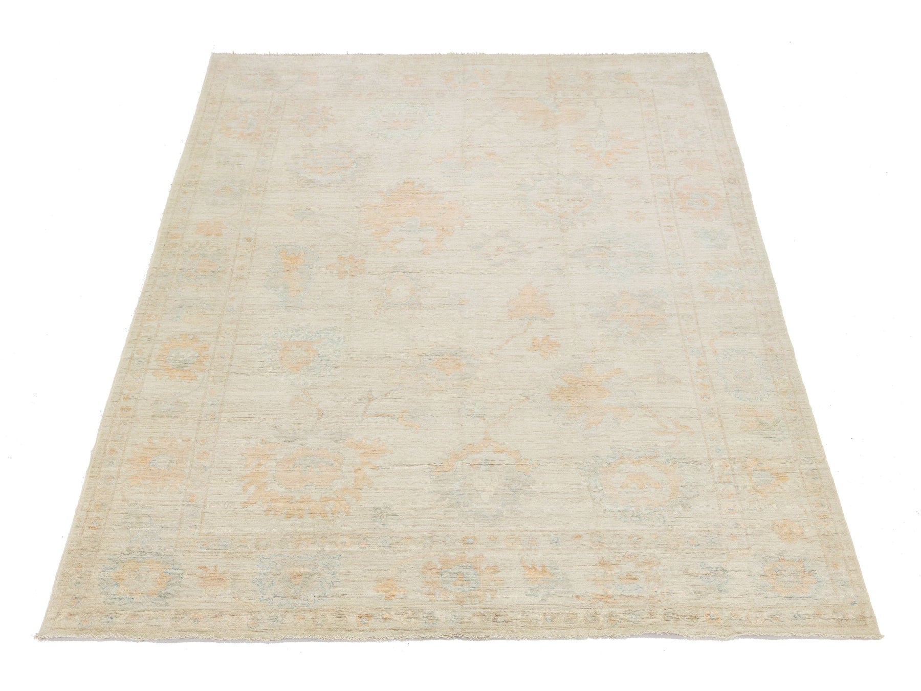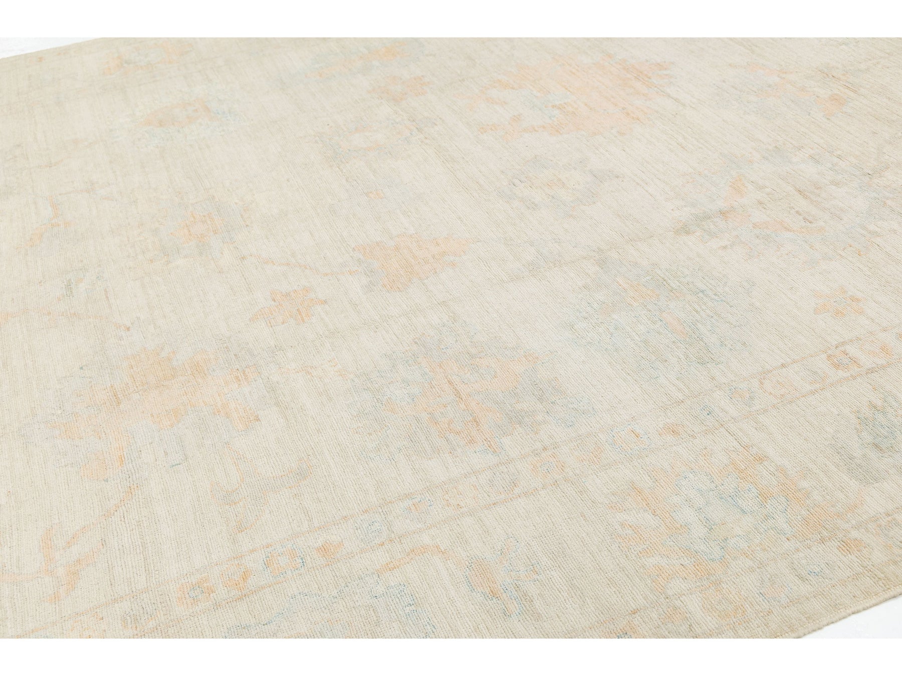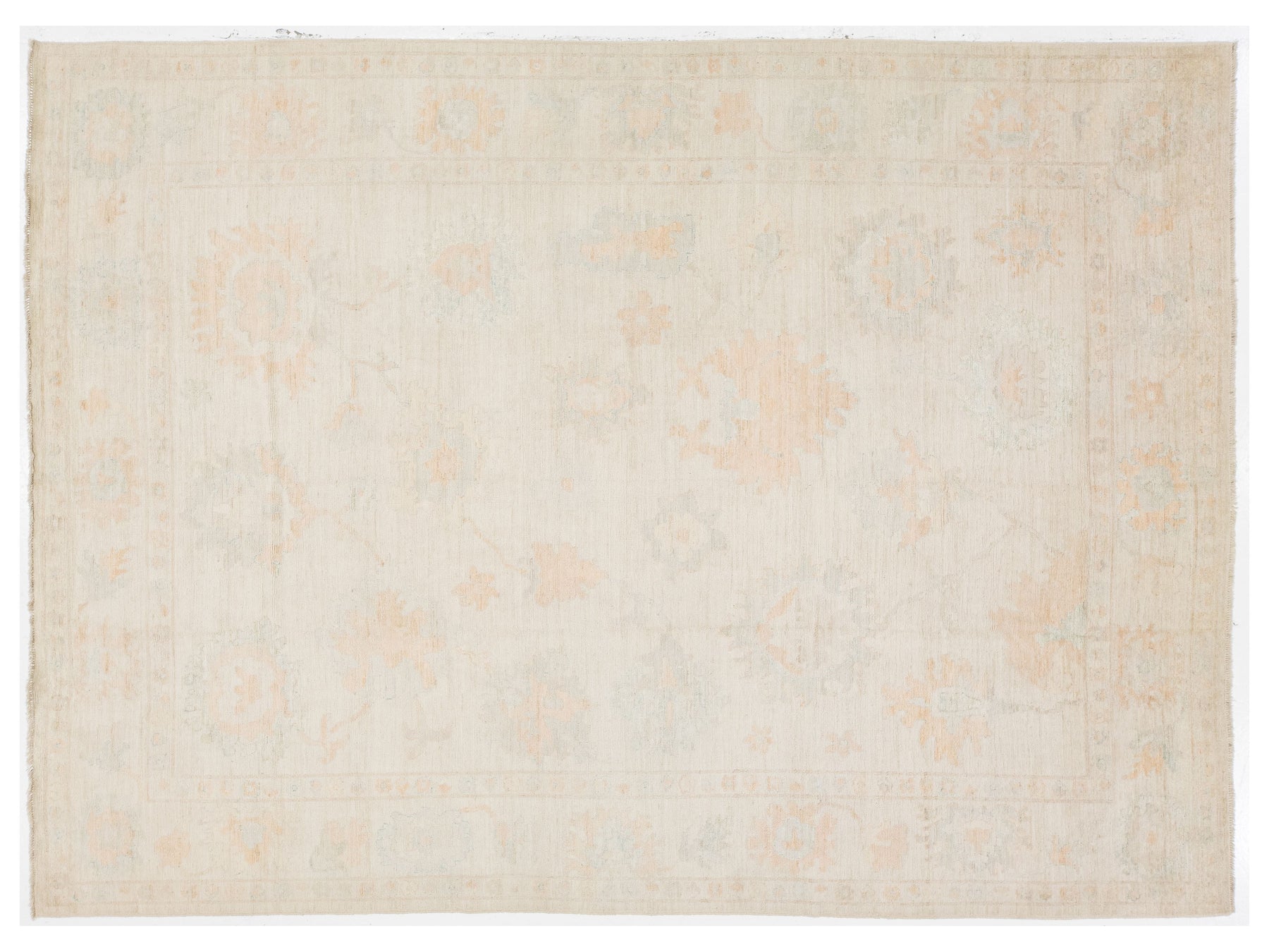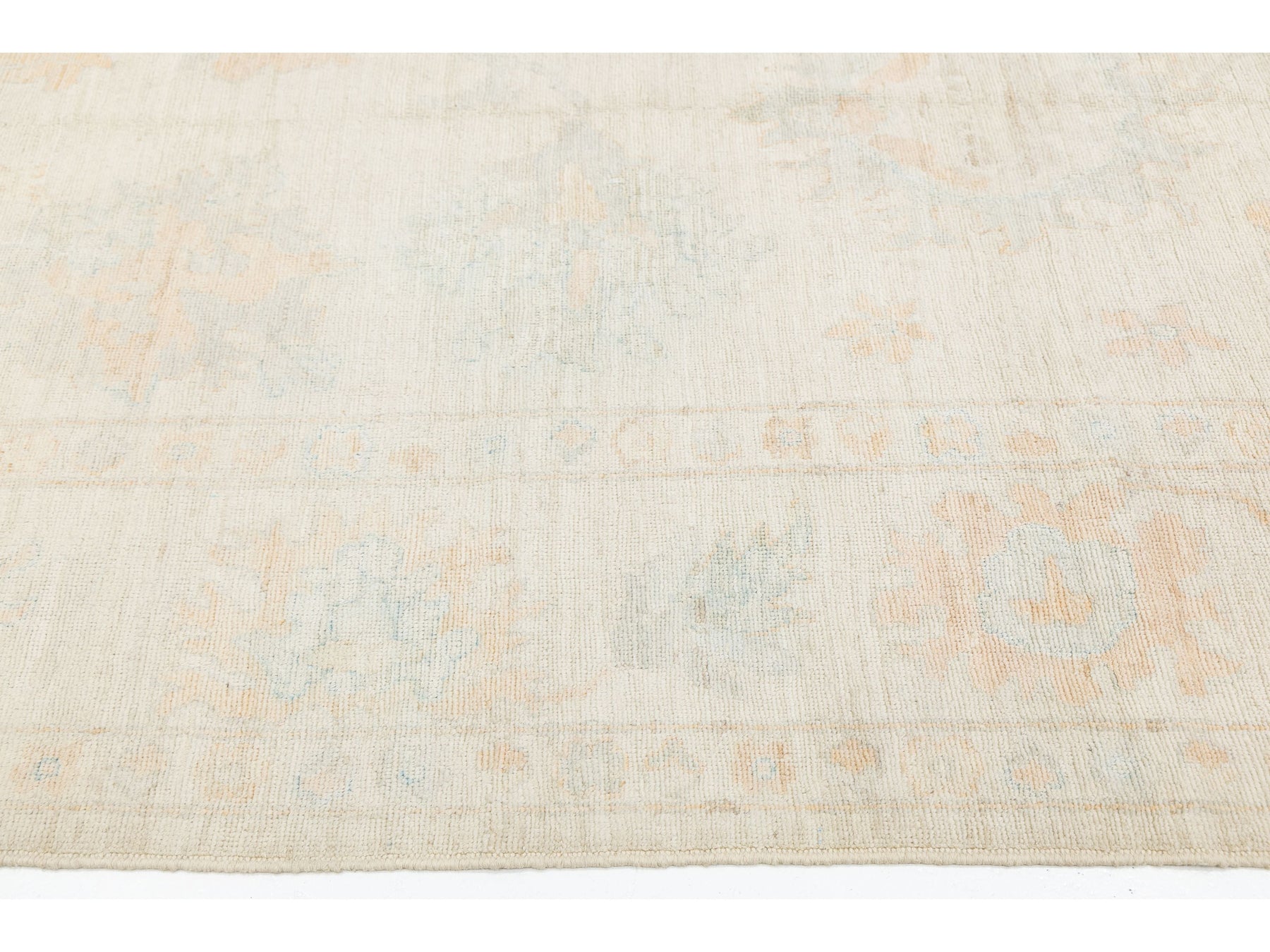 This exquisite hand-knotted wool rug reimagines traditional Turkish Oushak artistry for the modern home. Featuring a luminous ivory field, the design is punctuated by oversized, ethereal palmettes and floral motifs in soft shades of muted sage green, apricot, and sandy gold. Crafted with a premium wool pile, the rug boasts a subtle distressed patina and a low-contrast finish, creating a serene, sophisticated foundation for any interior. Its versatile palette bridges the gap between classic elegance and coastal or farmhouse chic. This rug measures 10'2" x 14'.