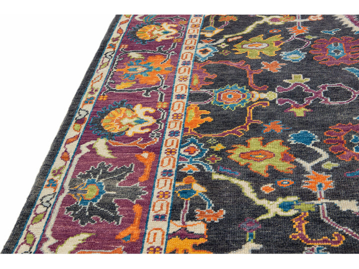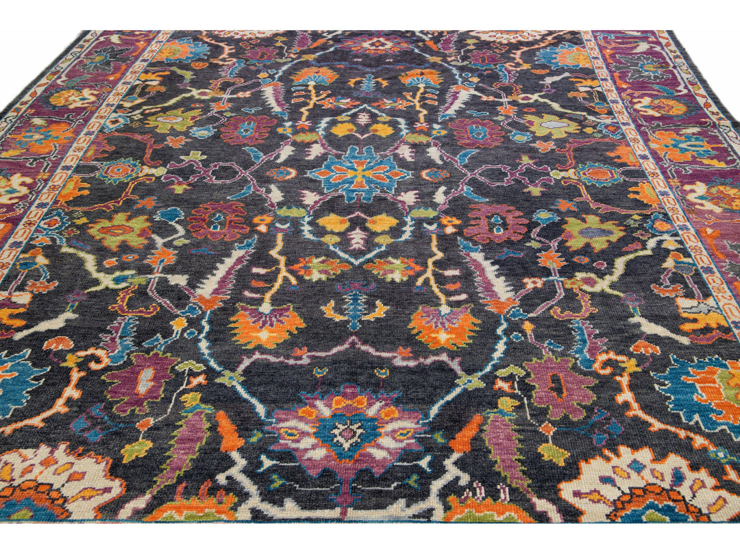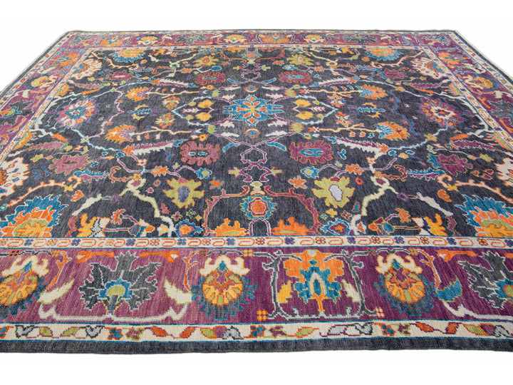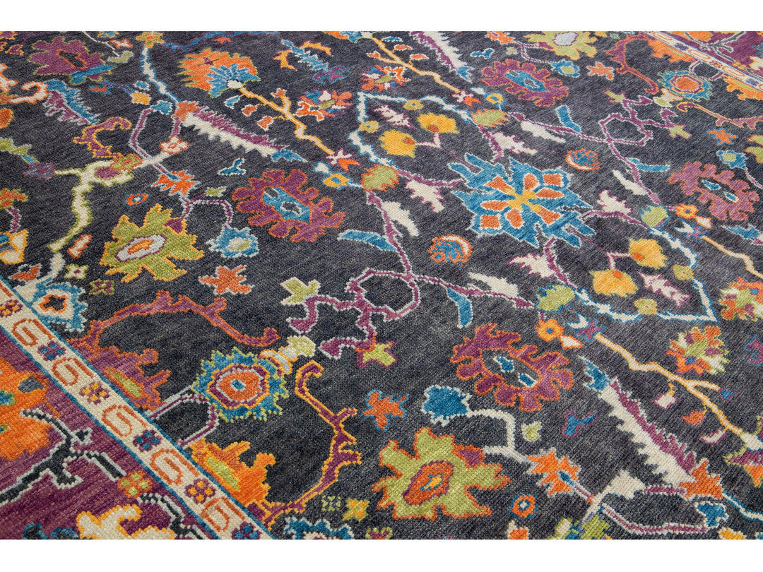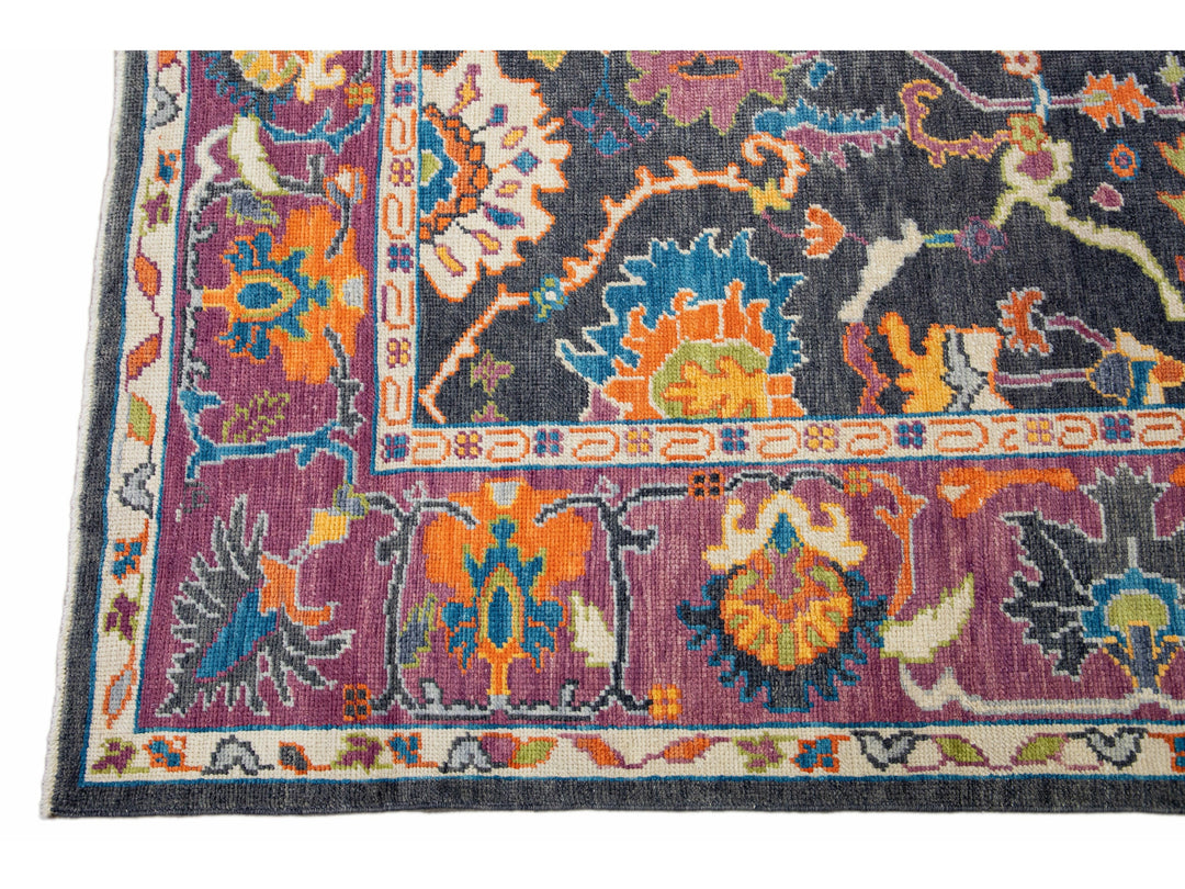 Beautiful modern Oushak hand-knotted wool rug with a grey field. This piece has a purple-designed frame and multicolor accents that feature a gorgeous all-over floral design.