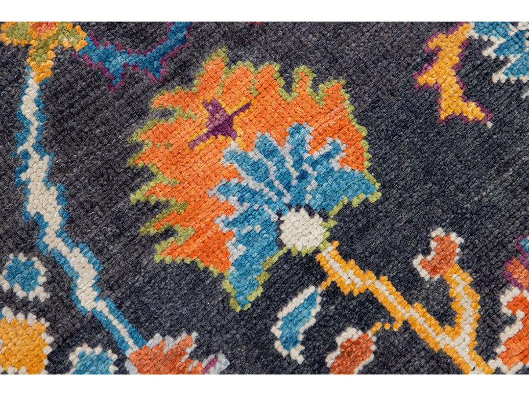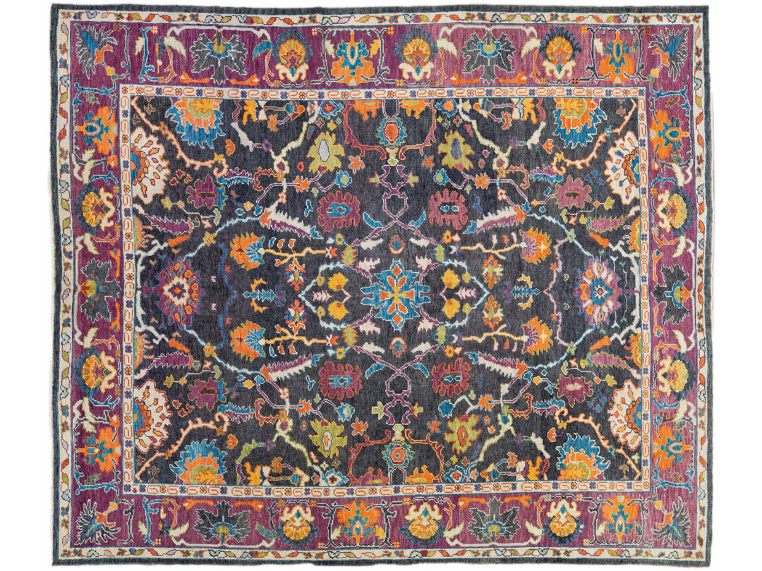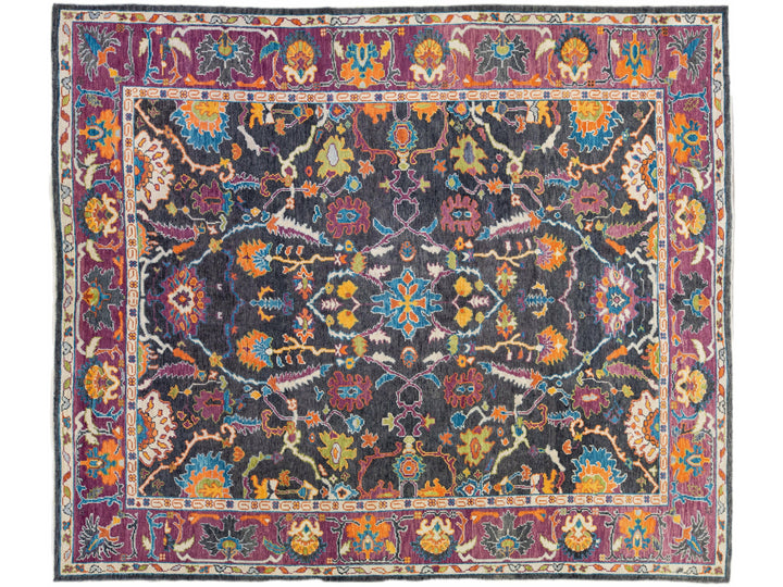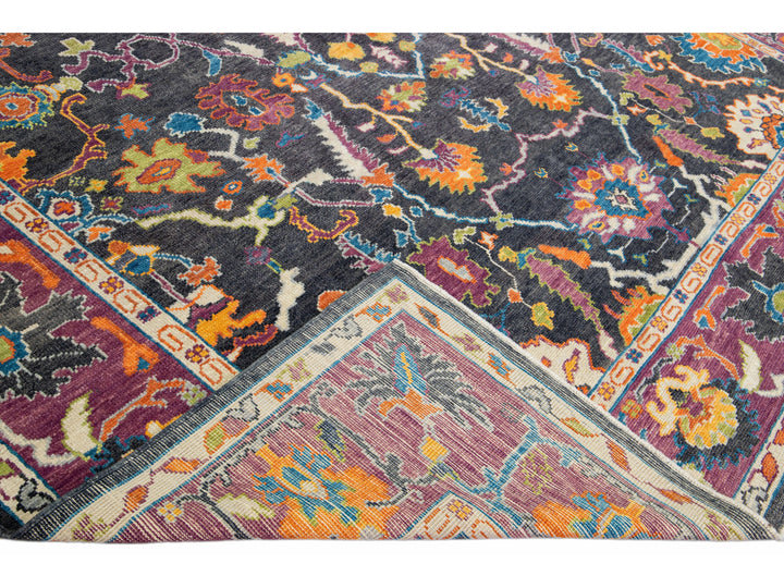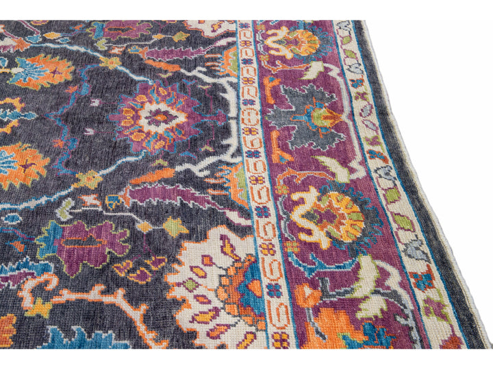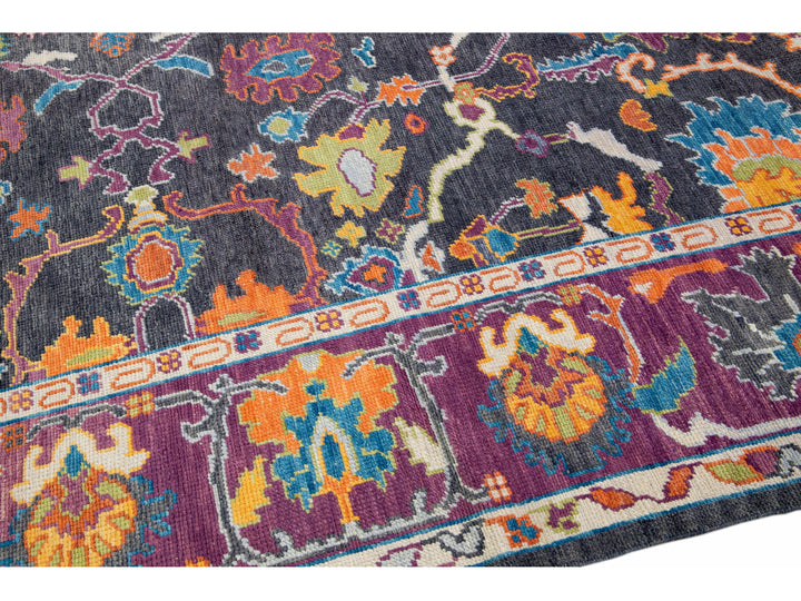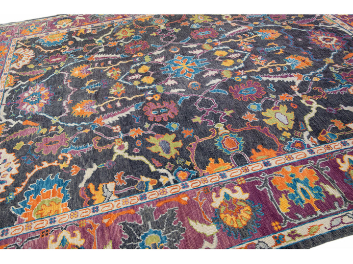 Beautiful modern Oushak hand-knotted wool rug with a grey field. This piece has a purple-designed frame and multicolor accents that feature a gorgeous all-over floral design.