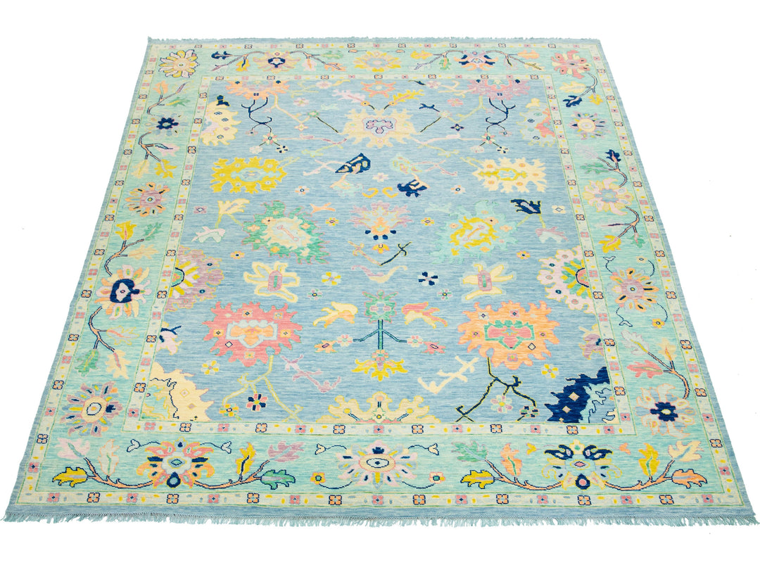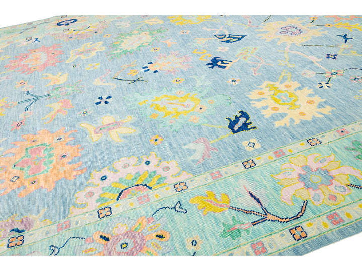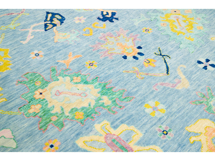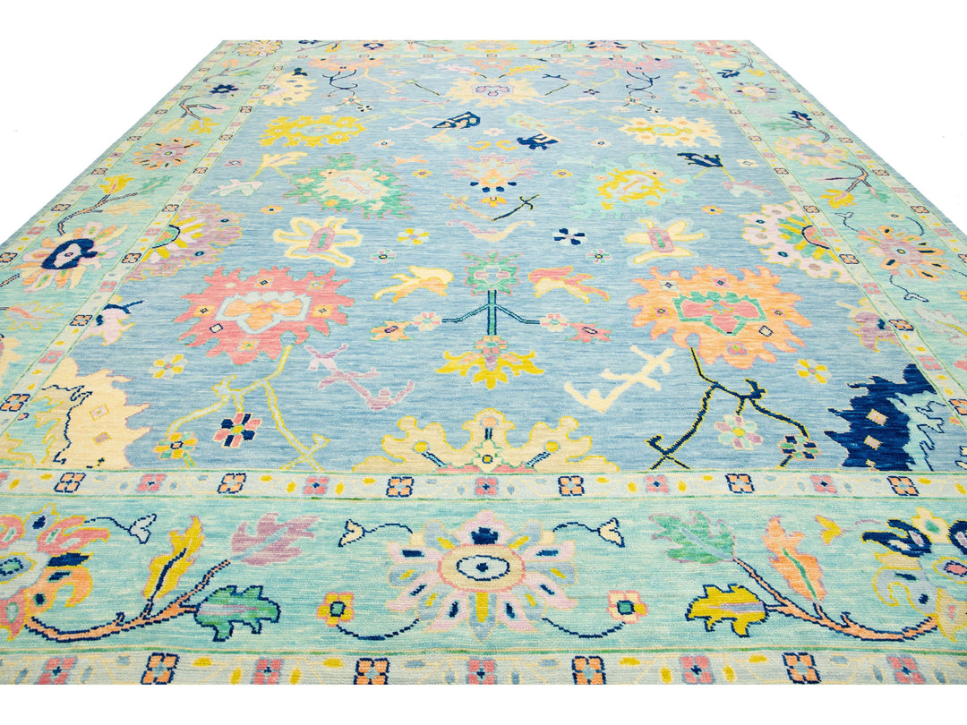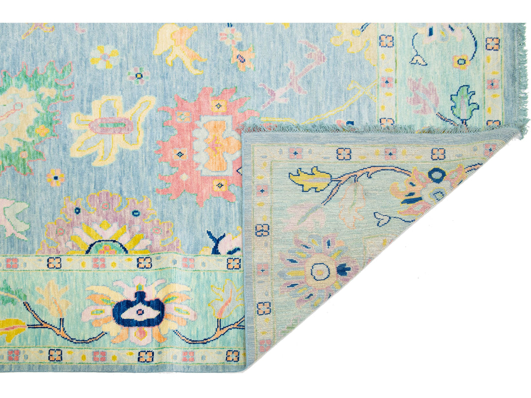 This modern Oushak-style wool rug beautifully blends contemporary design with the timeless charm of traditional Oushak craftsmanship. It showcases a striking blue background framed by a light green border, while the vibrant floral patterns in an array of lively colors truly capture the eye and make a bold statement. This rug measures 12'1" x 15'1".