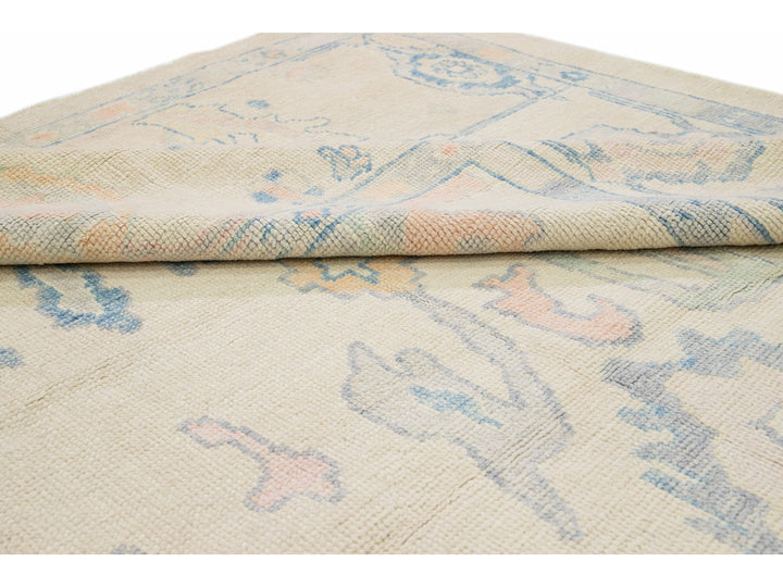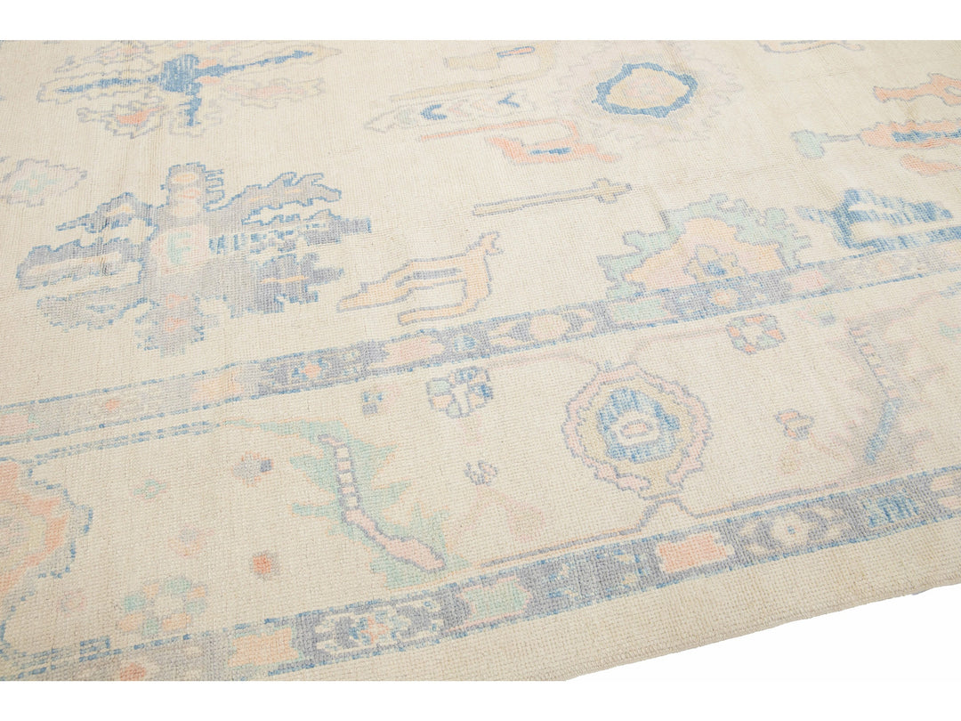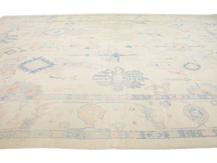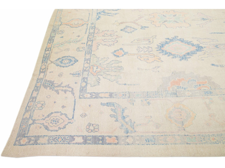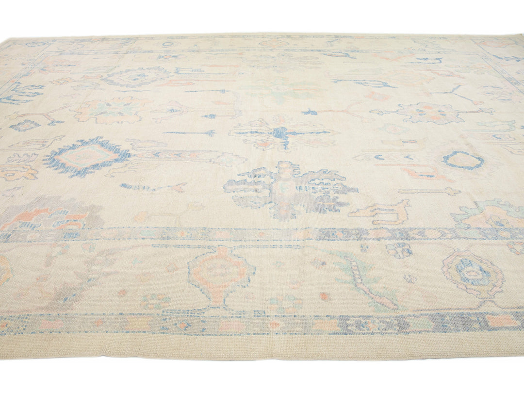 Beautiful modern Turkish Oushak hand-knotted wool rug with a beige field with Muted Colors in a gorgeous all-over floral design.