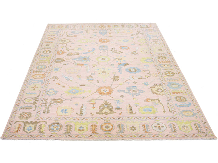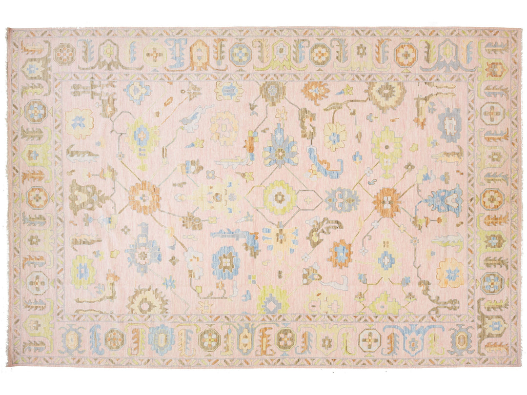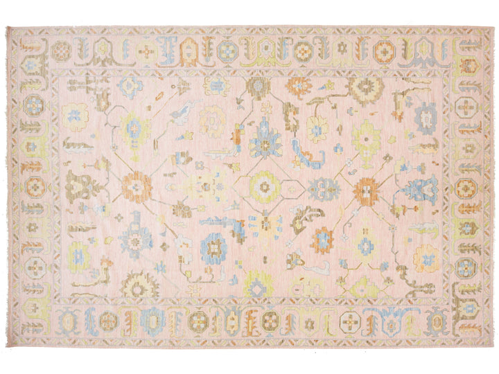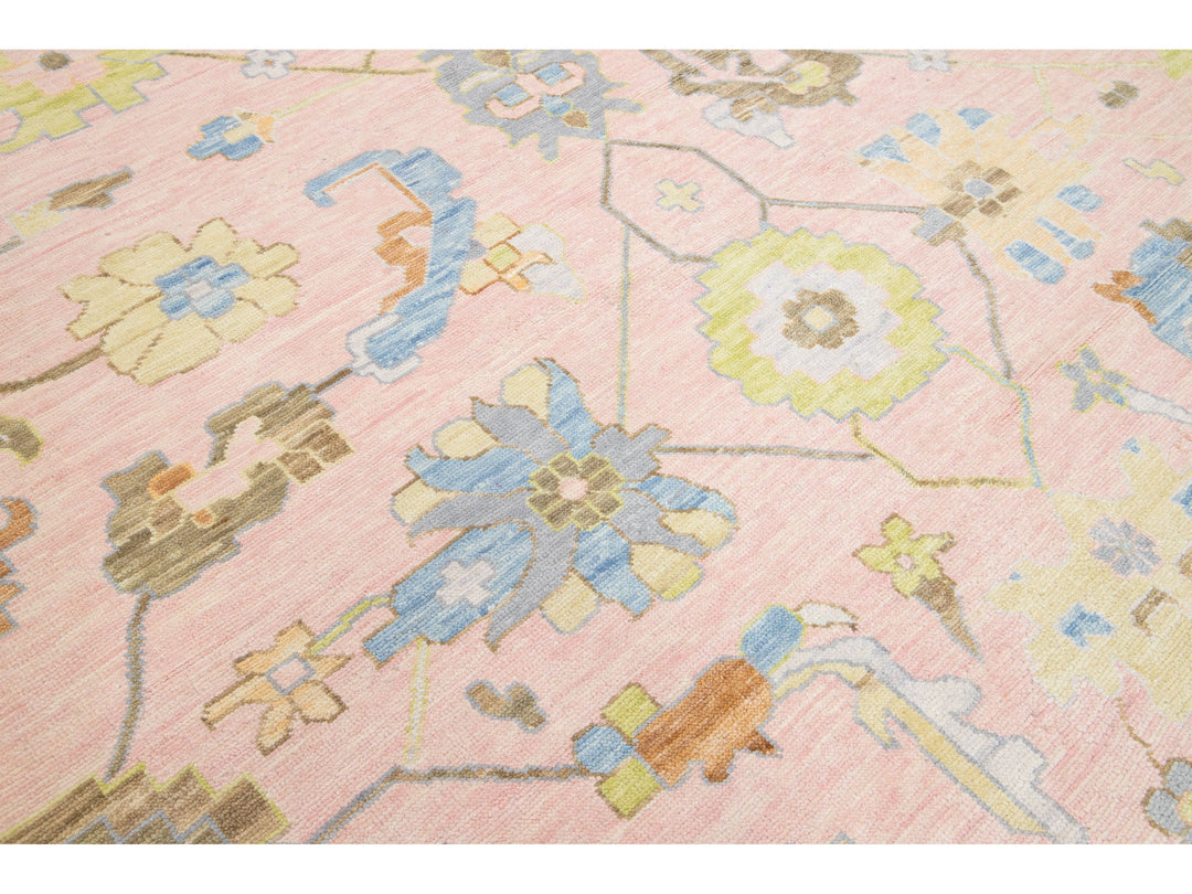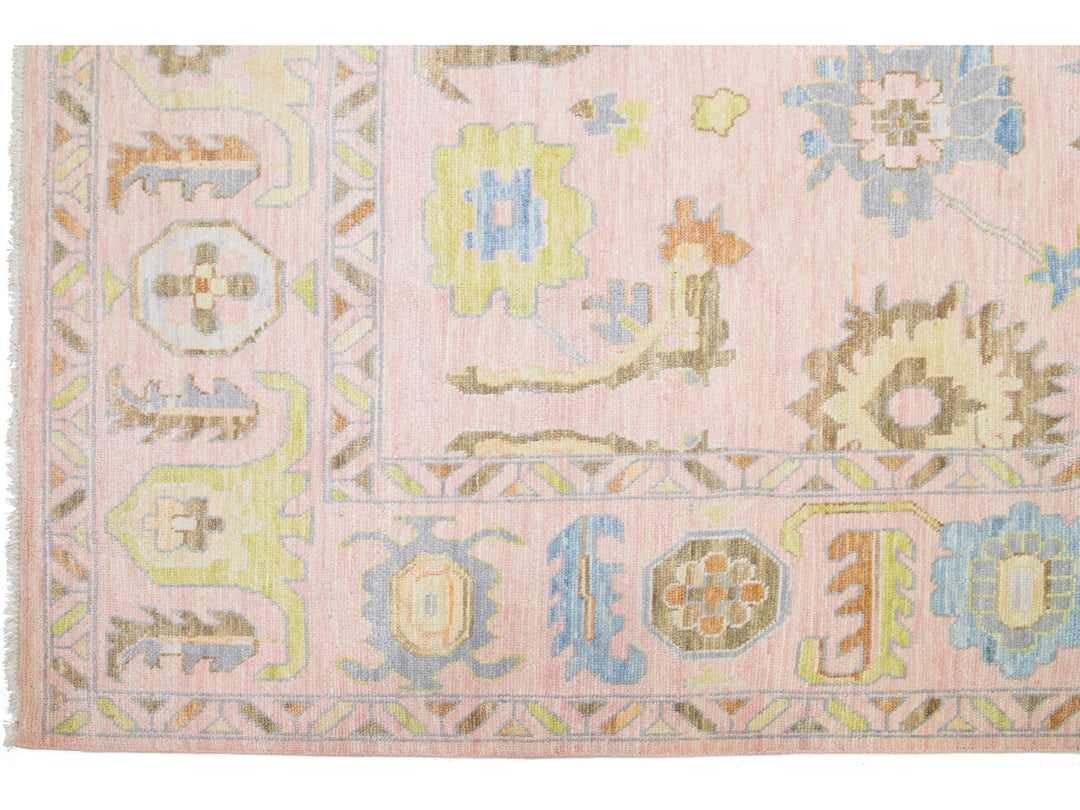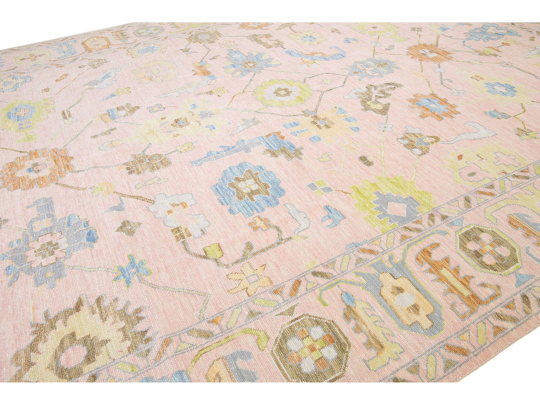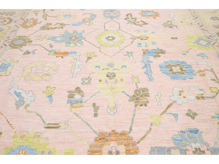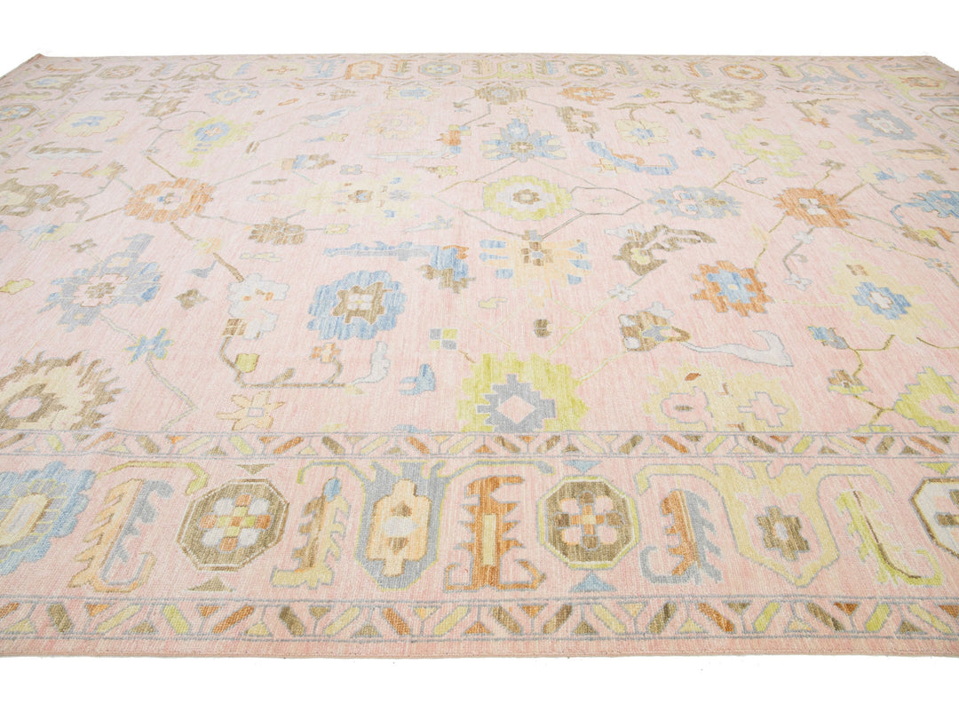 This Oushak-style rug features a hand-knotted pink field. It embodies a mid-century modern style with an all-over multicolored floral design. This rug measures 12'2" x 18'3".