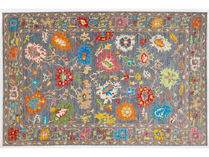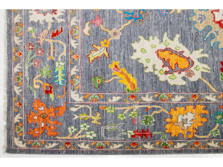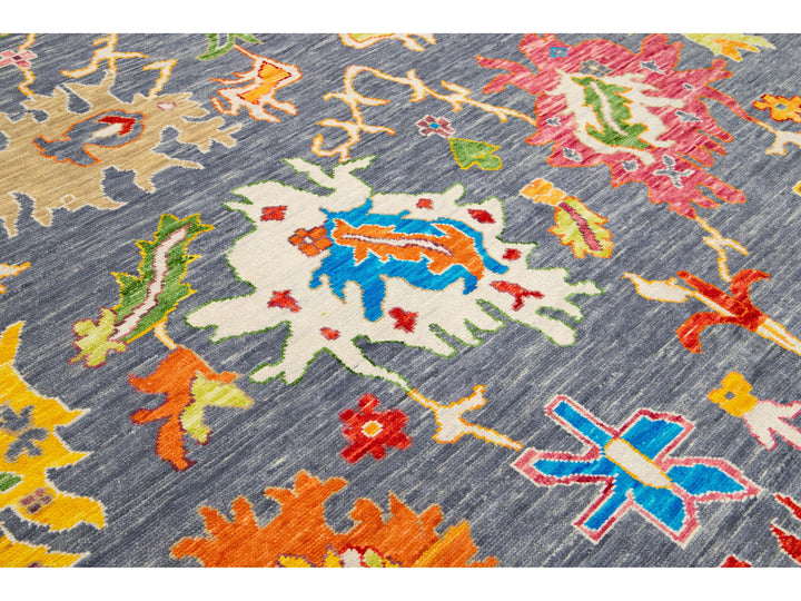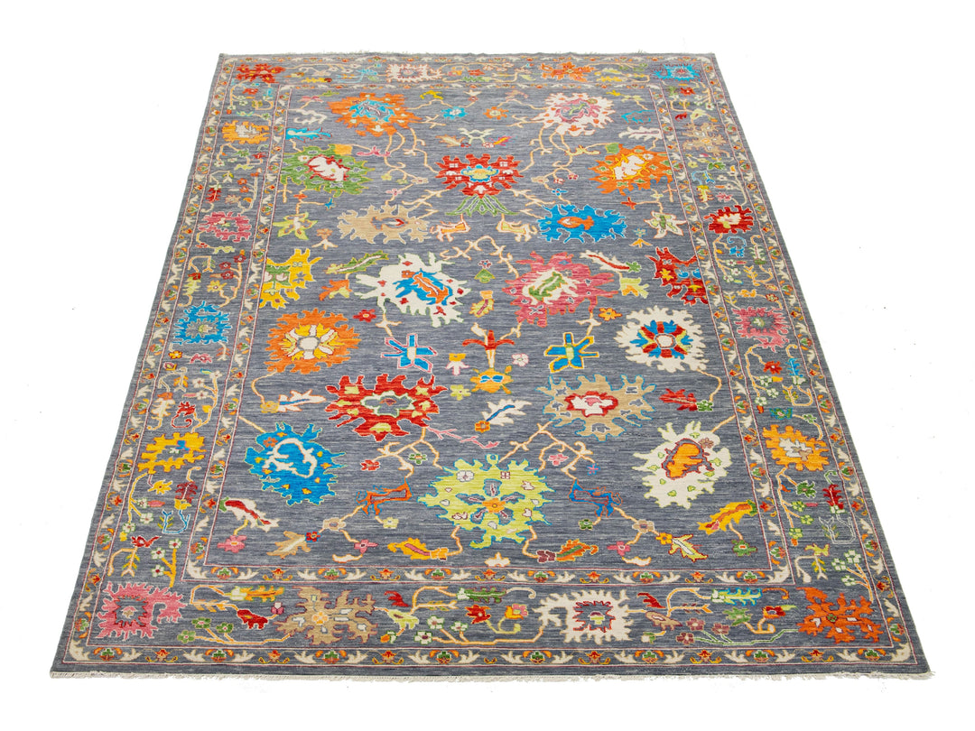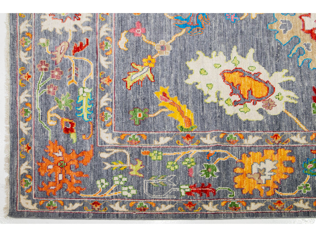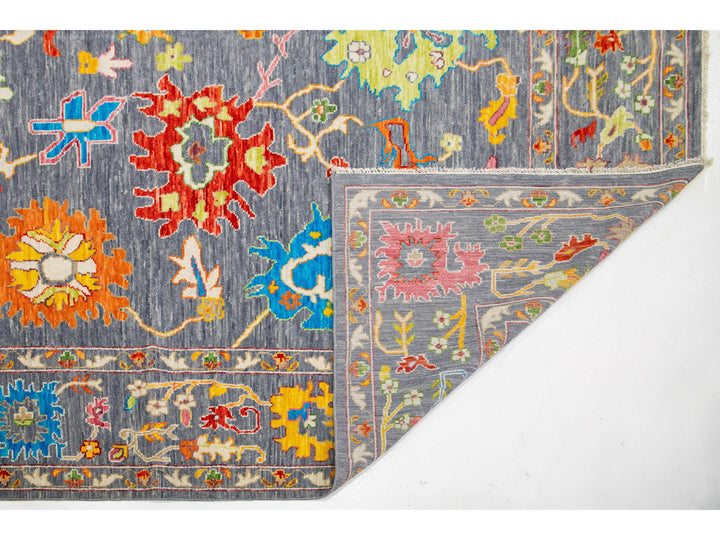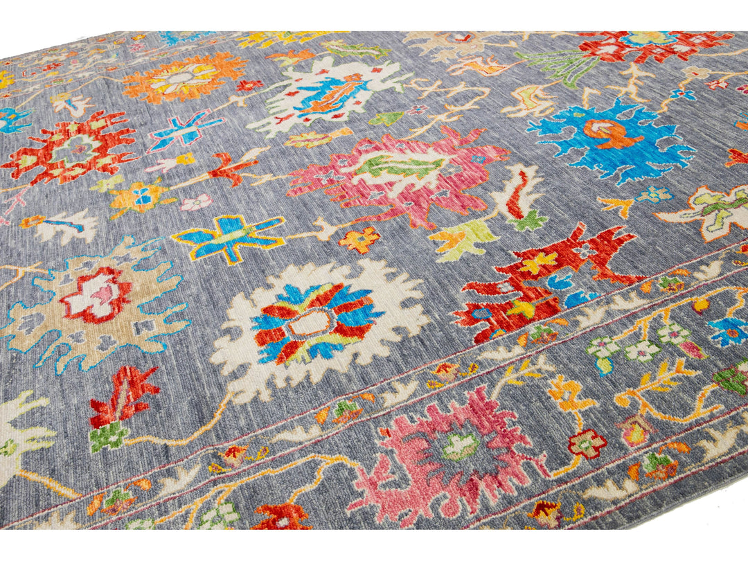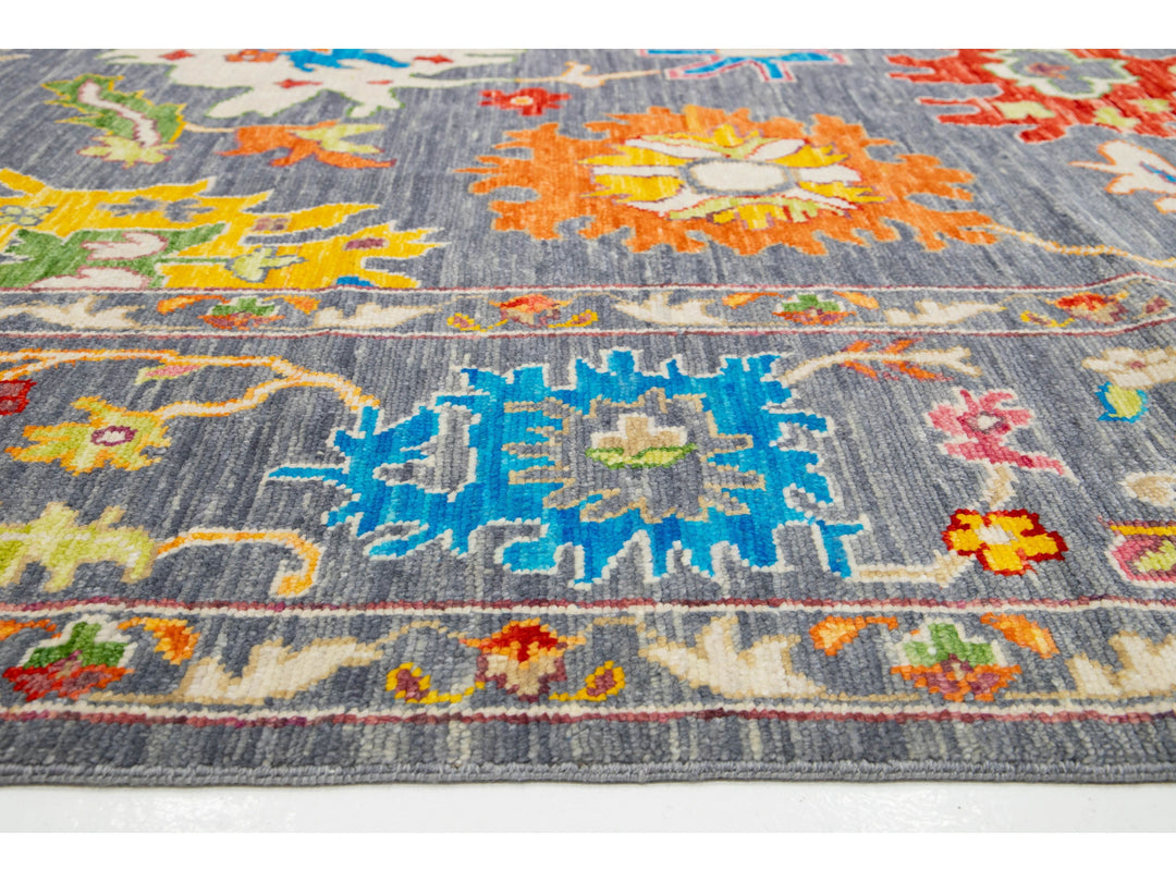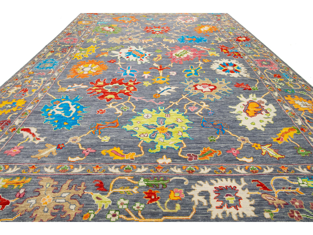 This modern Oushak-style wool rug seamlessly blends contemporary style with the timeless charm of traditional Oushak design. It features a striking gray background adorned with vibrant floral patterns in a captivating array of colors that draw attention. This rug measures 12'2" x 18'6".