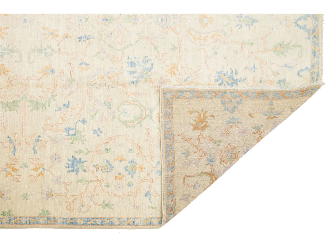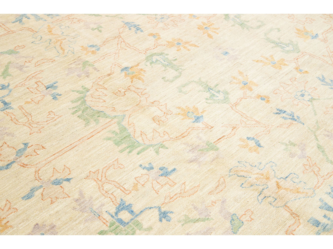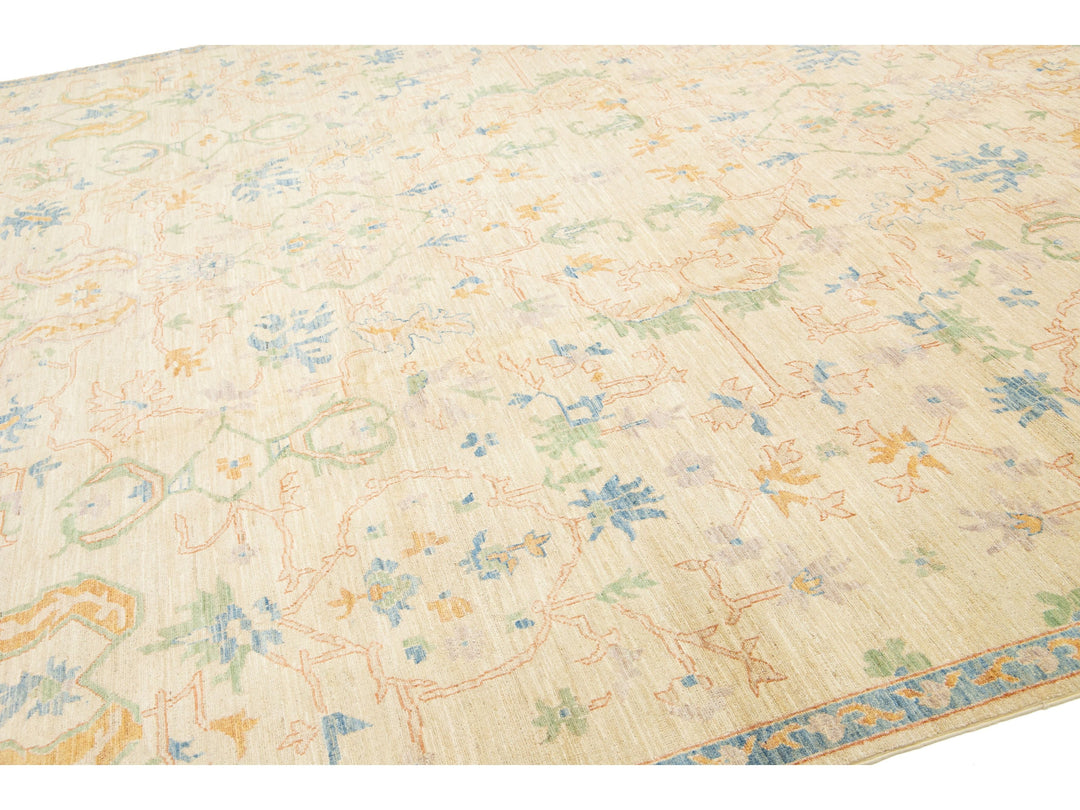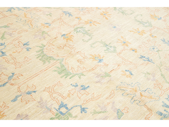 This contemporary Oushak-style wool rug beautifully merges modern design with the timeless charm of traditional Oushak craftsmanship. It features a striking beige background adorned with vibrant floral patterns. This rug measures 12'1" x 14'10".