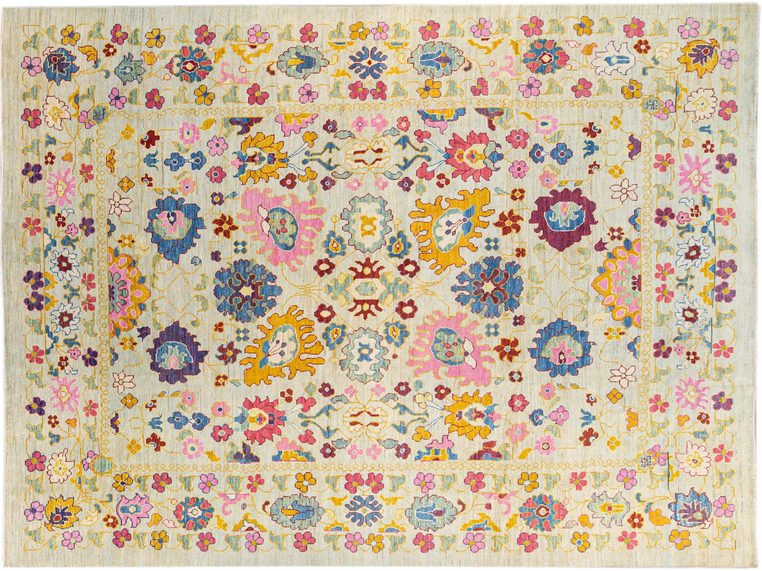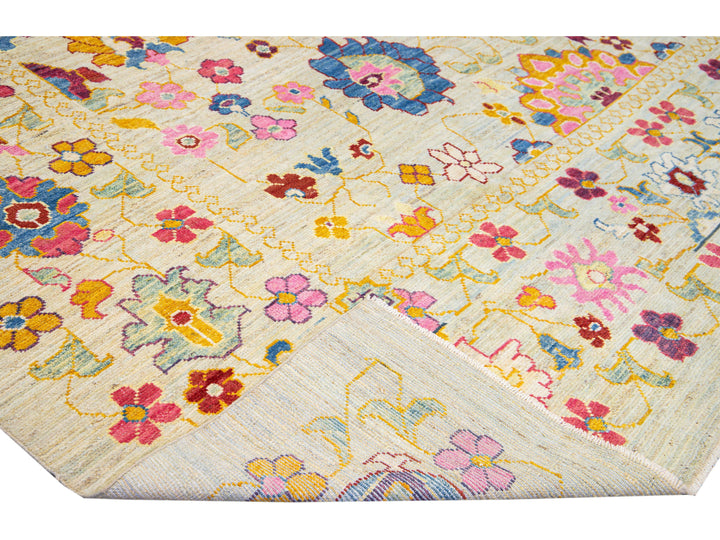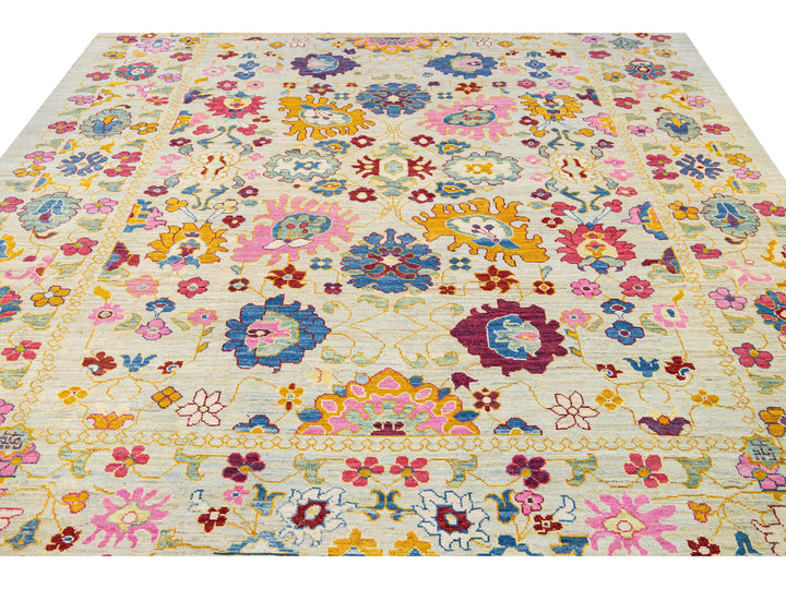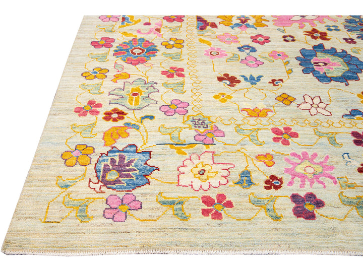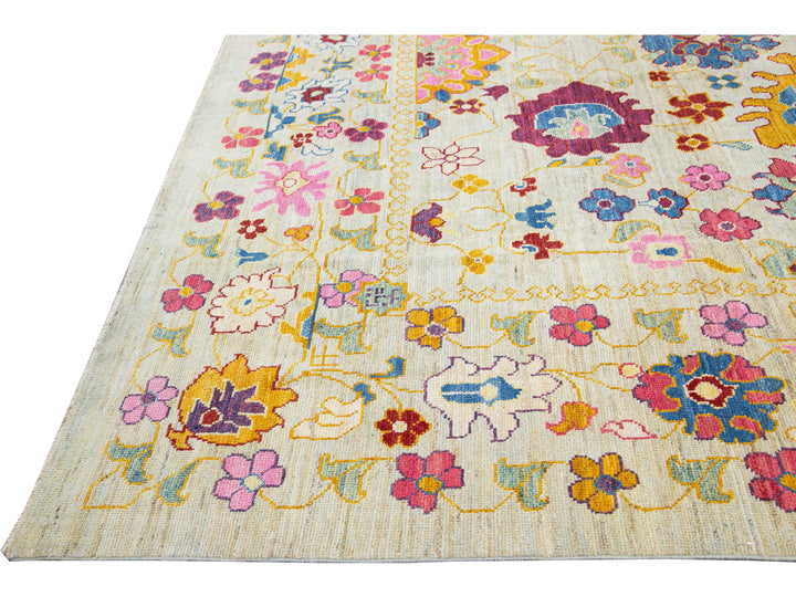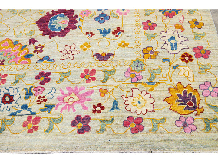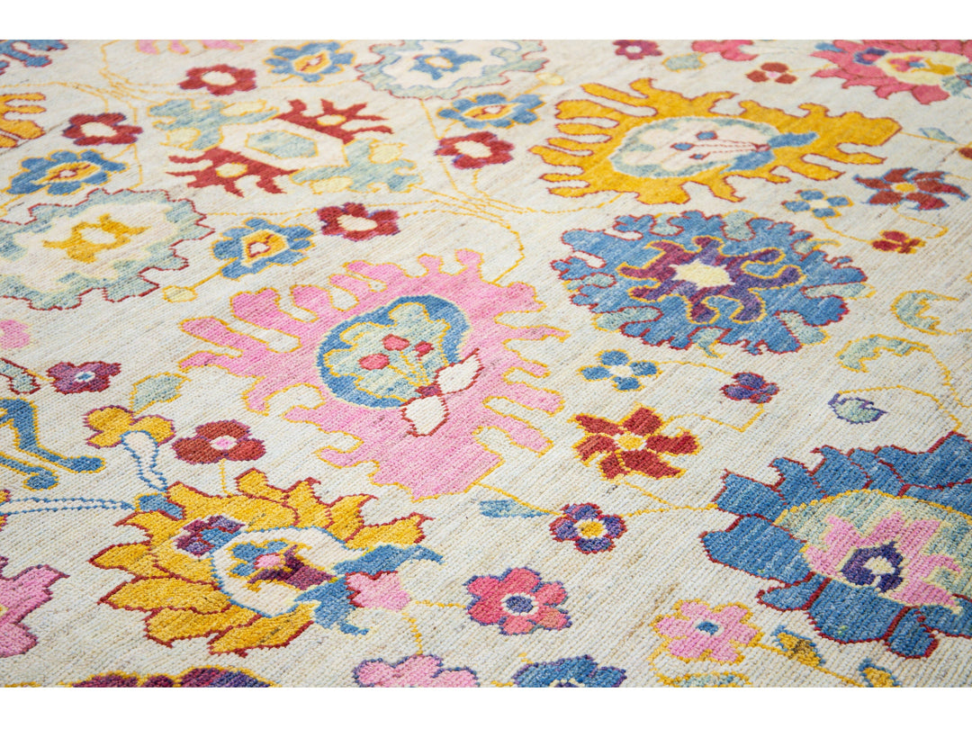 Beautiful modern Oushak hand-knotted wool rug with a beige field. This Oushak rug has a multicolor accents layout a gorgeous geometric floral pattern design.