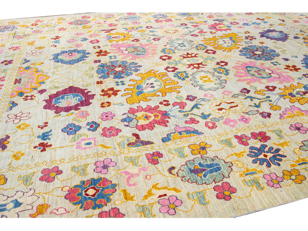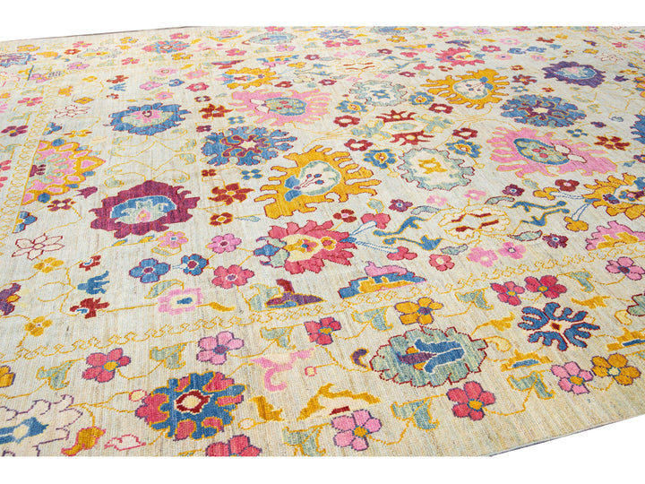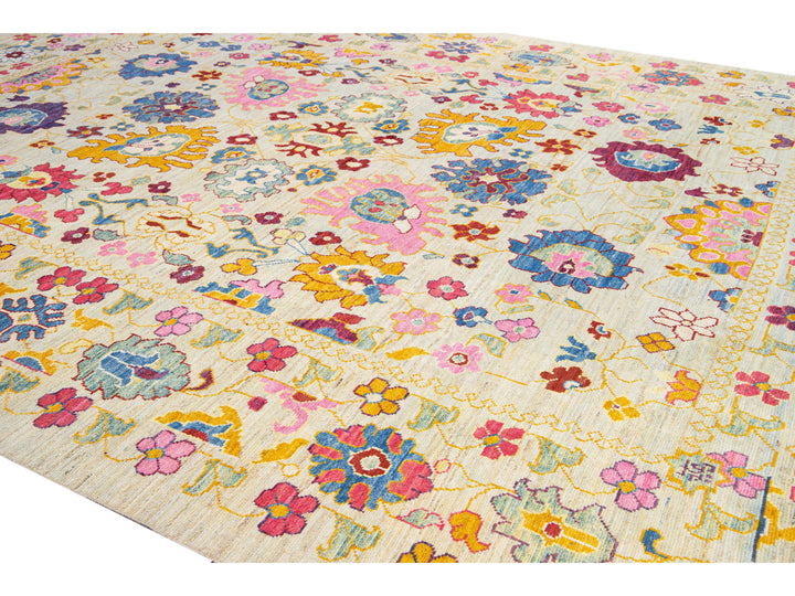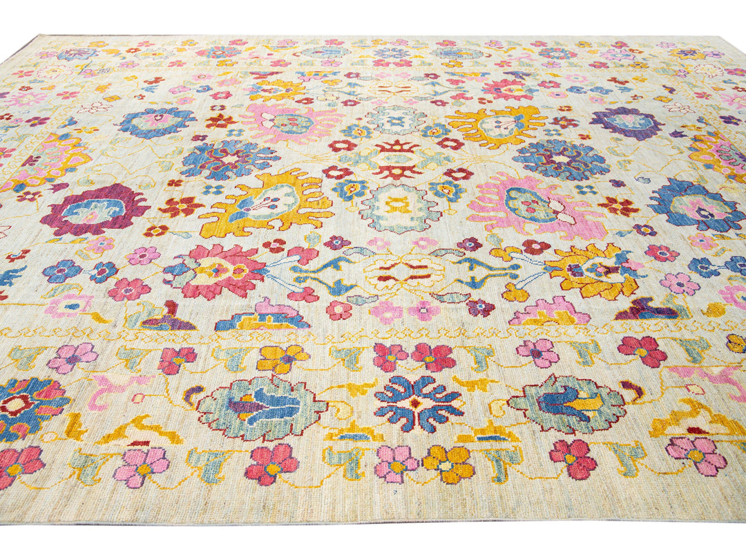 Modern Oushak Handmade Beige Floral Oversize Wool Rug