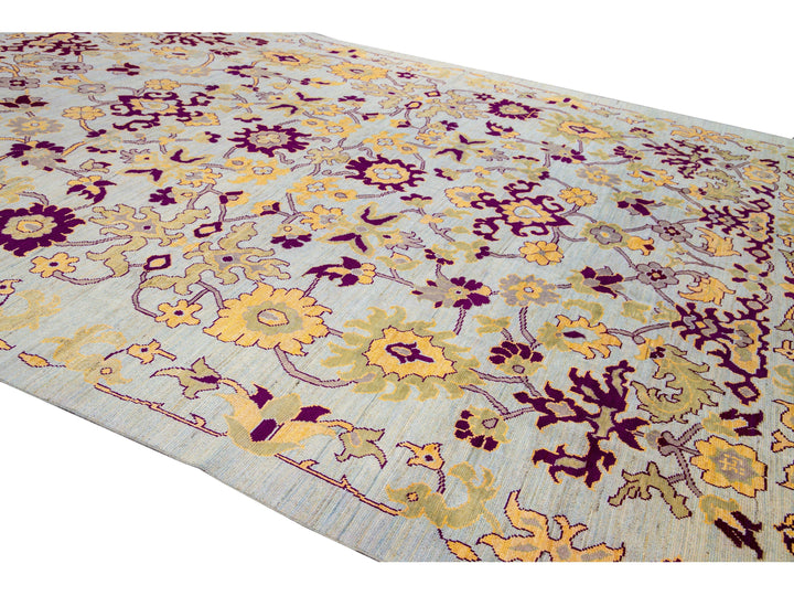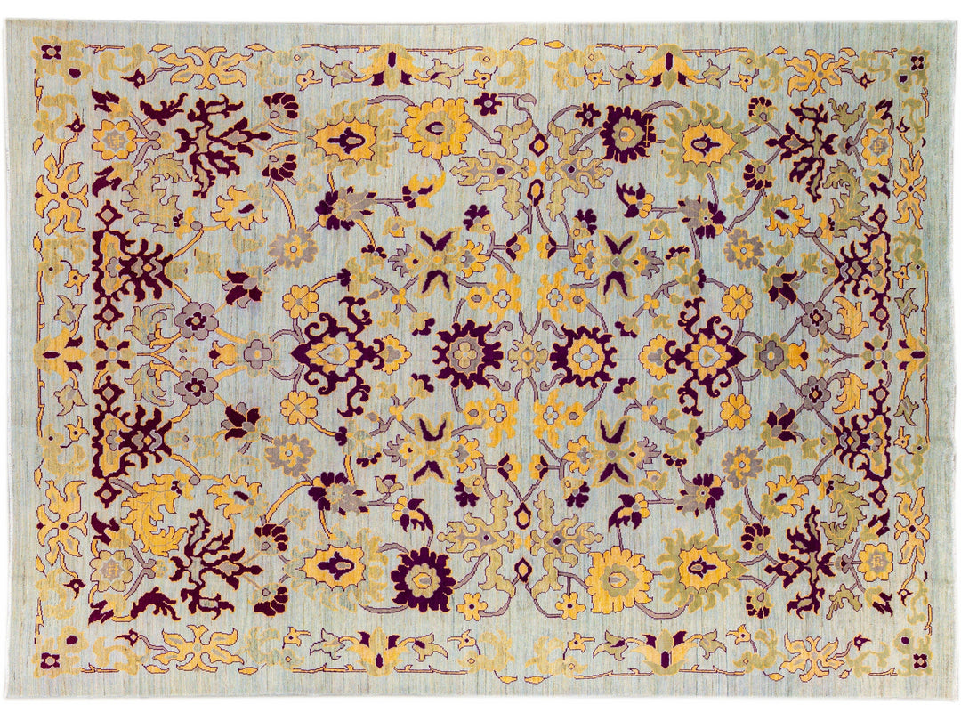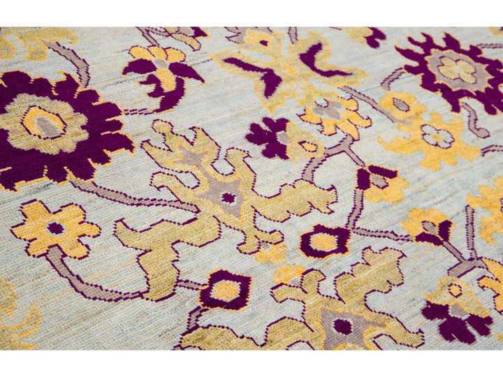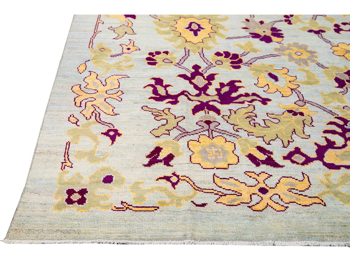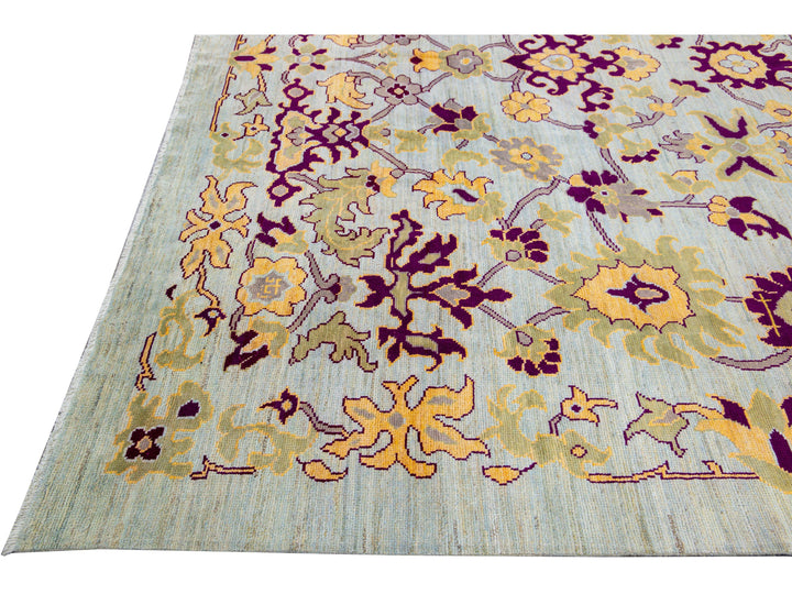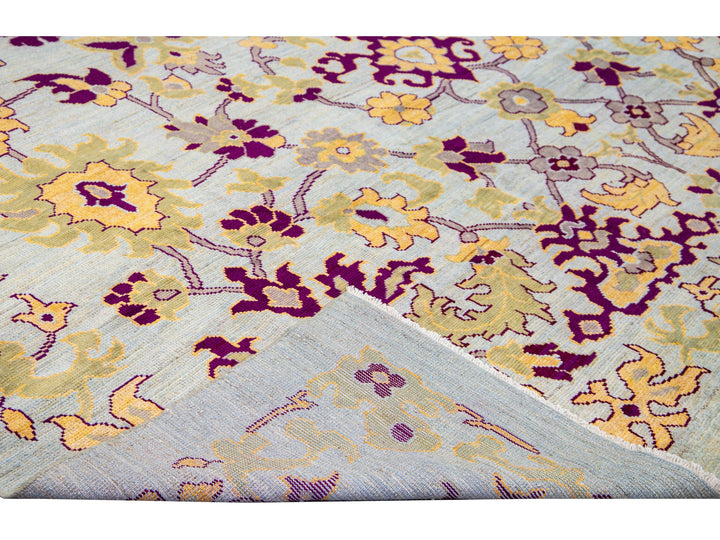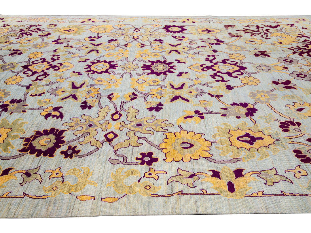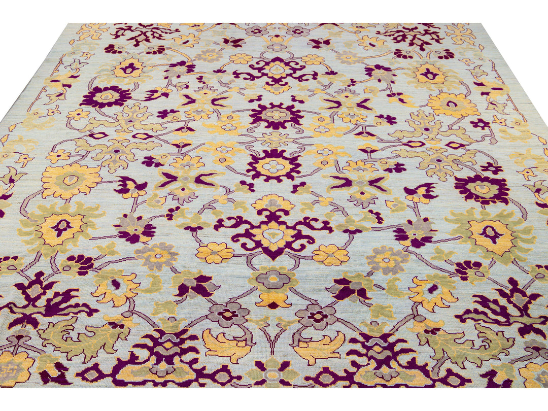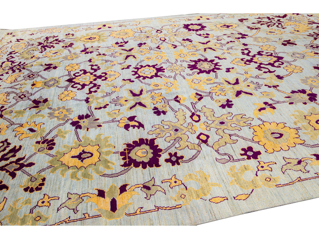 Beautiful modern Oushak hand-knotted wool rug with a blue field. This Oushak rug has a yellow and purple accents layout a gorgeous tribal floral pattern design.