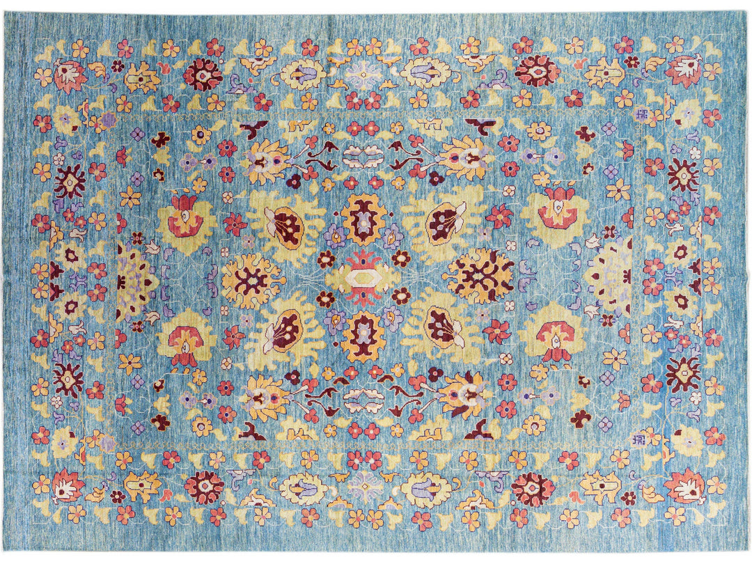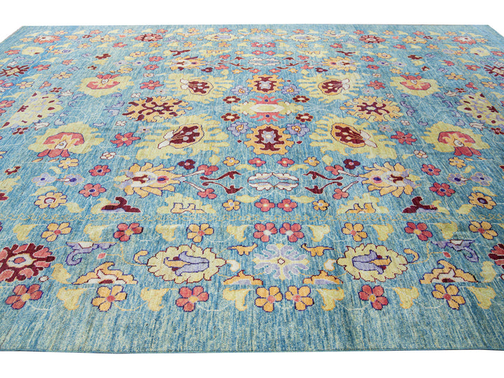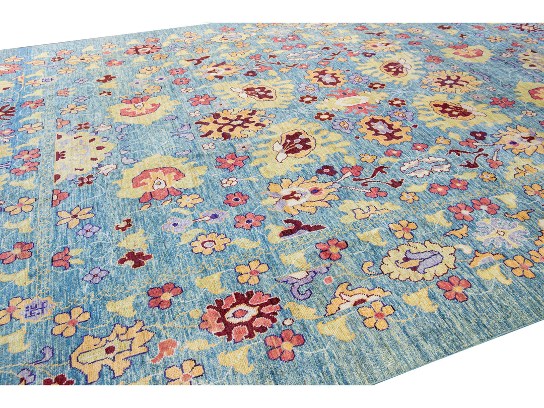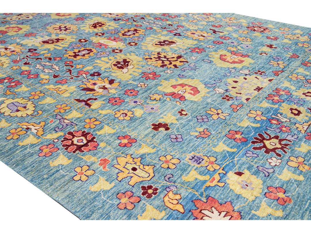 Modern Oushak Handmade Floral Oversize Blue Wool Rug