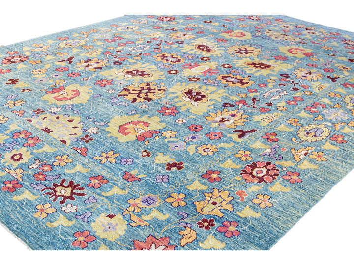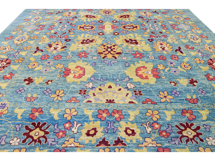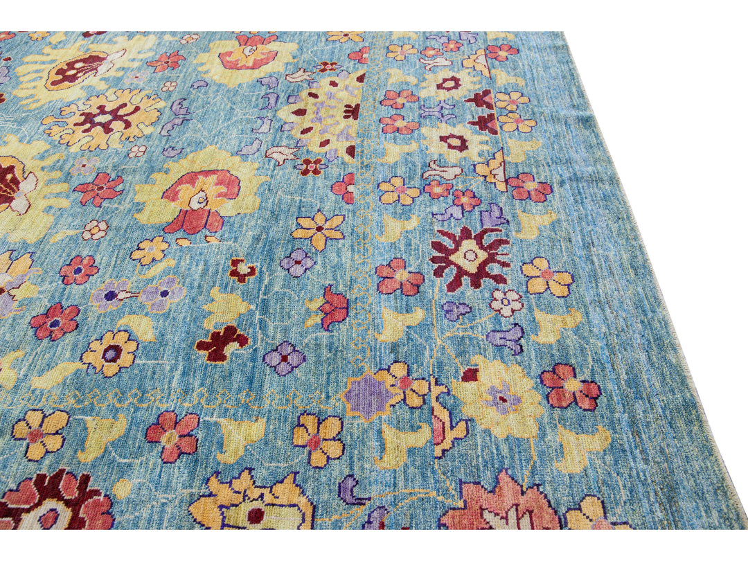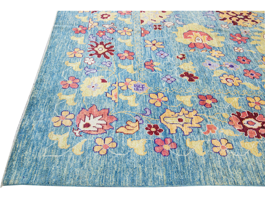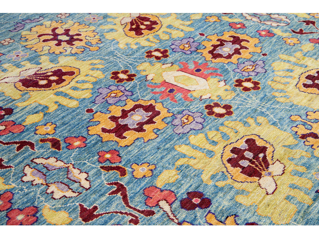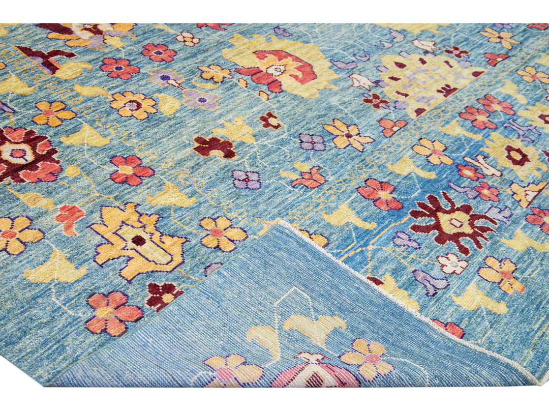 Beautiful modern Oushak hand-knotted wool rug with a blue field. This Oushak rug has a multicolor accents layout a gorgeous geometric floral pattern design.