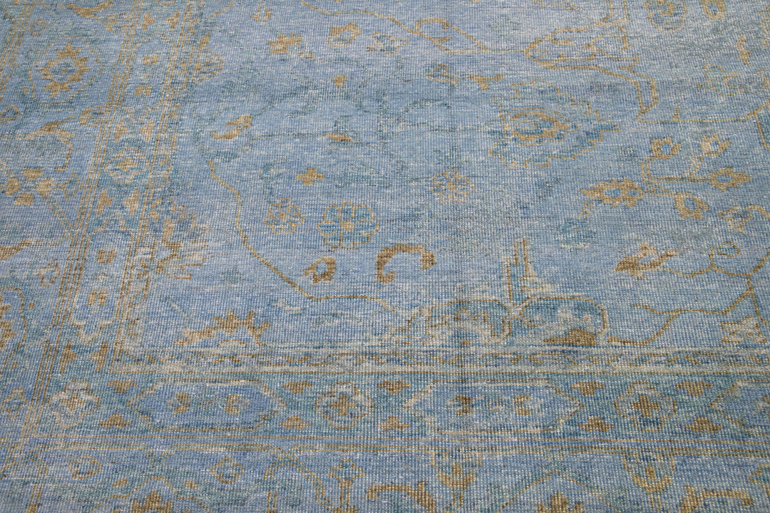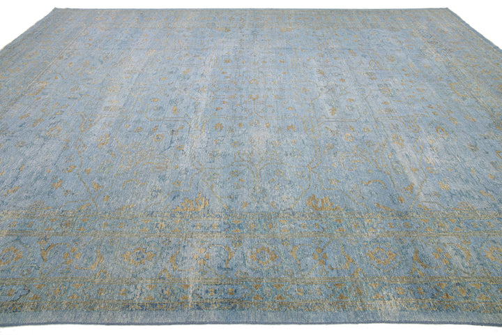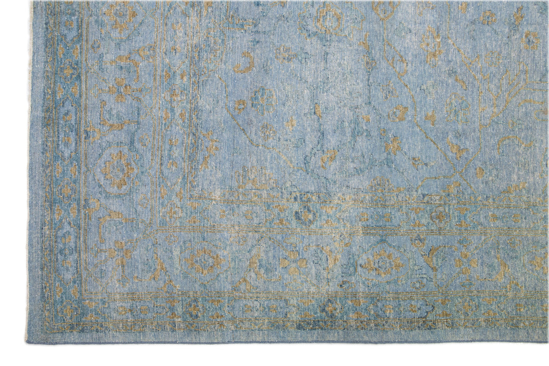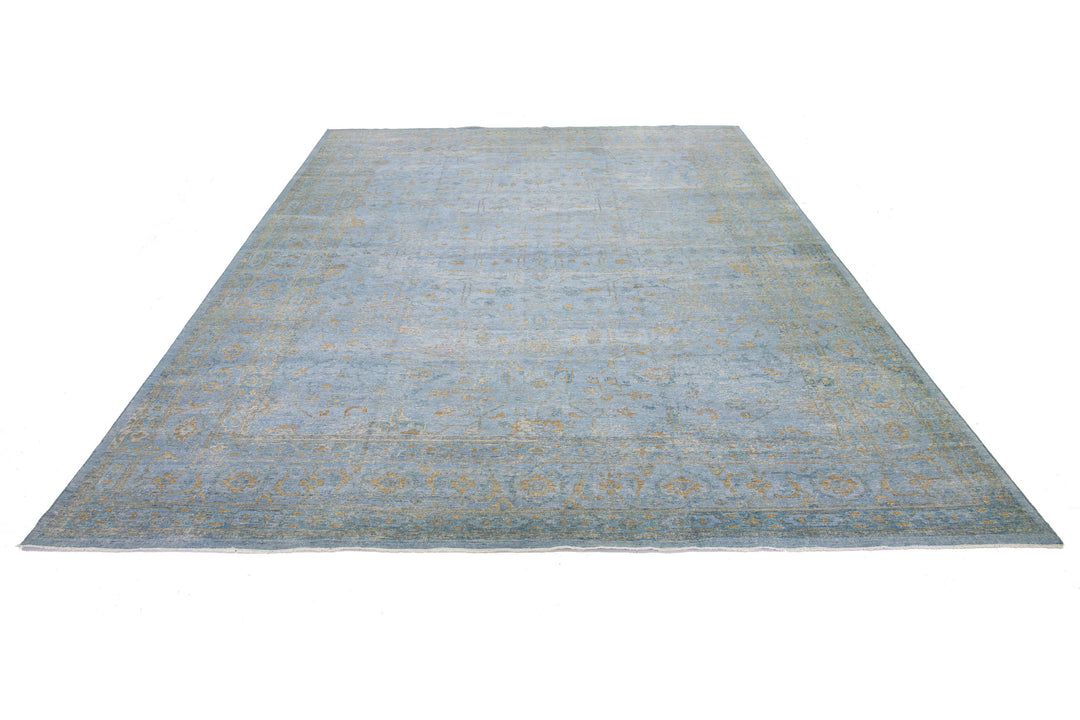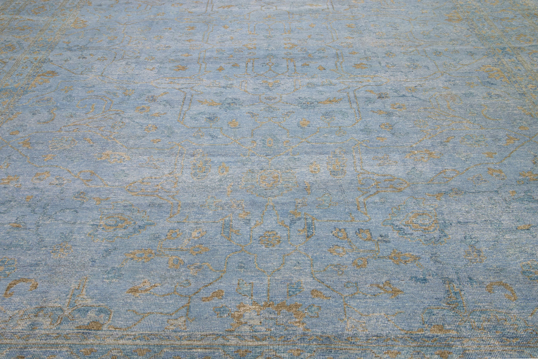 This hand-knotted Oushak wool rug is an attractive and timeless mid-century modern piece that will lend an elegant touch to any space. It features a blue field with an allover golden floral design that measures 11'9" x 15'. Crafted from superior wool, this exquisite rug will add a sophisticated touch to any living space for years to come.