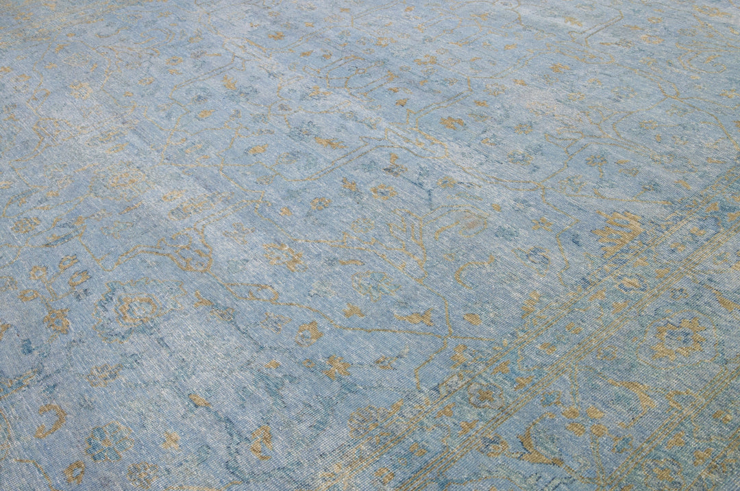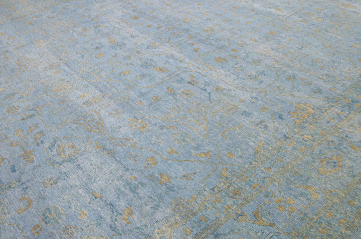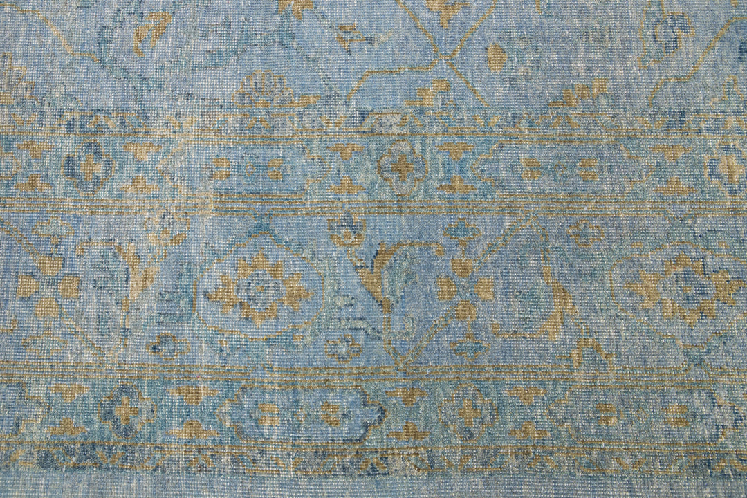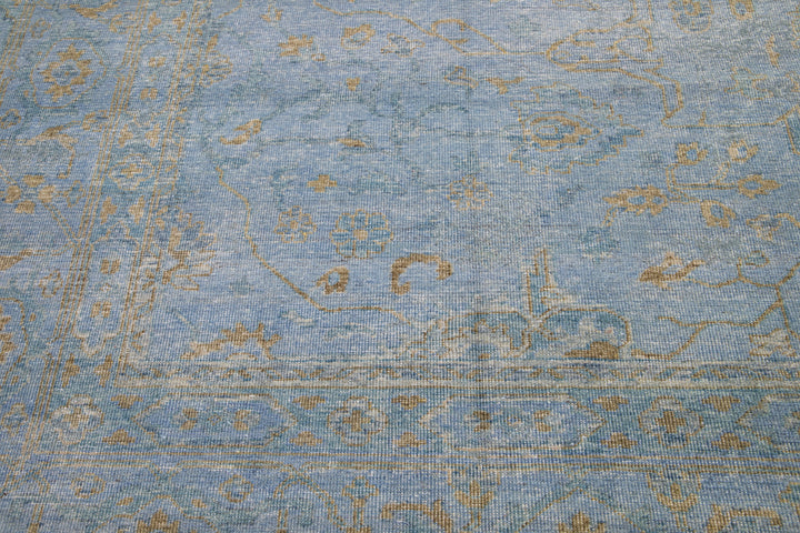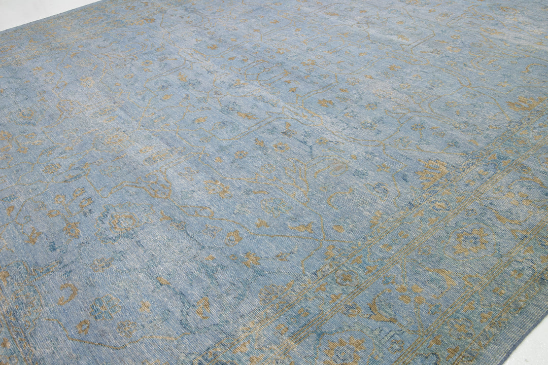 This hand-knotted Oushak wool rug is an attractive and timeless mid-century modern piece that will lend an elegant touch to any space. It features a blue field with an allover golden floral design that measures 11'9" x 15'. Crafted from superior wool, this exquisite rug will add a sophisticated touch to any living space for years to come.
