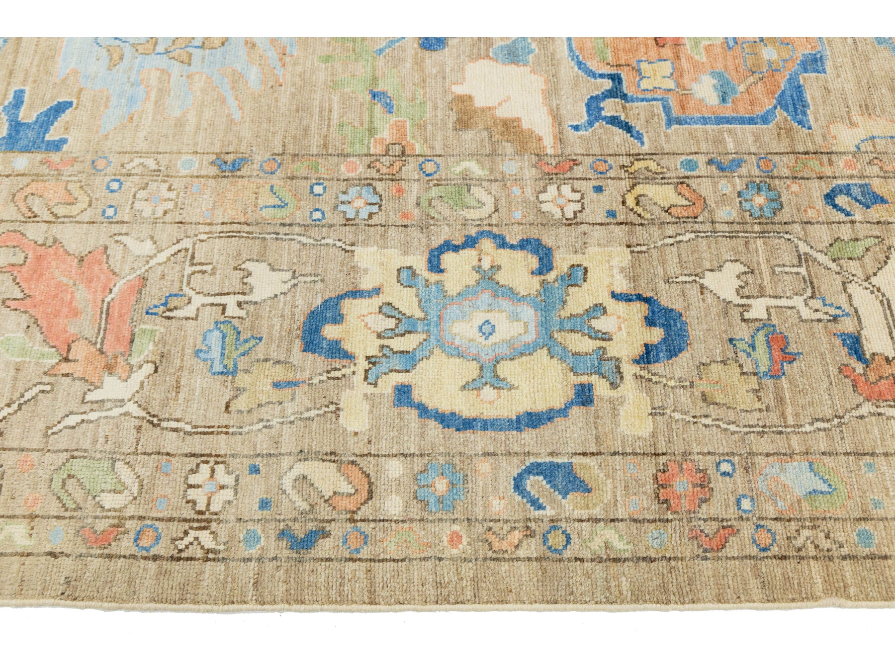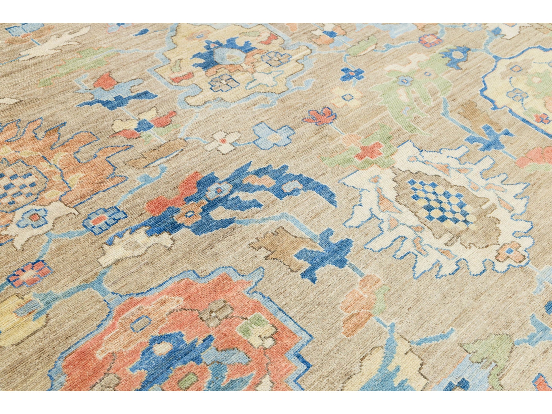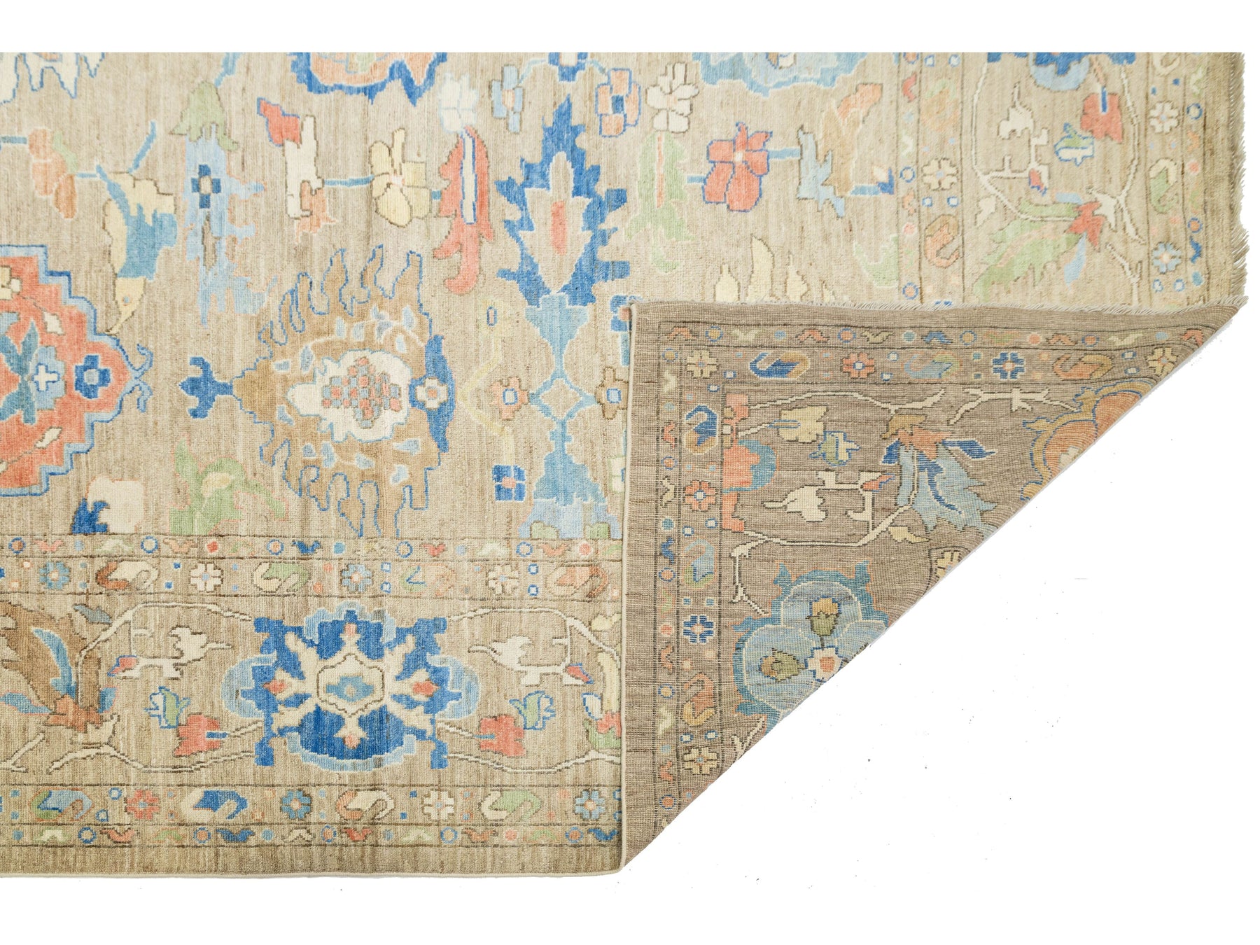 Transform your living space with the elegance of this Modern Oushak Style Wool Rug. Hand-knotted from high-quality wool, it features a sand-toned field adorned with oversized geometric palmettes and botanical motifs. The color palette blends muted terracotta, soft cornflower blue, and sage green, creating a vibrant yet serene look. Its sparse pattern and low-contrast border evoke an "antique wash" aesthetic, perfect for farmhouse, coastal, or contemporary minimalist designs. This rug measures 12'1" x 18'.