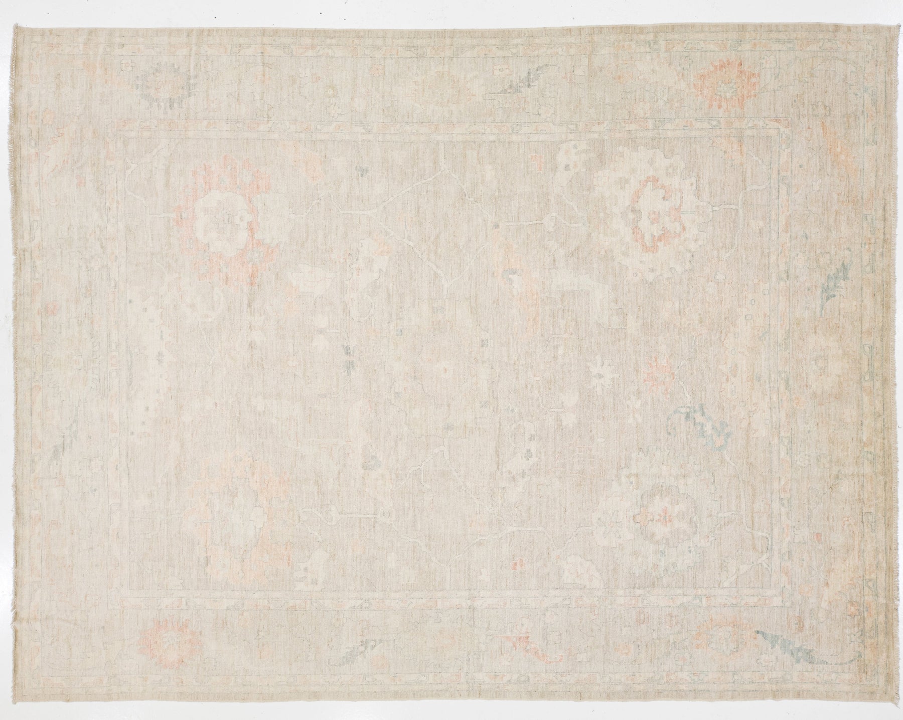 Enhance your living space with this elegant modern Oushak style rug. Hand-knotted from premium wool, it showcases a "distressed" design that combines traditional Turkish motifs with a contemporary palette. The versatile champagne beige field is highlighted by soft terracotta, dusty sage, and pale blue floral medallions, making it ideal for transitional, coastal, or modern organic interiors. This rug measures 11'8" x 15'2".