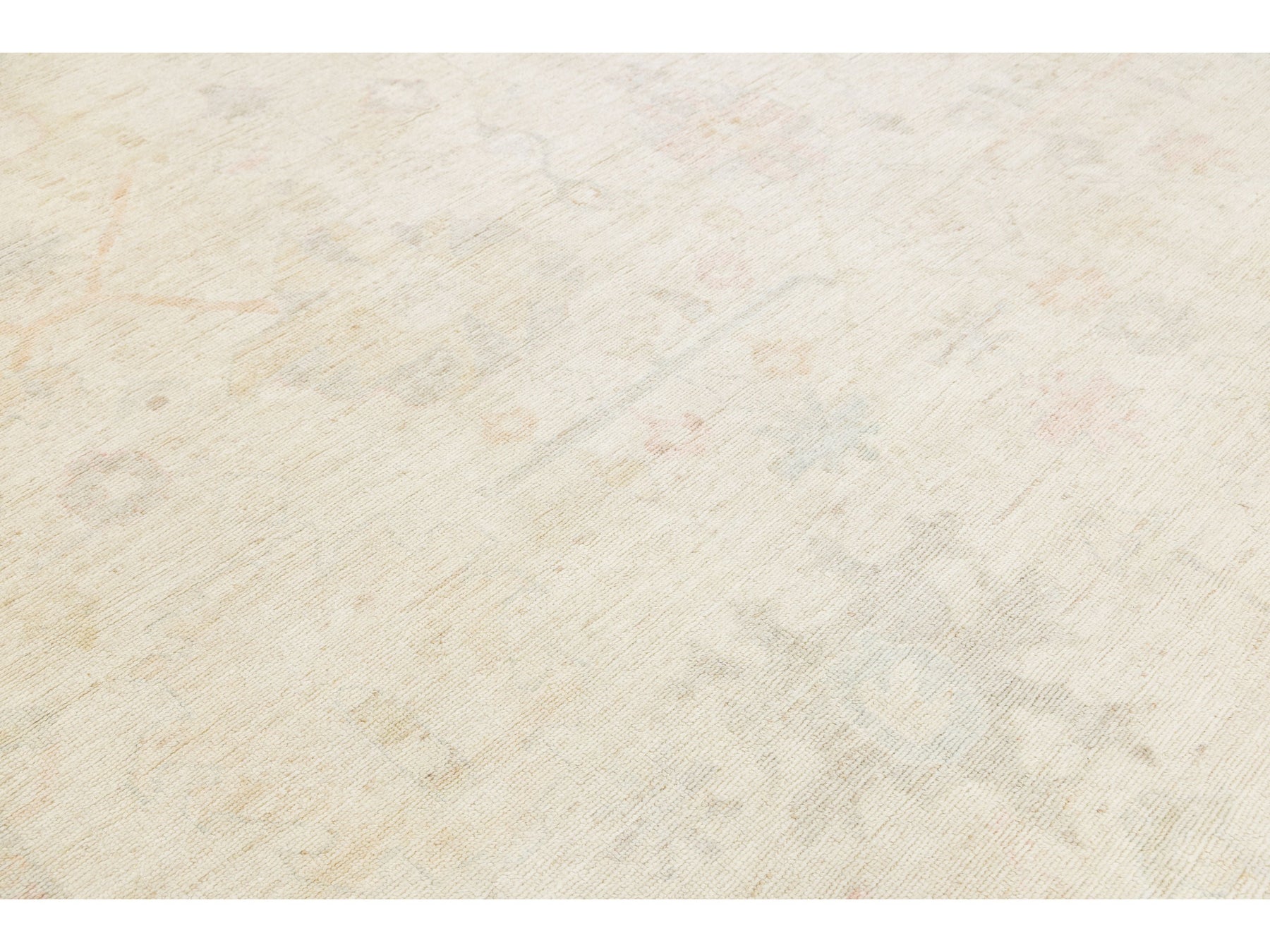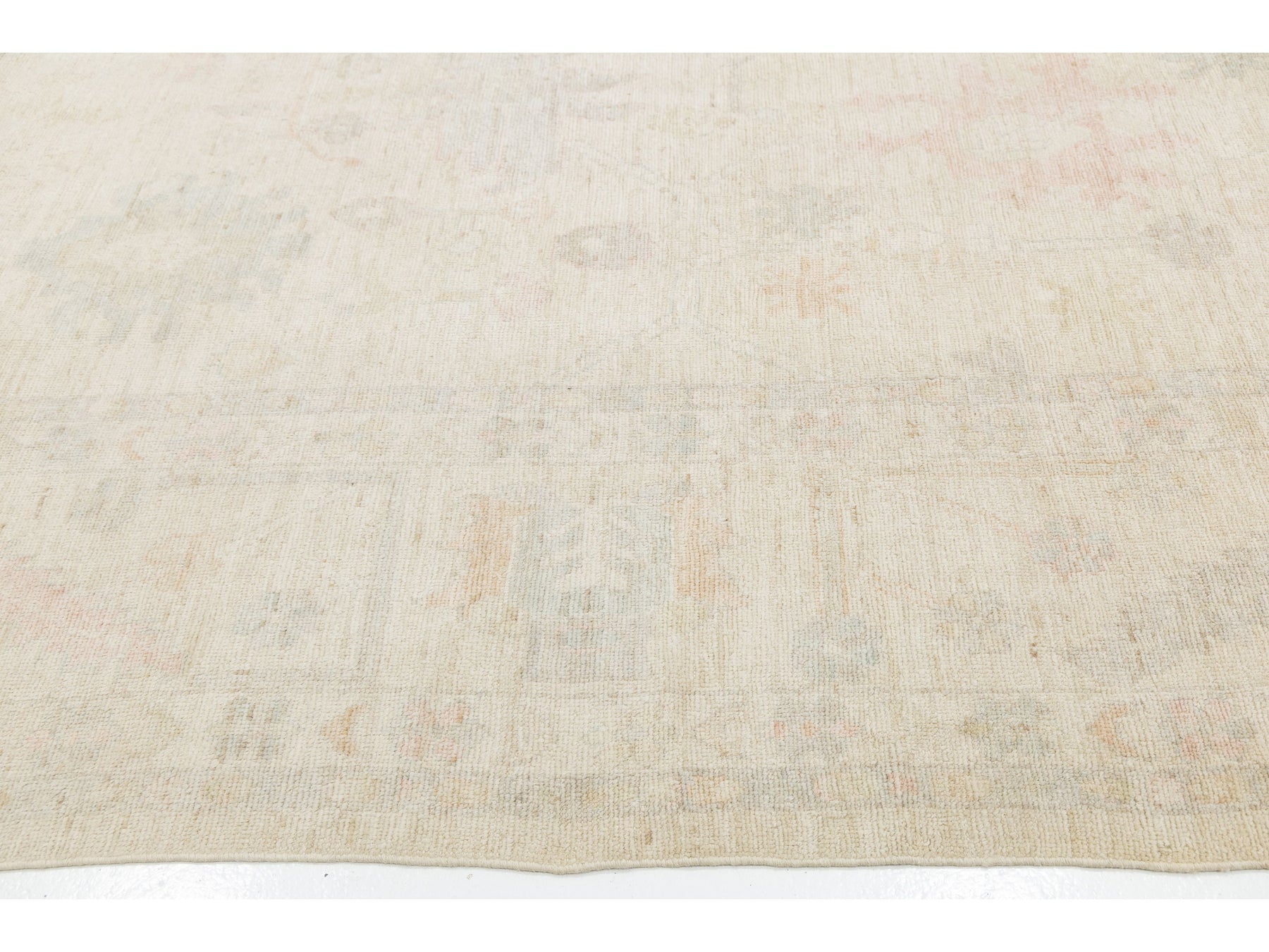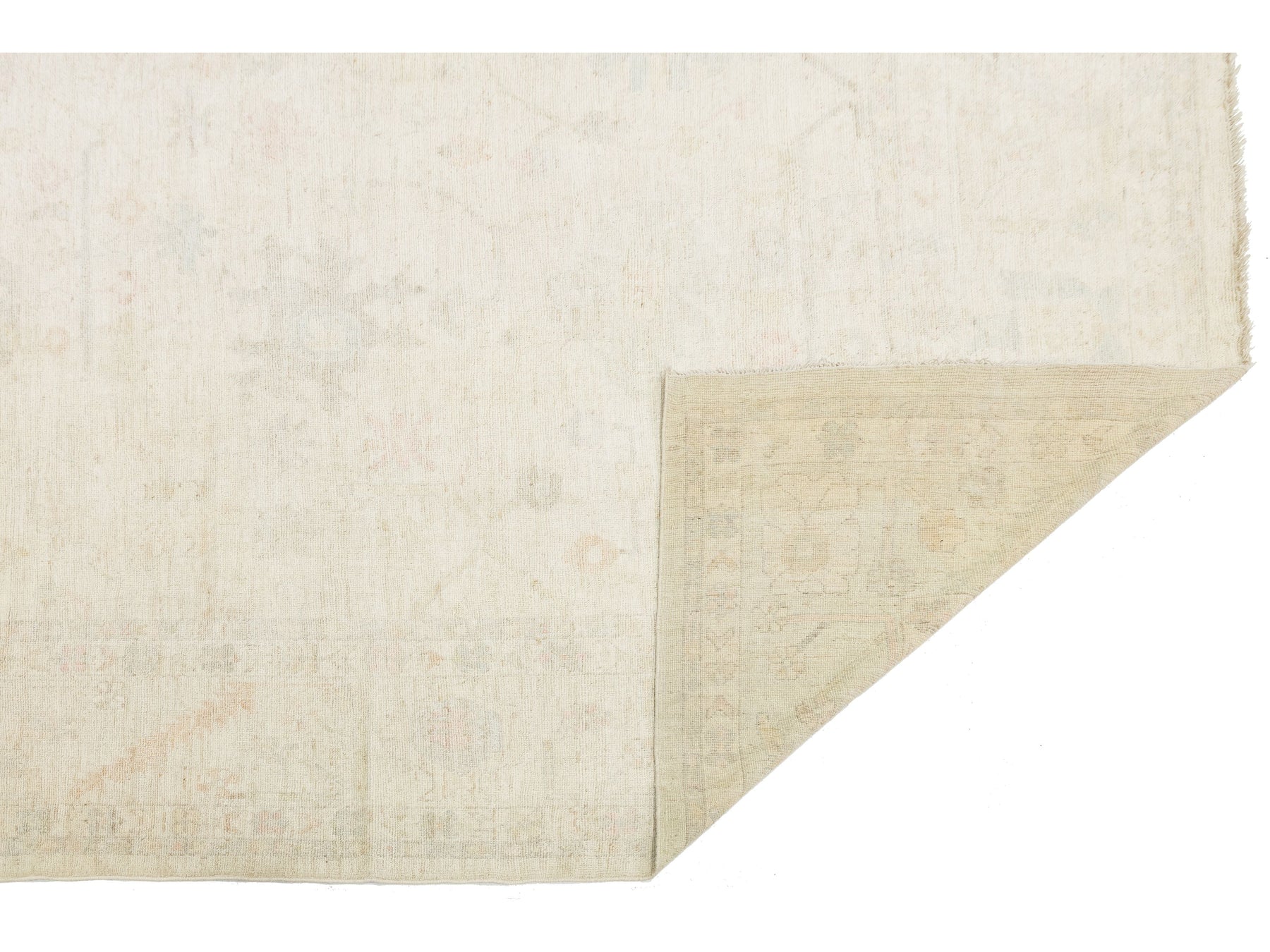 This stunning Modern Oushak style rug features a sophisticated, low-contrast design that perfectly captures the "quiet luxury" aesthetic. Hand-knotted from premium wool, it showcases a luminous ivory and cream field adorned with oversized, airy botanical motifs in faint whispers of slate blue, soft apricot, and sage green. The intentionally distressed finish and tonal variations give it the soulful character of an antique piece while remaining versatile enough for contemporary, transitional, or coastal interiors. This rug measures 11'7" x 15'5".