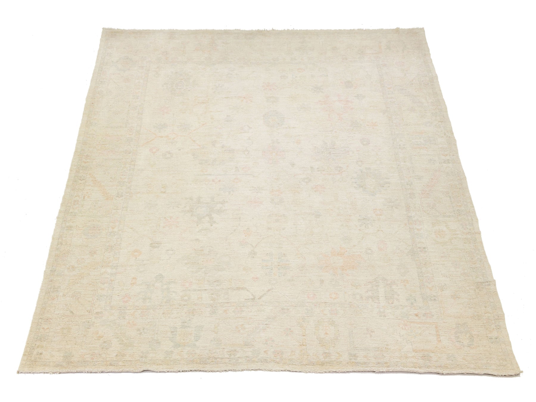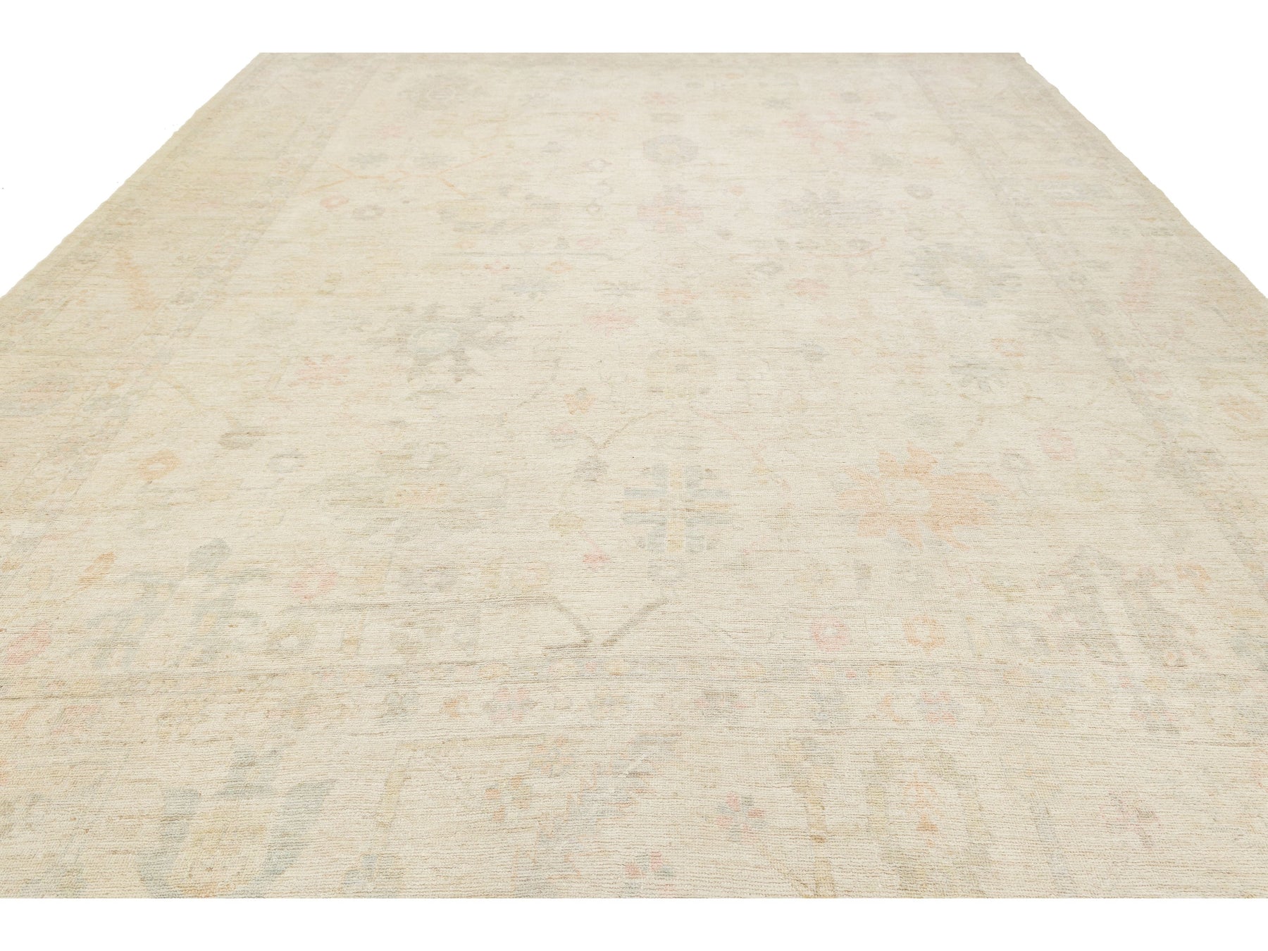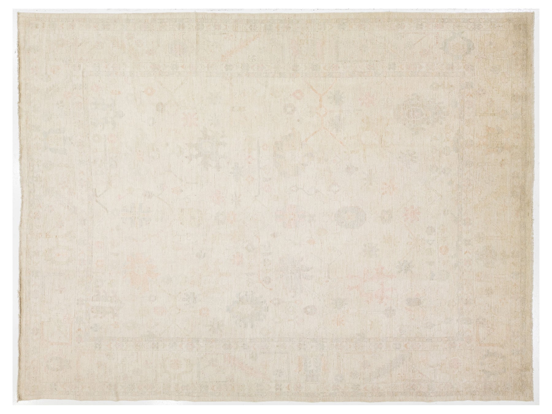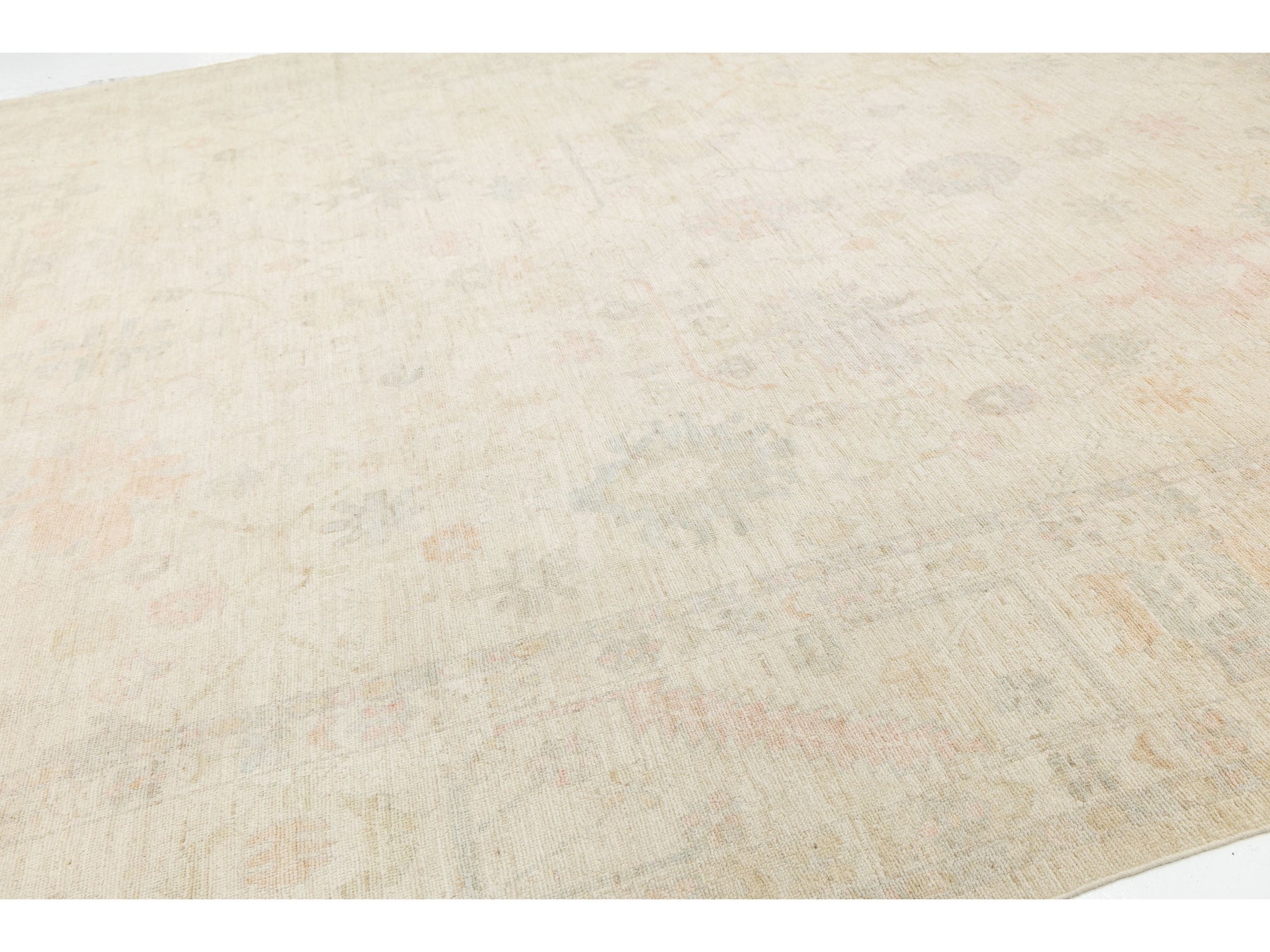 This stunning Modern Oushak style rug features a sophisticated, low-contrast design that perfectly captures the "quiet luxury" aesthetic. Hand-knotted from premium wool, it showcases a luminous ivory and cream field adorned with oversized, airy botanical motifs in faint whispers of slate blue, soft apricot, and sage green. The intentionally distressed finish and tonal variations give it the soulful character of an antique piece while remaining versatile enough for contemporary, transitional, or coastal interiors. This rug measures 11'7" x 15'5".