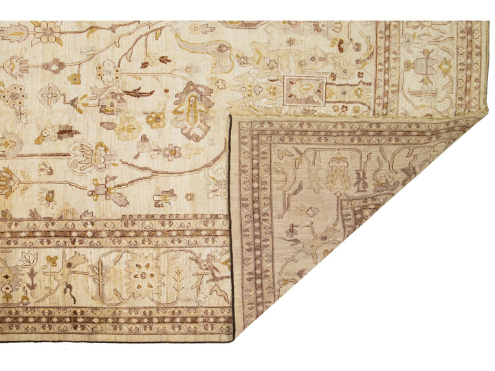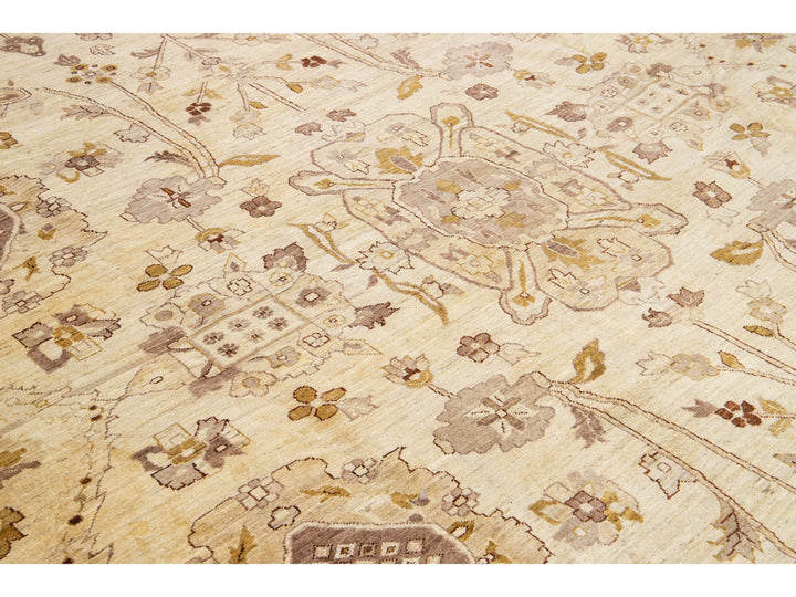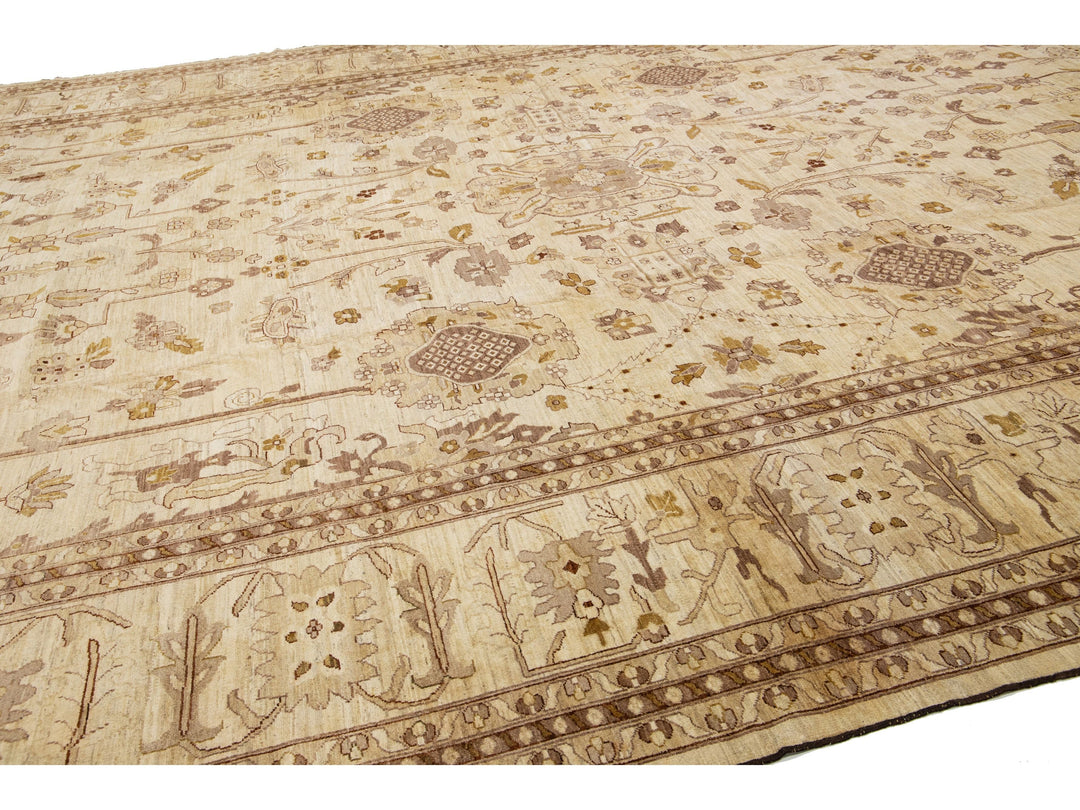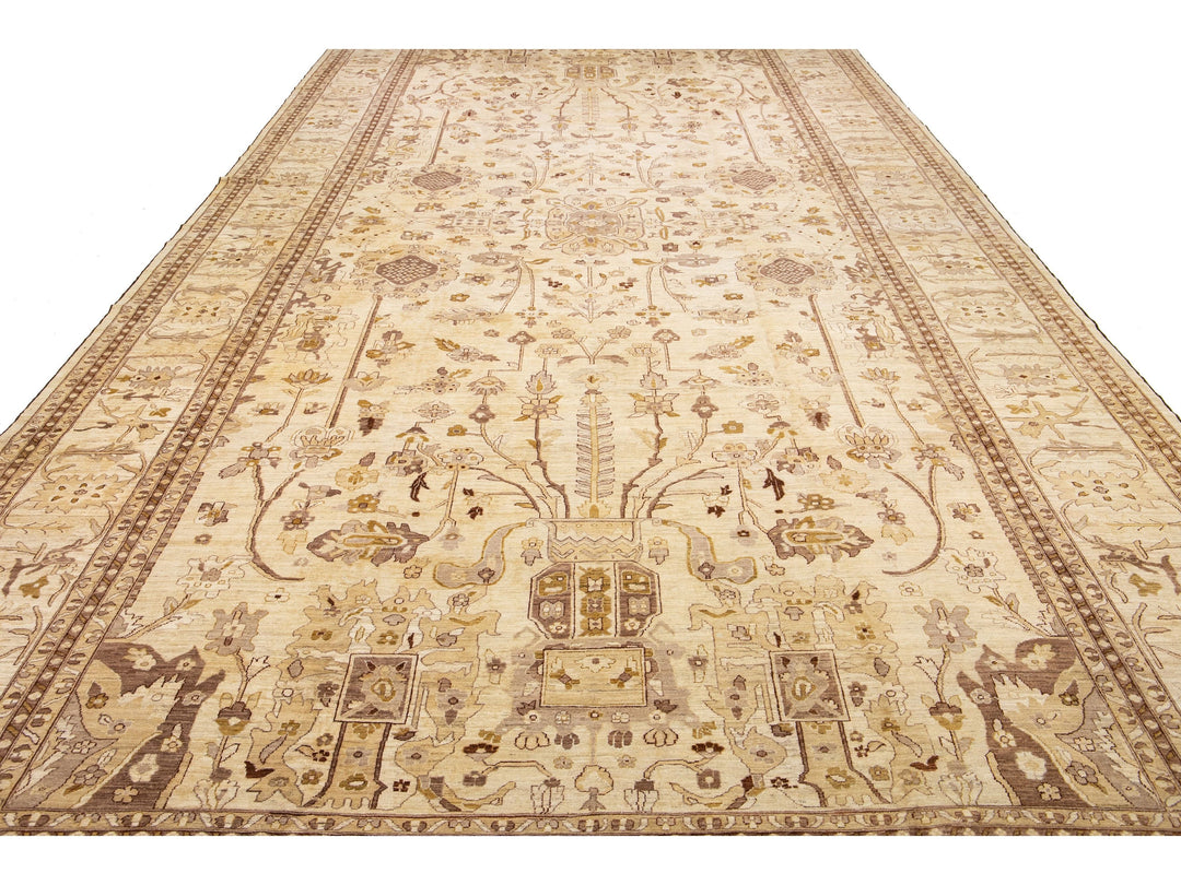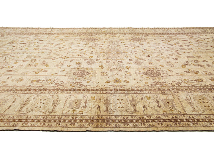 This contemporary Palace-sized Oushak-style wool rug exemplifies traditional craftsmanship. It features a prominent beige background, intricately adorned with a floral pattern that harmoniously integrates refined shades of brown, gray, and goldenrod, thereby enhancing its depth and sophistication. This rug measures 13'10" x 27'10".