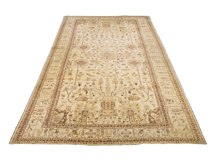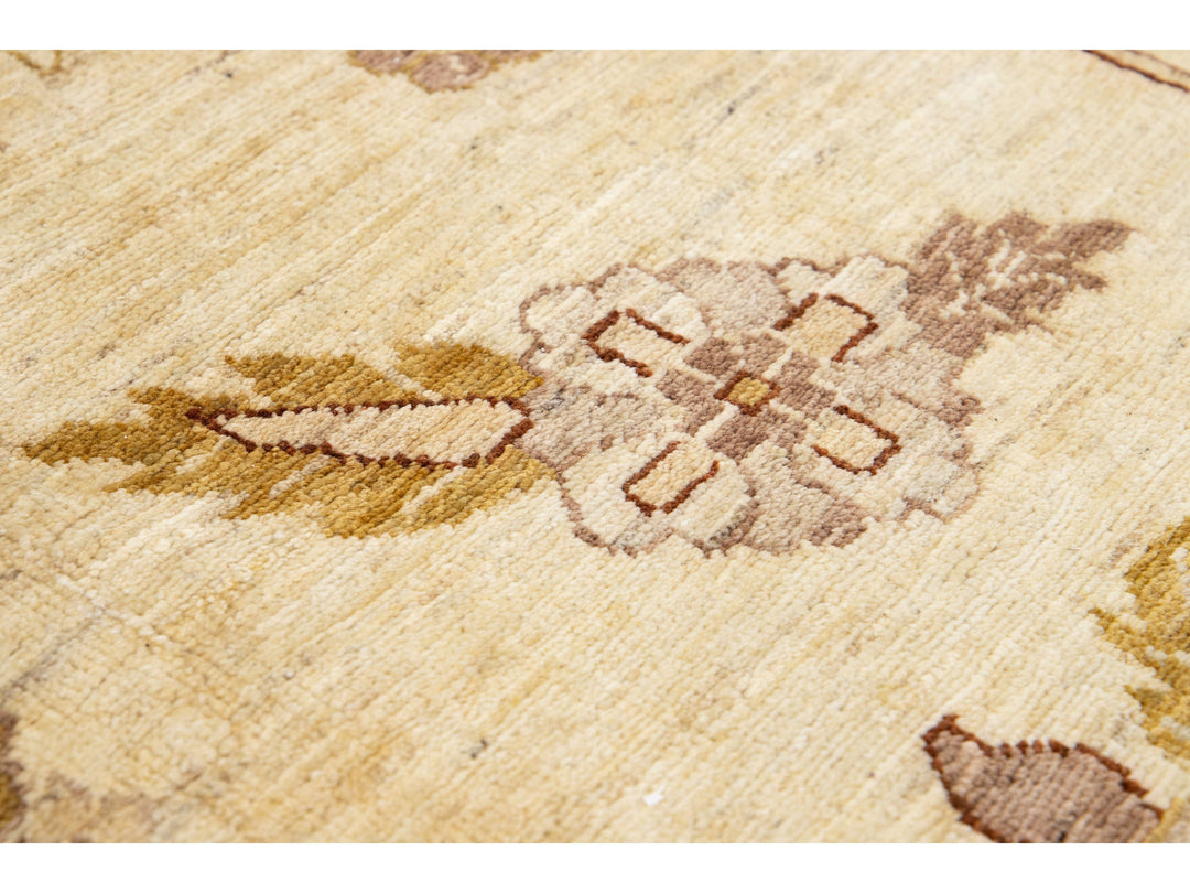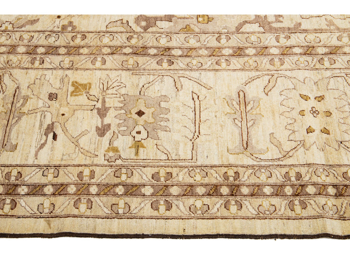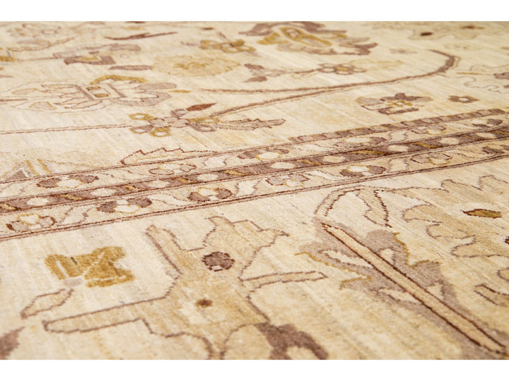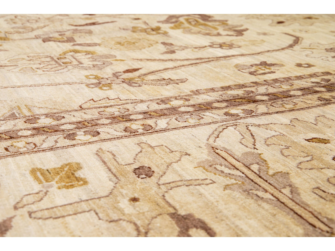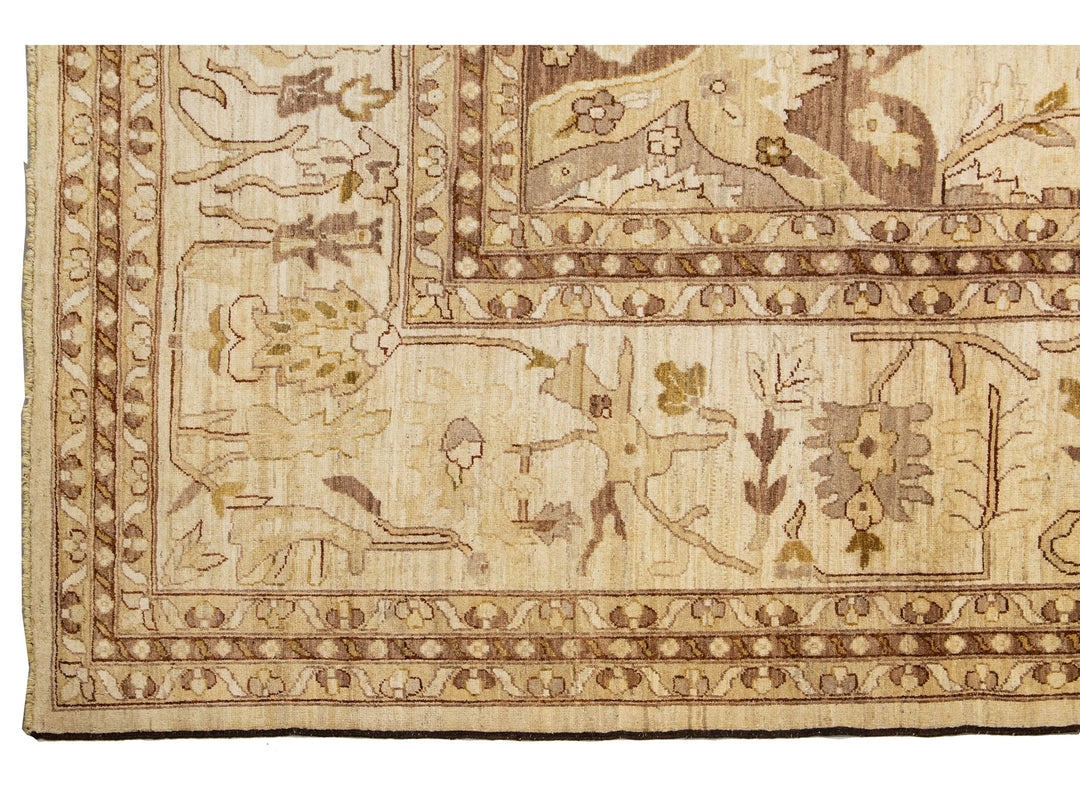 This contemporary Palace-sized Oushak-style wool rug exemplifies traditional craftsmanship. It features a prominent beige background, intricately adorned with a floral pattern that harmoniously integrates refined shades of brown, gray, and goldenrod, thereby enhancing its depth and sophistication. This rug measures 13'10" x 27'10".