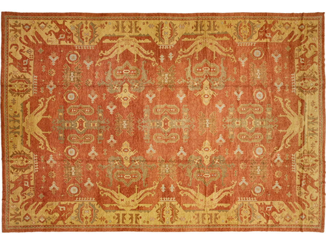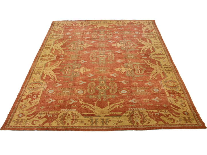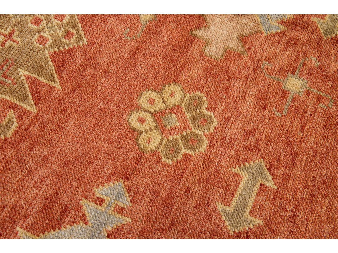 Featuring intricate hand-knotting, this Turkish wool rug boasts an eye-catching deep orange-copper color field framed by a subtle tan hue, with floral geometry in shades of green and blue for a stunning effect.