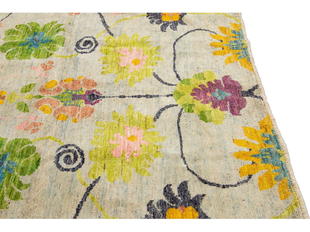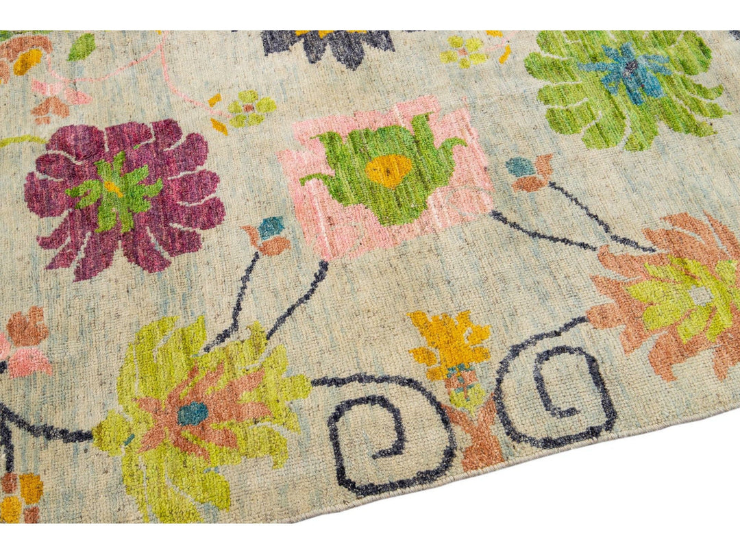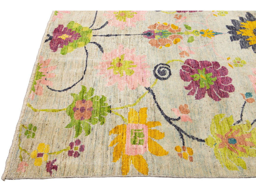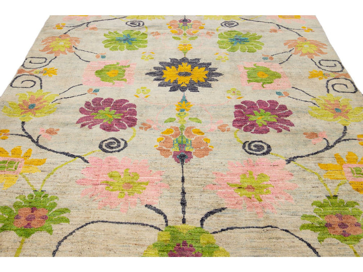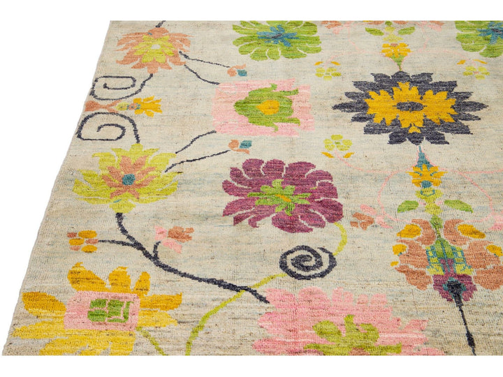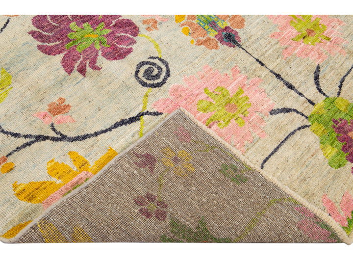 Modern Oushak Handmade Multicolor Floral Pattern Beige Wool Rug