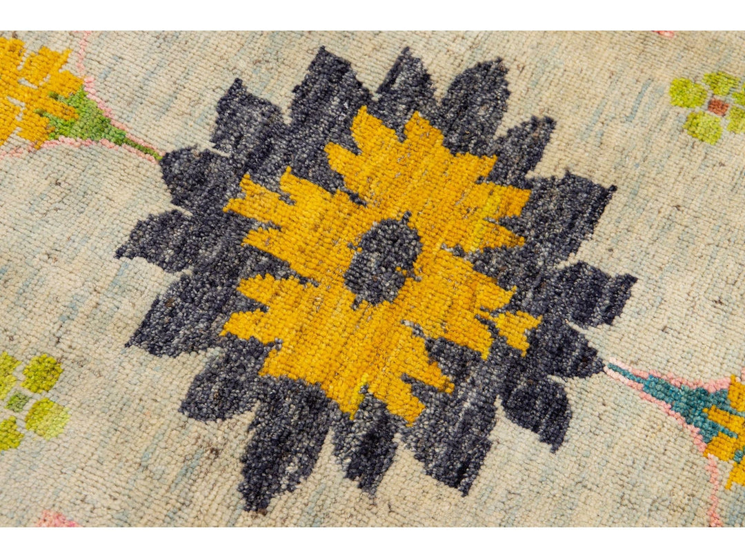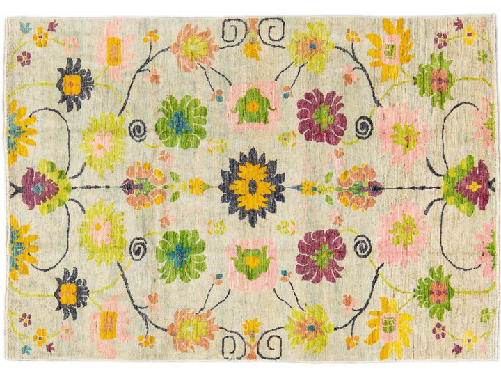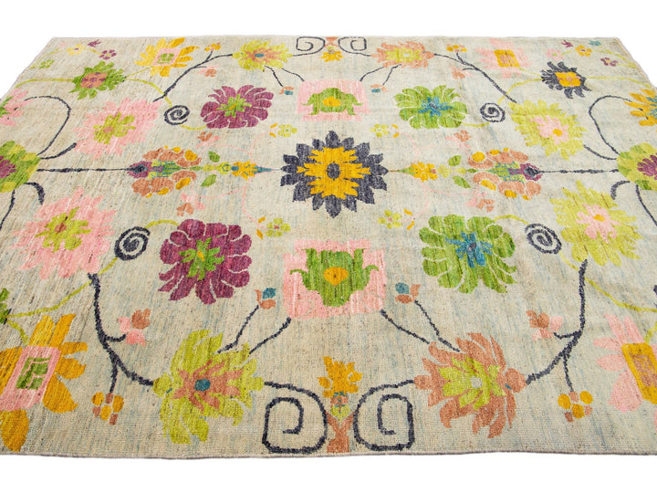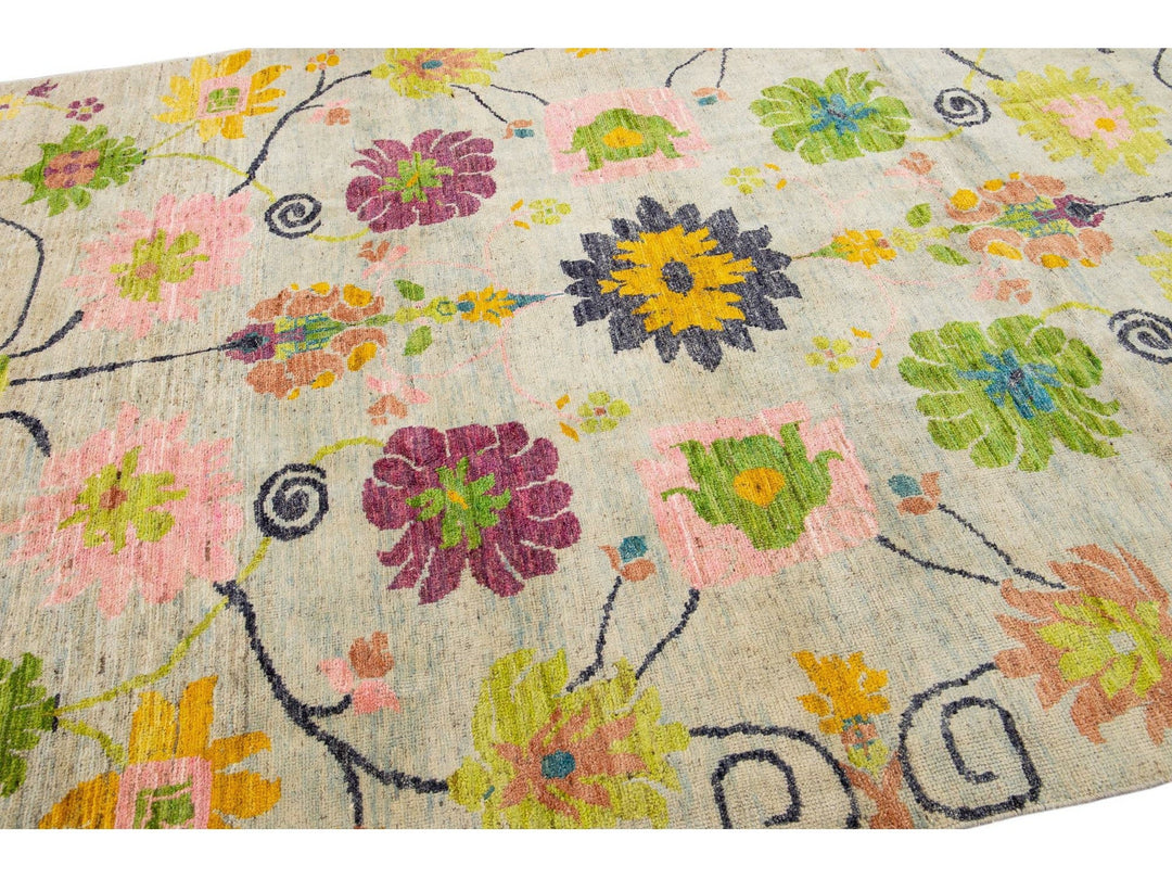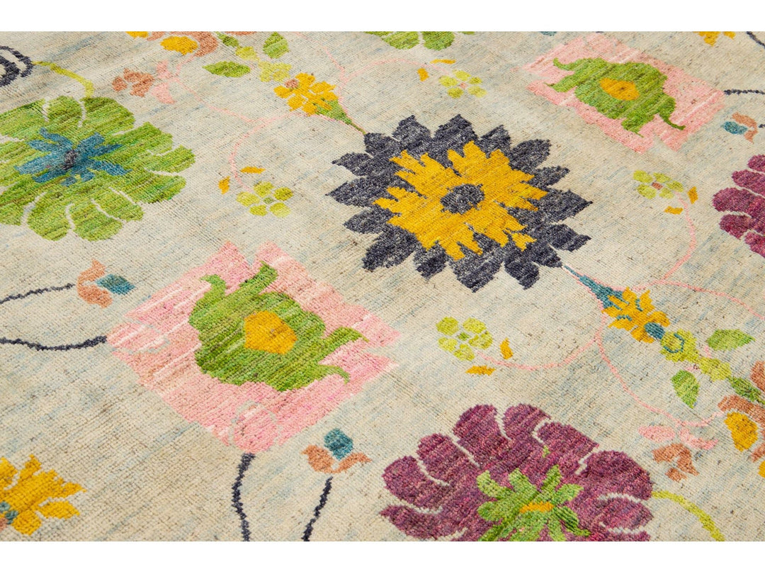 Modern Oushak Handmade Multicolor Floral Pattern Beige Wool Rug