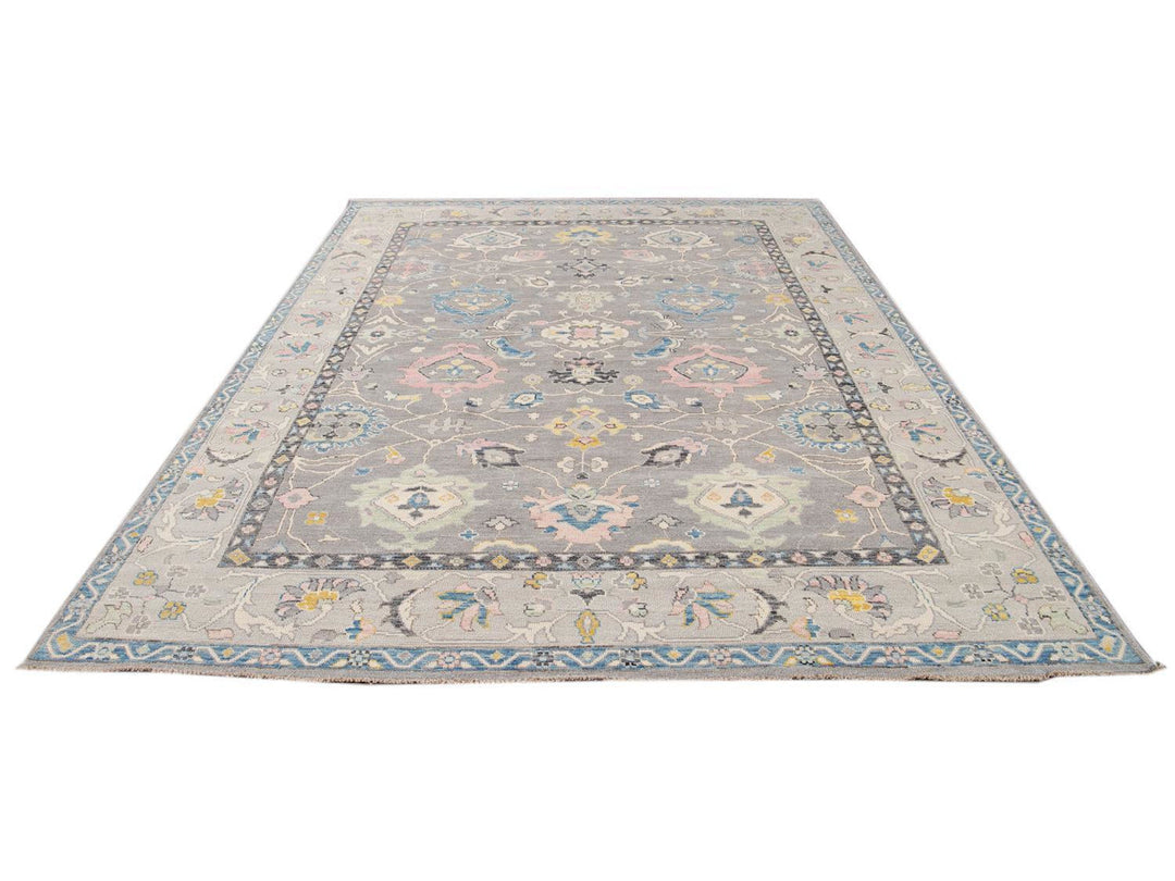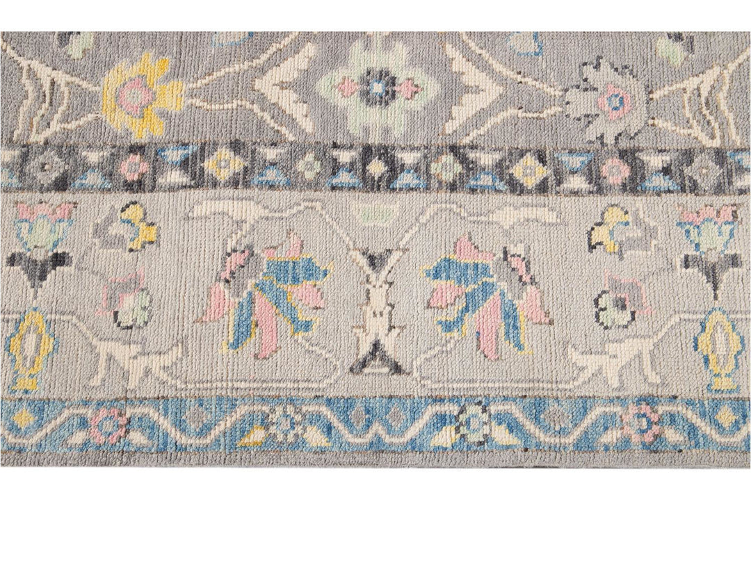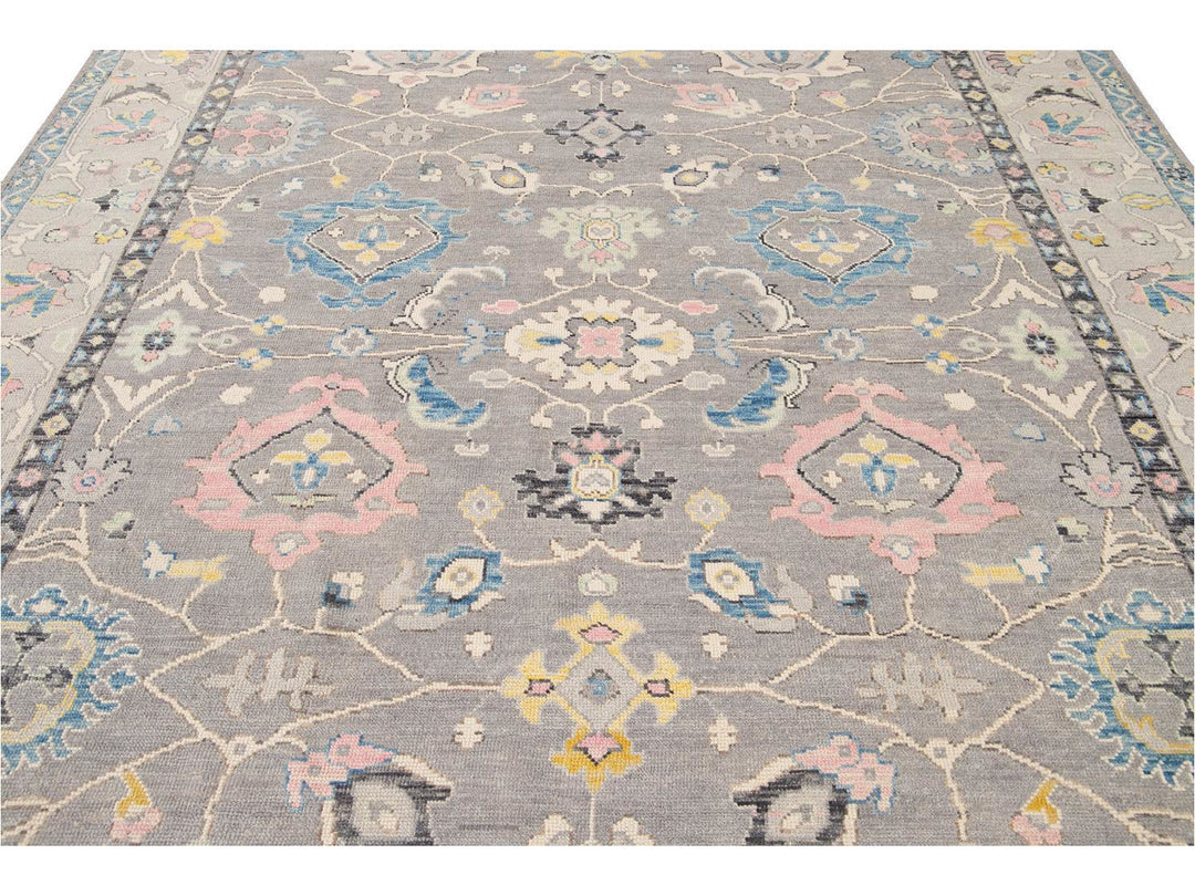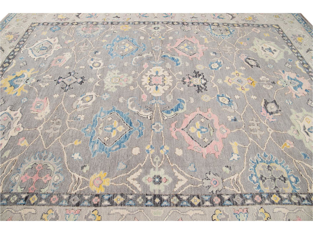 Beautiful contemporary oversize Oushak hand-knotted wool rug with a botanical floral design on a gray field and multi-color accents throughout the piece.