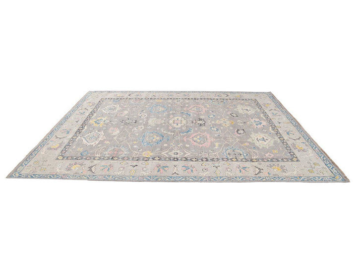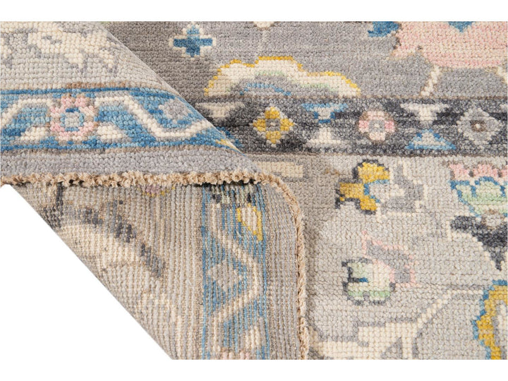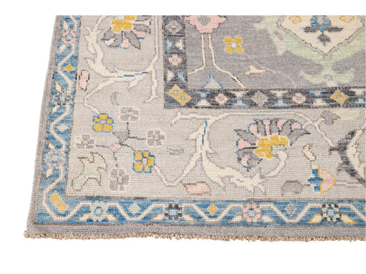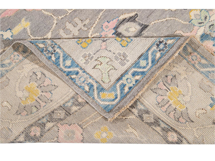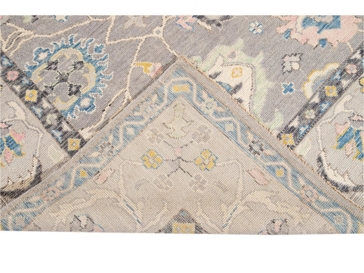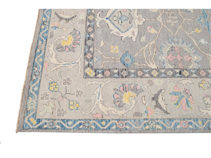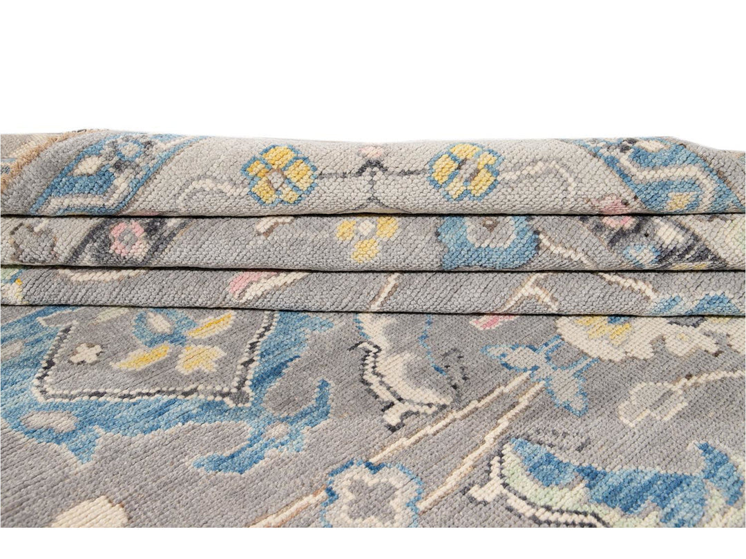 Beautiful contemporary oversize Oushak hand-knotted wool rug with a botanical floral design on a gray field and multi-color accents throughout the piece.