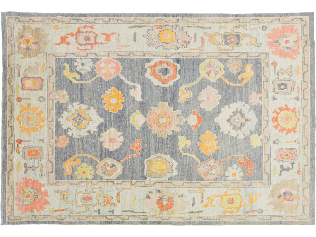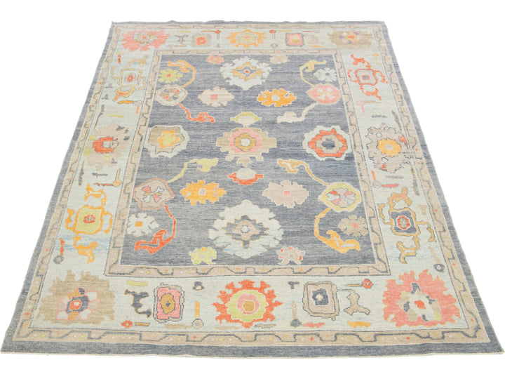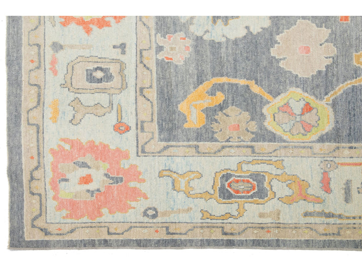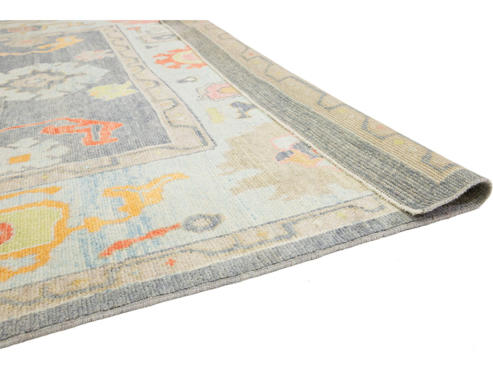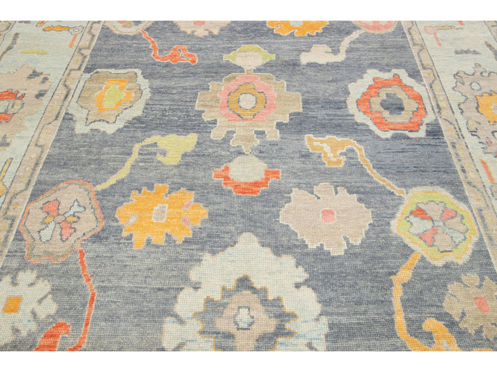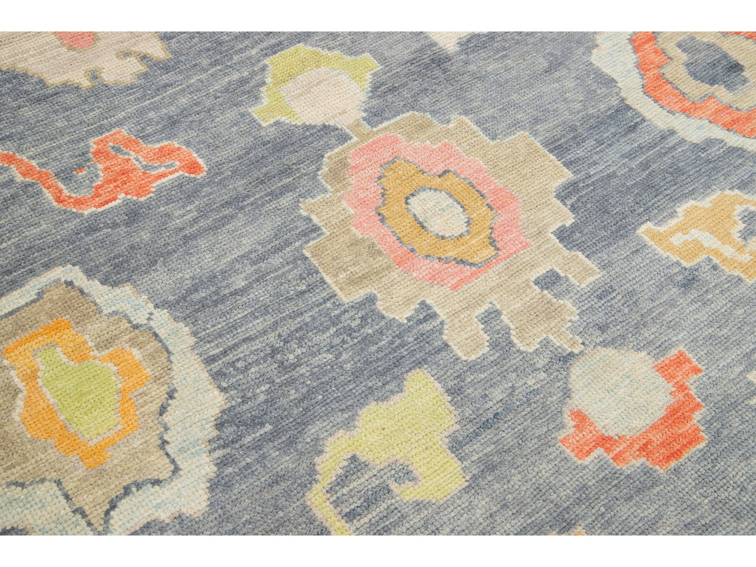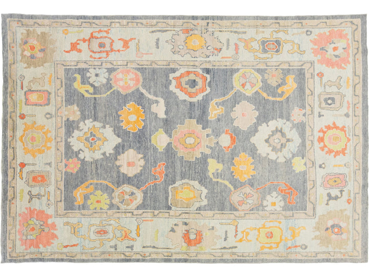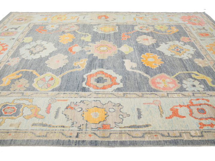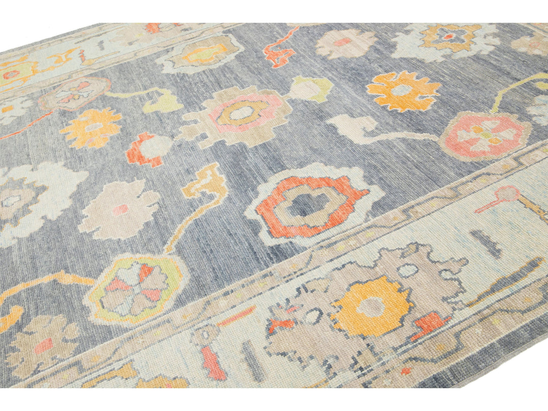 This hand-knotted wool rug is a modern Turkish piece featuring a gray field with a light blue frame and a captivating allover design of multicolor floral patterns. This rug measures 8'9" x 13'.