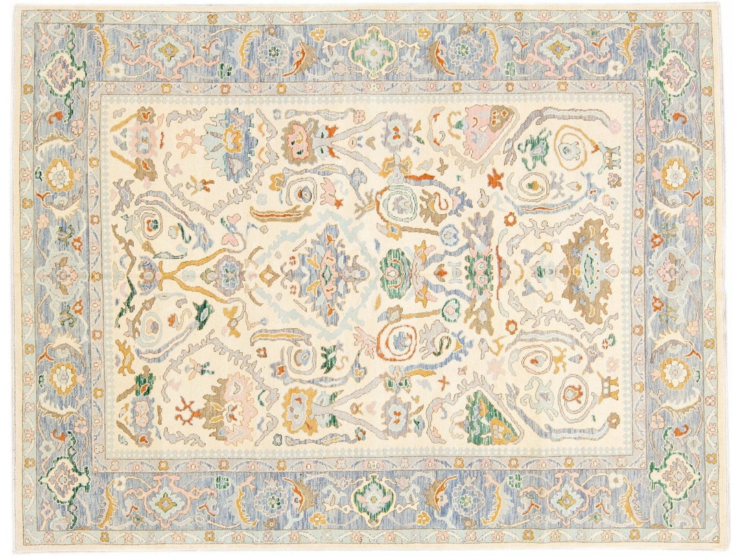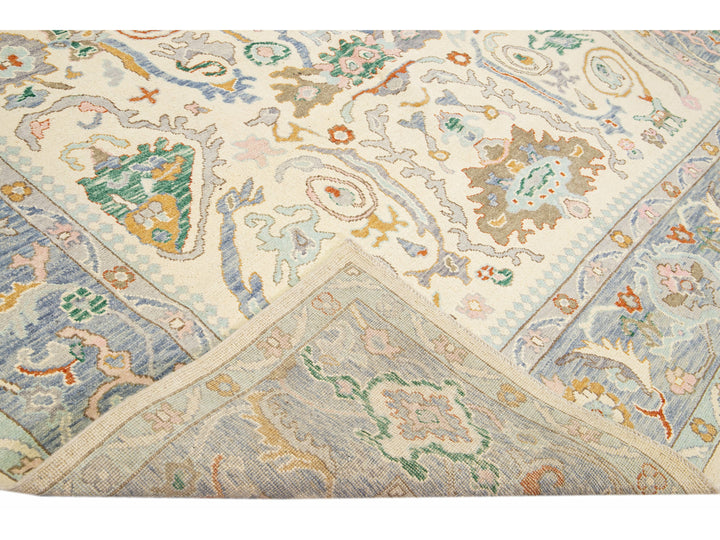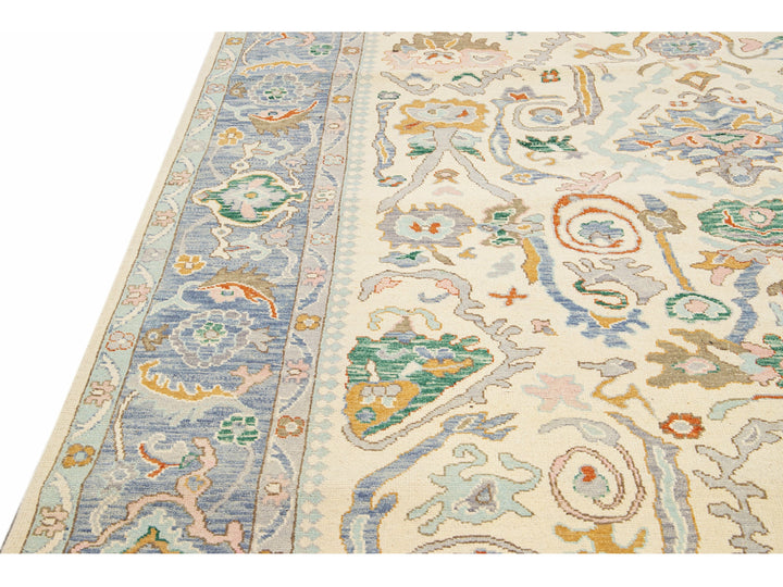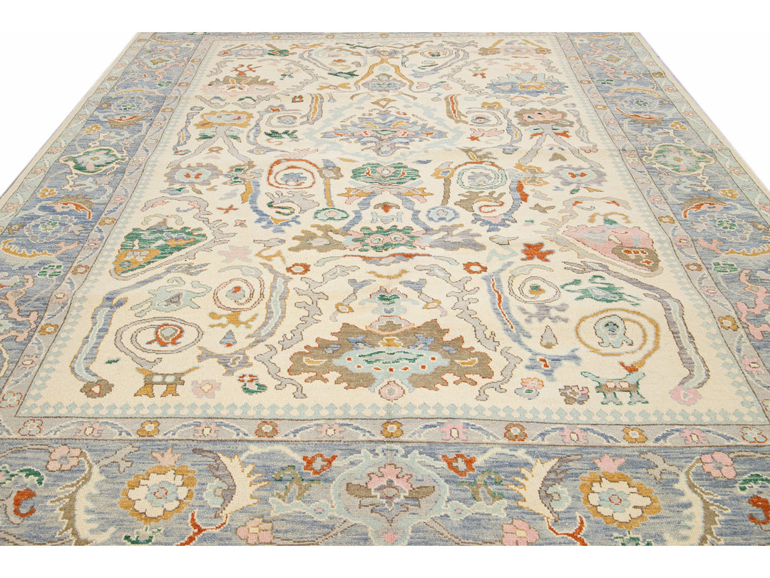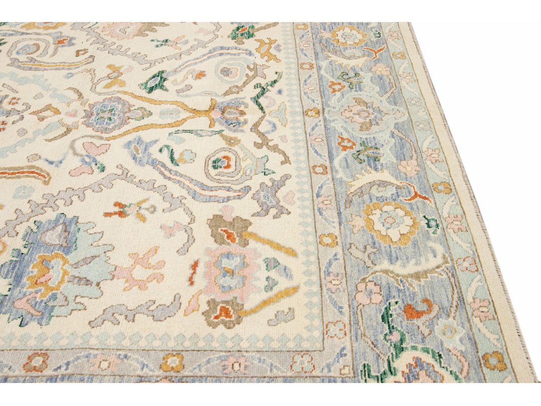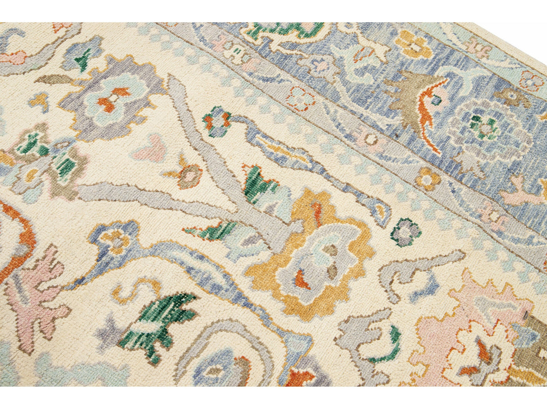 Beautiful modern Oushak hand-knotted wool rug with a beige field. This Oushak rug has a blue frame and multicolor accents layout a gorgeous geometric floral pattern design.