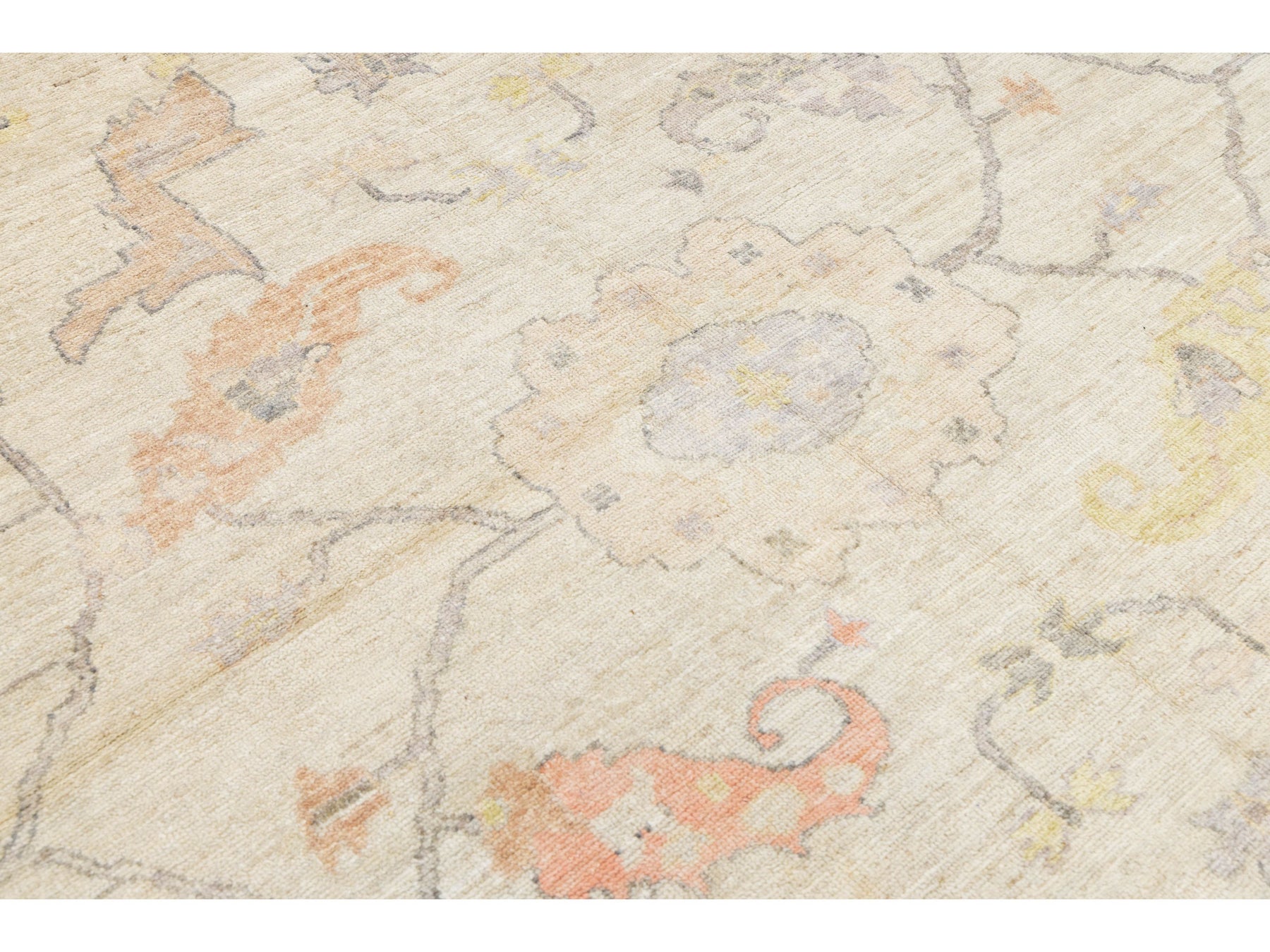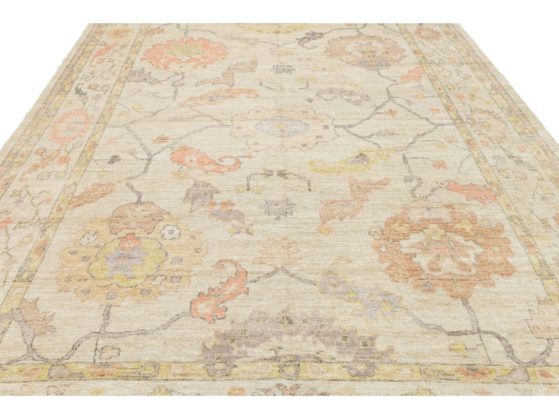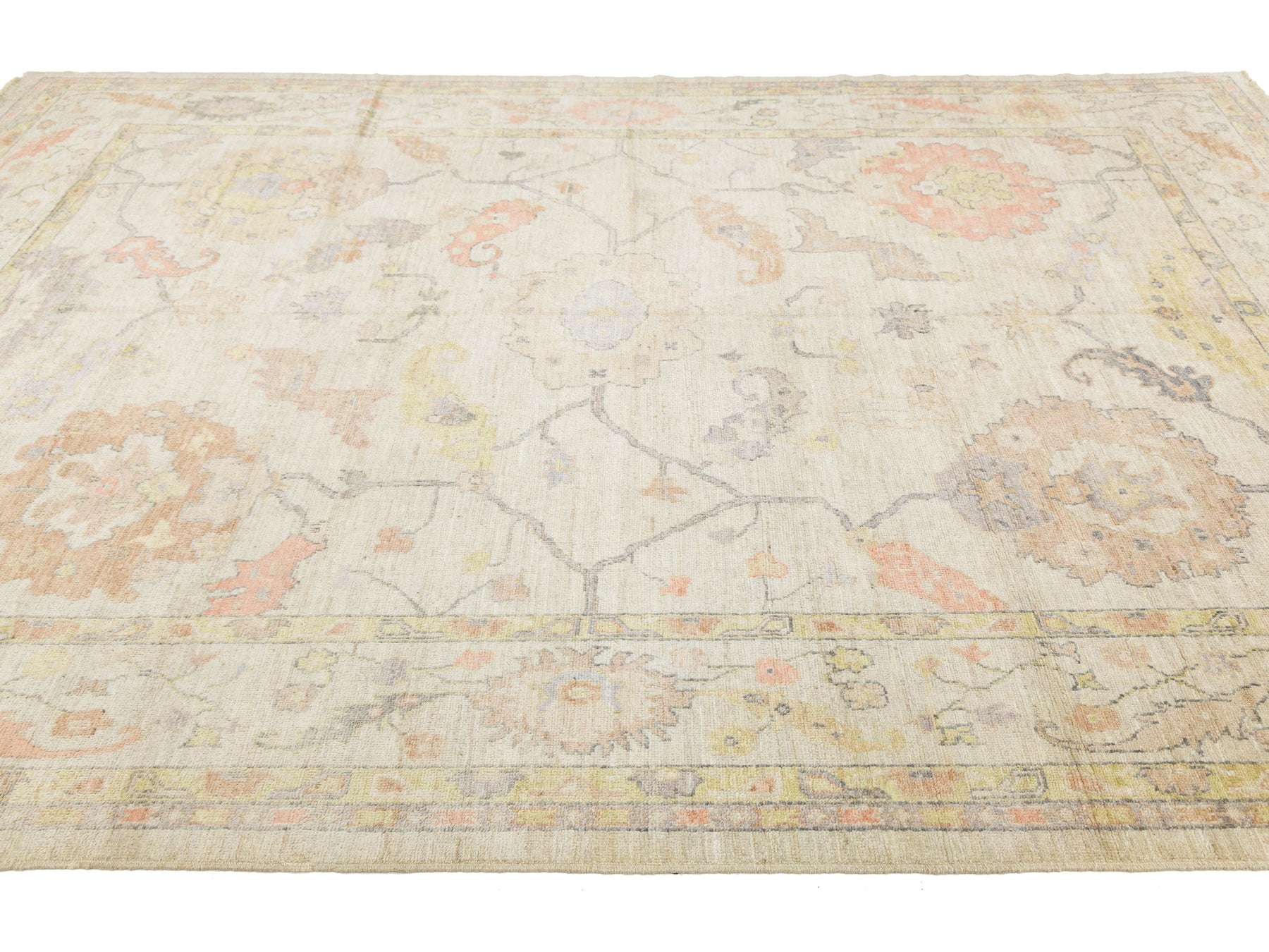Elevate your space with this Modern Oushak Style Wool Rug, blending timeless Turkish heritage with contemporary design. Hand-knotted from premium wool, it features large palmettes and floral motifs on a soft ivory field, accented by muted peach, sage green, lavender, and warm ochre. With a distressed, low-pile finish, this rug offers a "new vintage" look that complements various styles, from Transitional to Coastal. This rug measures 8'8" x 11'8".