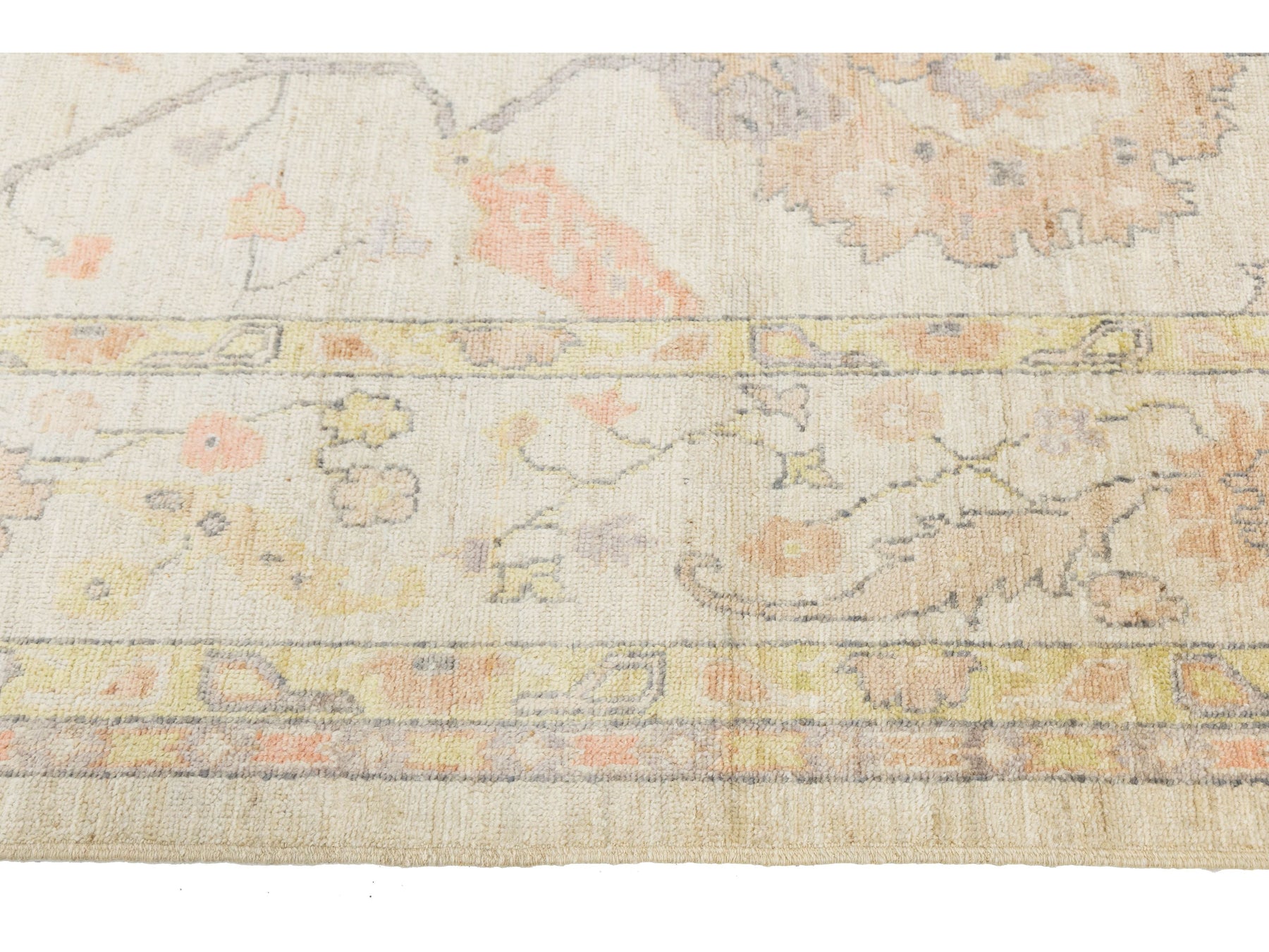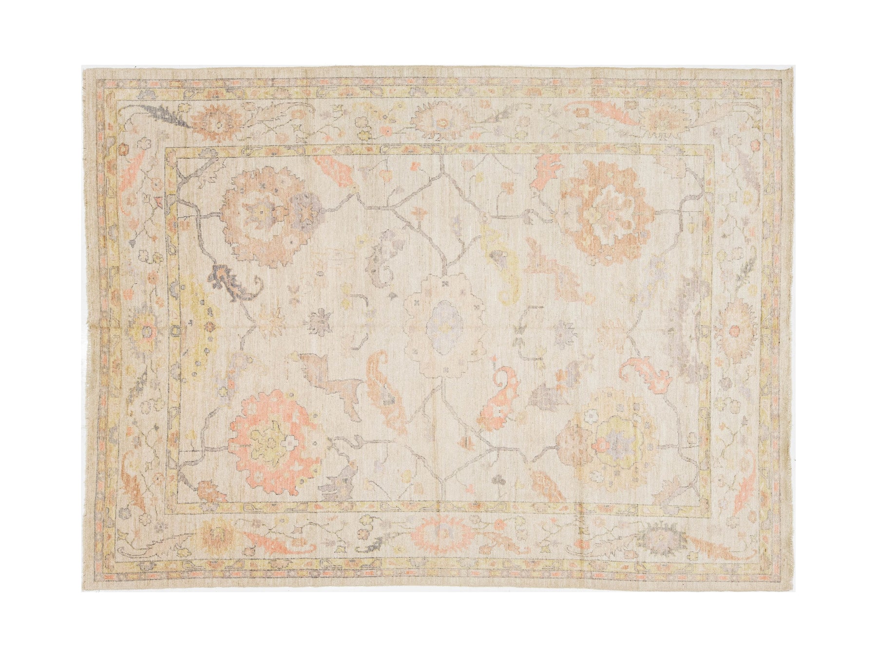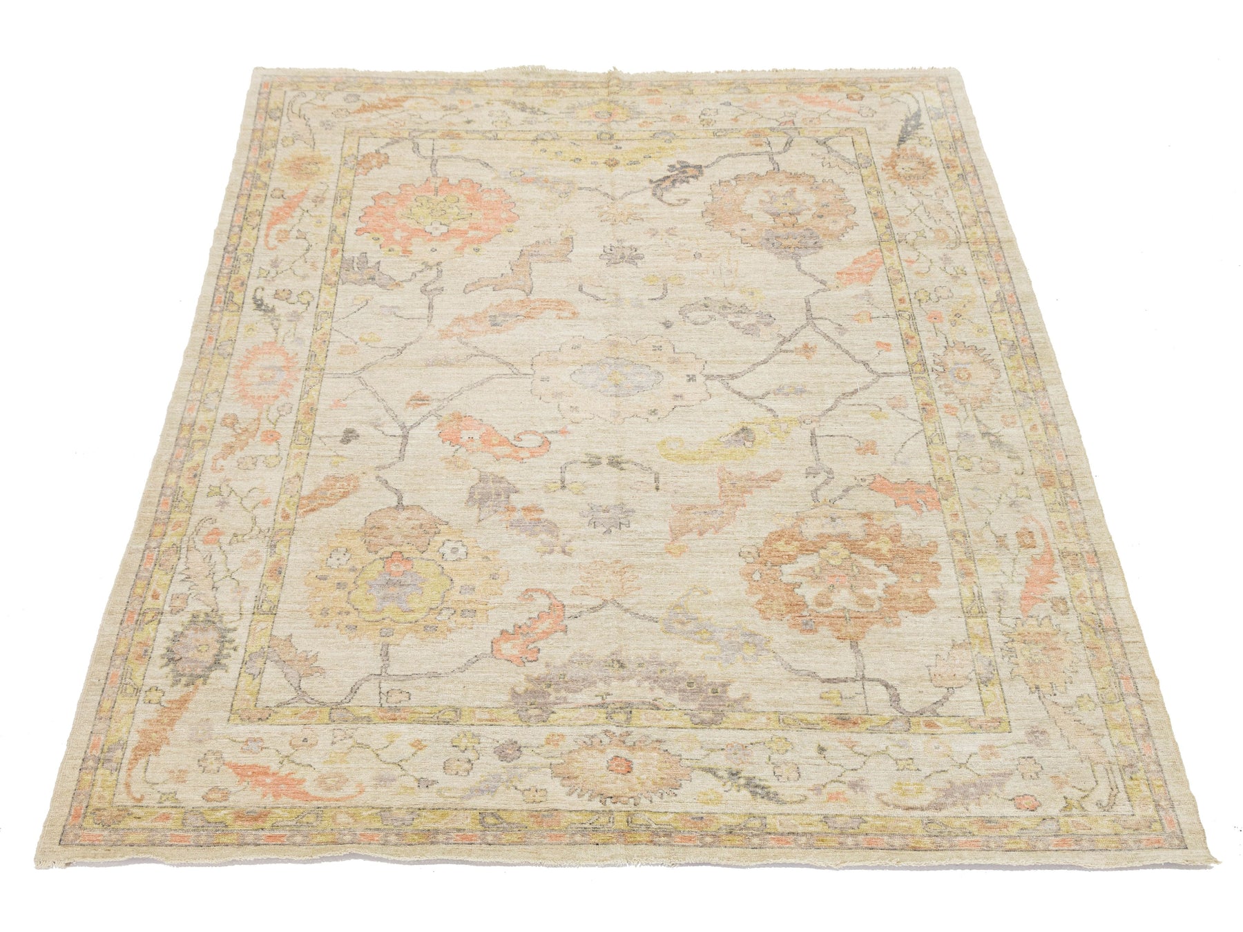 Elevate your space with this Modern Oushak Style Wool Rug, blending timeless Turkish heritage with contemporary design. Hand-knotted from premium wool, it features large palmettes and floral motifs on a soft ivory field, accented by muted peach, sage green, lavender, and warm ochre. With a distressed, low-pile finish, this rug offers a "new vintage" look that complements various styles, from Transitional to Coastal. This rug measures 8'8" x 11'8".