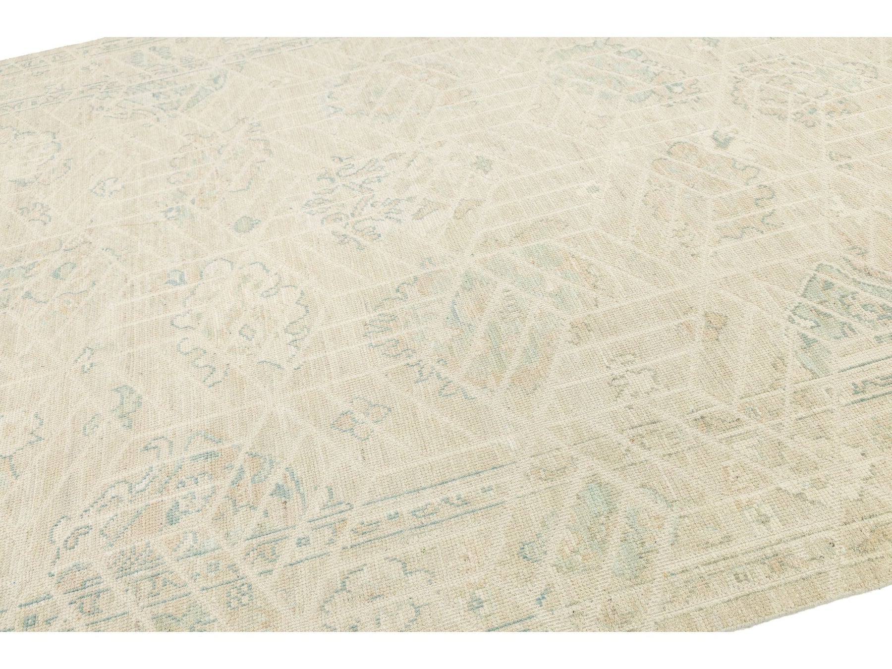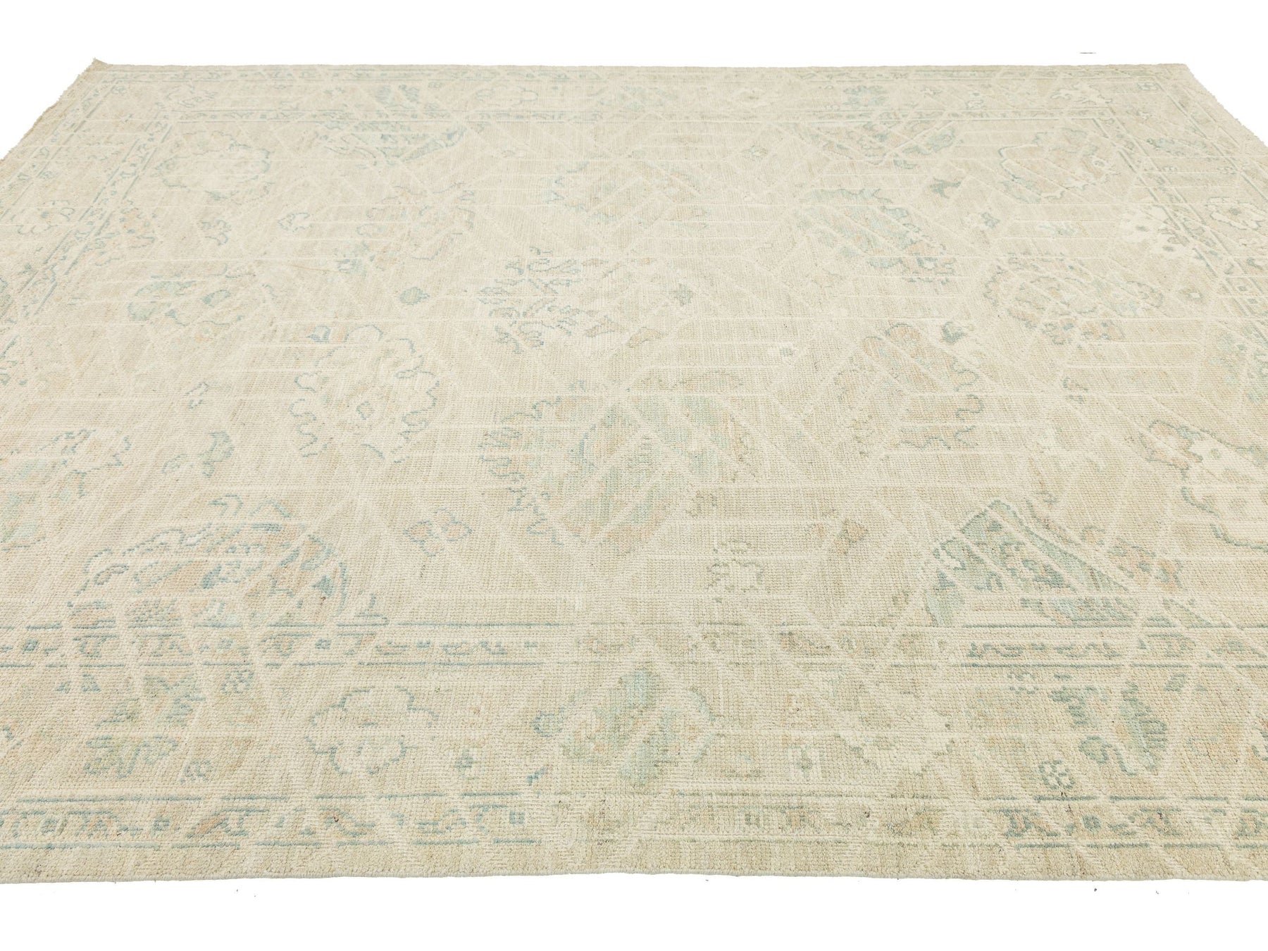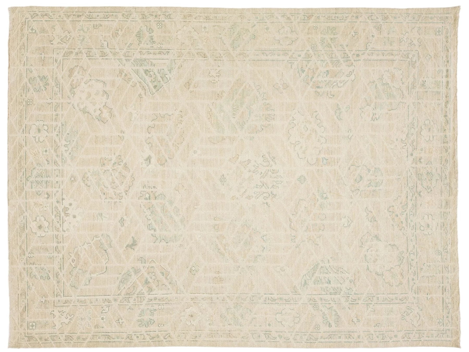 Elevate your space with this Modern Oushak style area rug. Hand-knotted from premium wool, it features a soft, low-pile texture for durability and luxury. The design blends classic Turkish motifs with a geometric overlay, creating a subtle grid effect. Its muted colors—creamy ivory, pale sage green, and soft apricot—make it perfect for Organic Modern, Scandi-Boho, and upscale Traditional interiors. This rug measures 8'11" x 11'10".