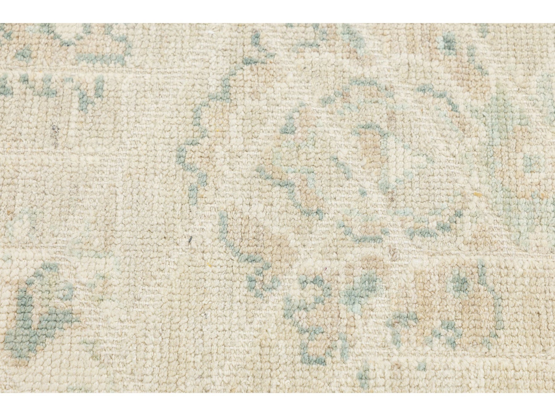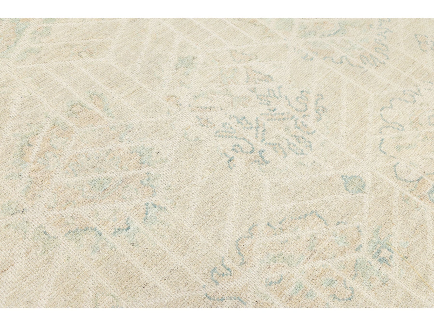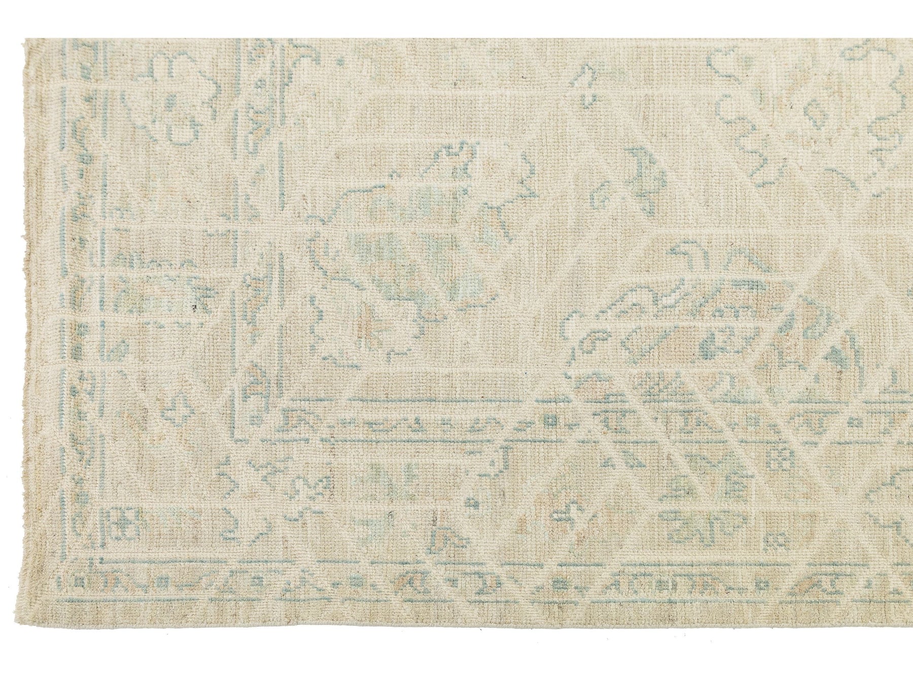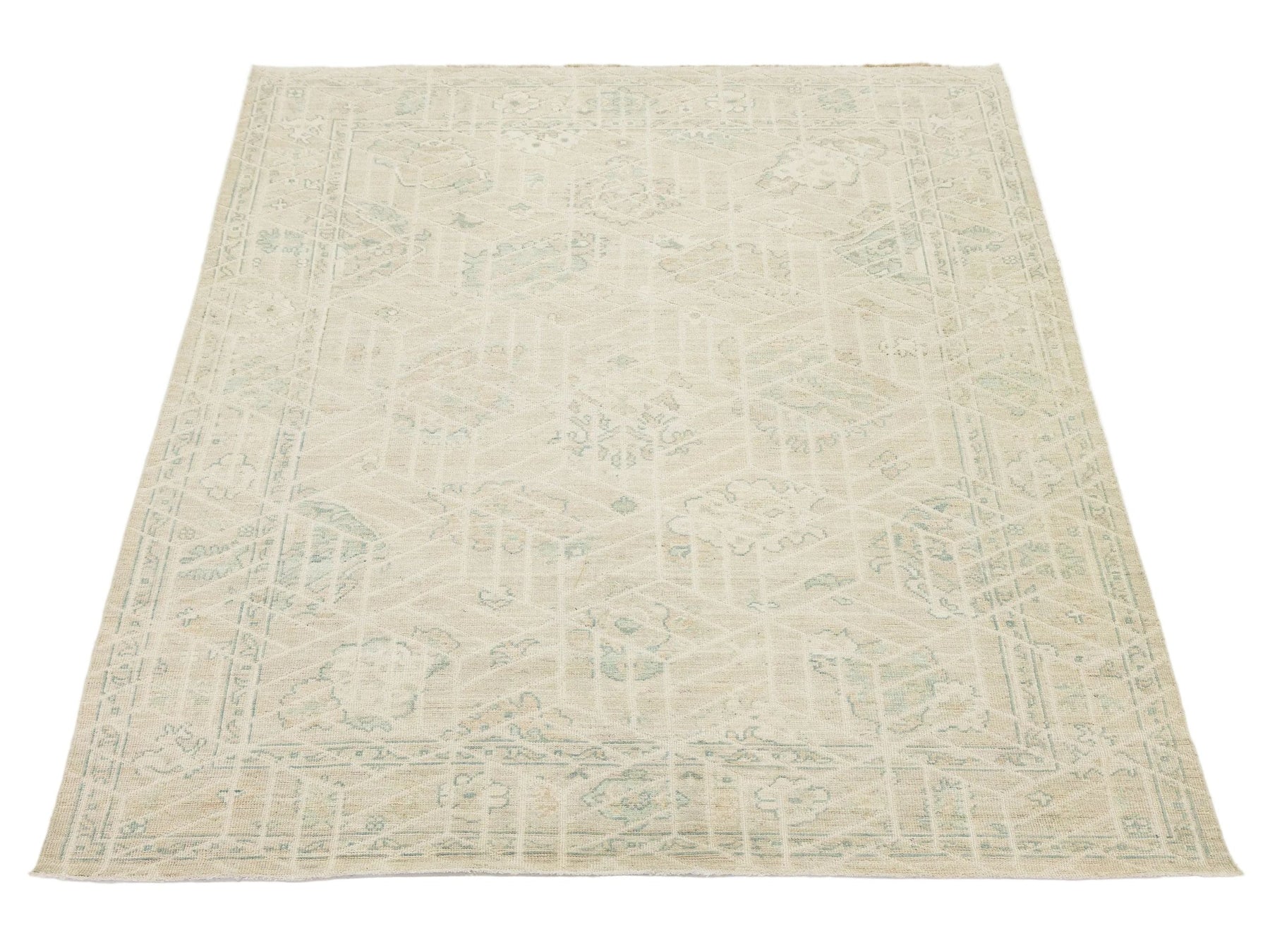Elevate your space with this Modern Oushak style area rug. Hand-knotted from premium wool, it features a soft, low-pile texture for durability and luxury. The design blends classic Turkish motifs with a geometric overlay, creating a subtle grid effect. Its muted colors—creamy ivory, pale sage green, and soft apricot—make it perfect for Organic Modern, Scandi-Boho, and upscale Traditional interiors. This rug measures 8'11" x 11'10".