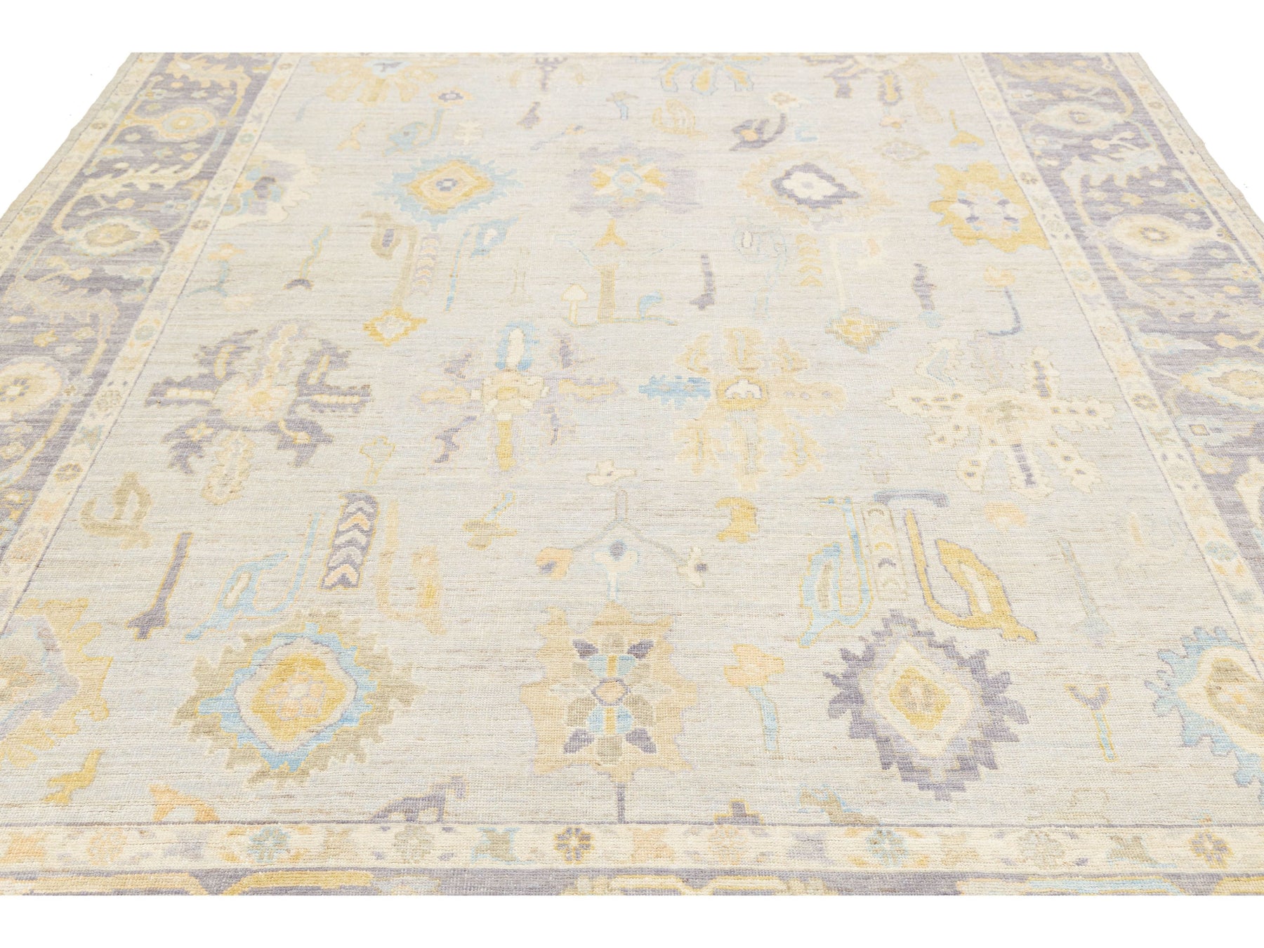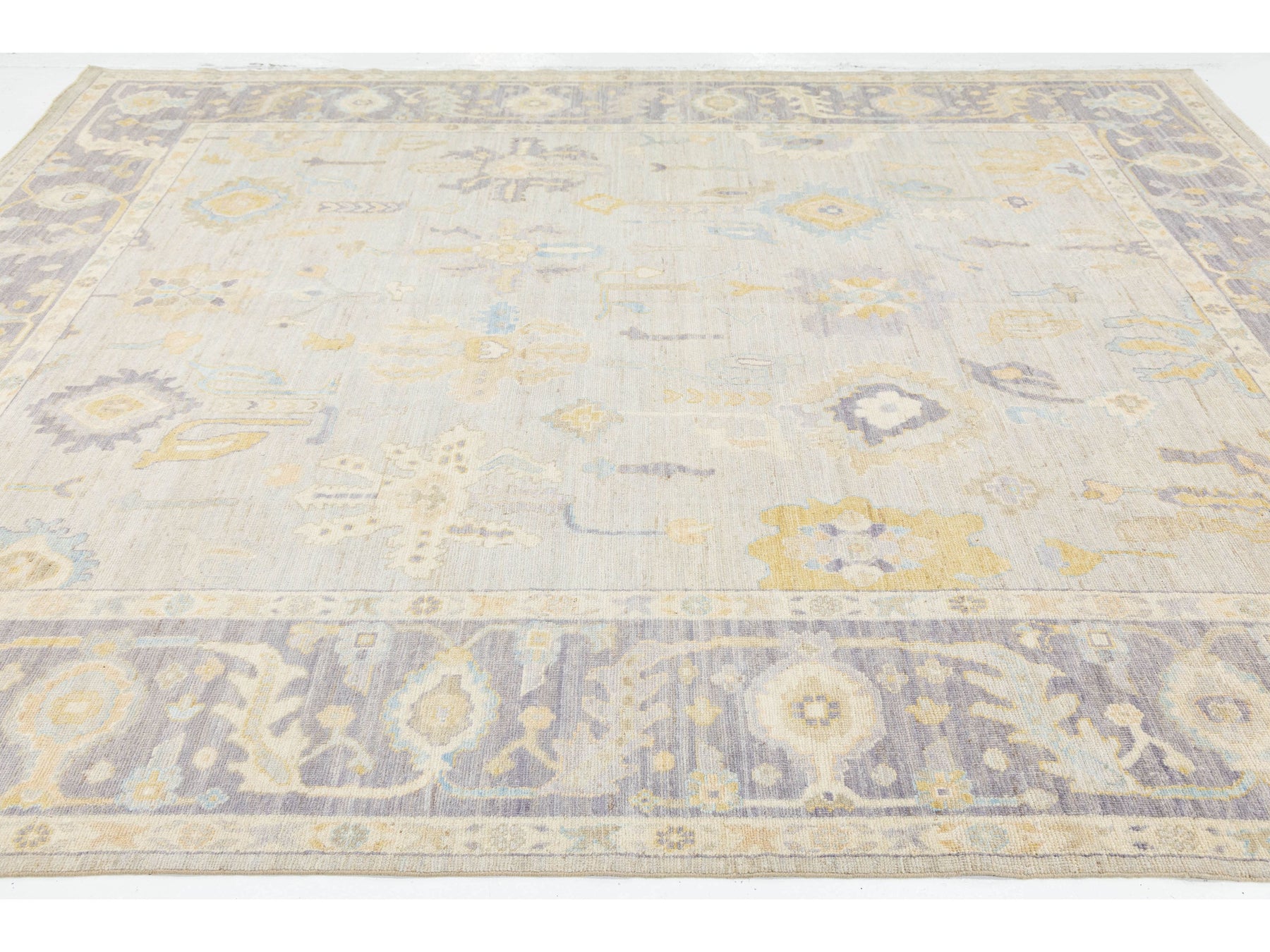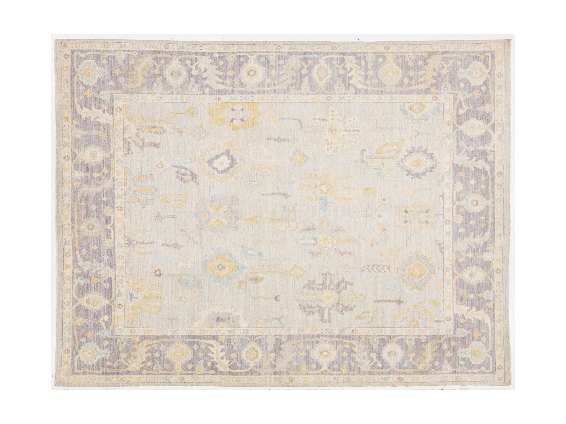 Elevate your space with the elegance of this Modern Oushak Style Wool Rug, blending Turkish design with a contemporary palette. Featuring a muted silver and ivory field with oversized botanical motifs in lavender, gold, and dusty blue, it offers a luxurious low-pile texture. The hand-knotted wool construction is durable and soft underfoot, while the subtle lavender-toned border enhances its serene aesthetic, making it perfect for transitional, coastal, or modern farmhouse interiors. This rug measures 9' x 11'10".