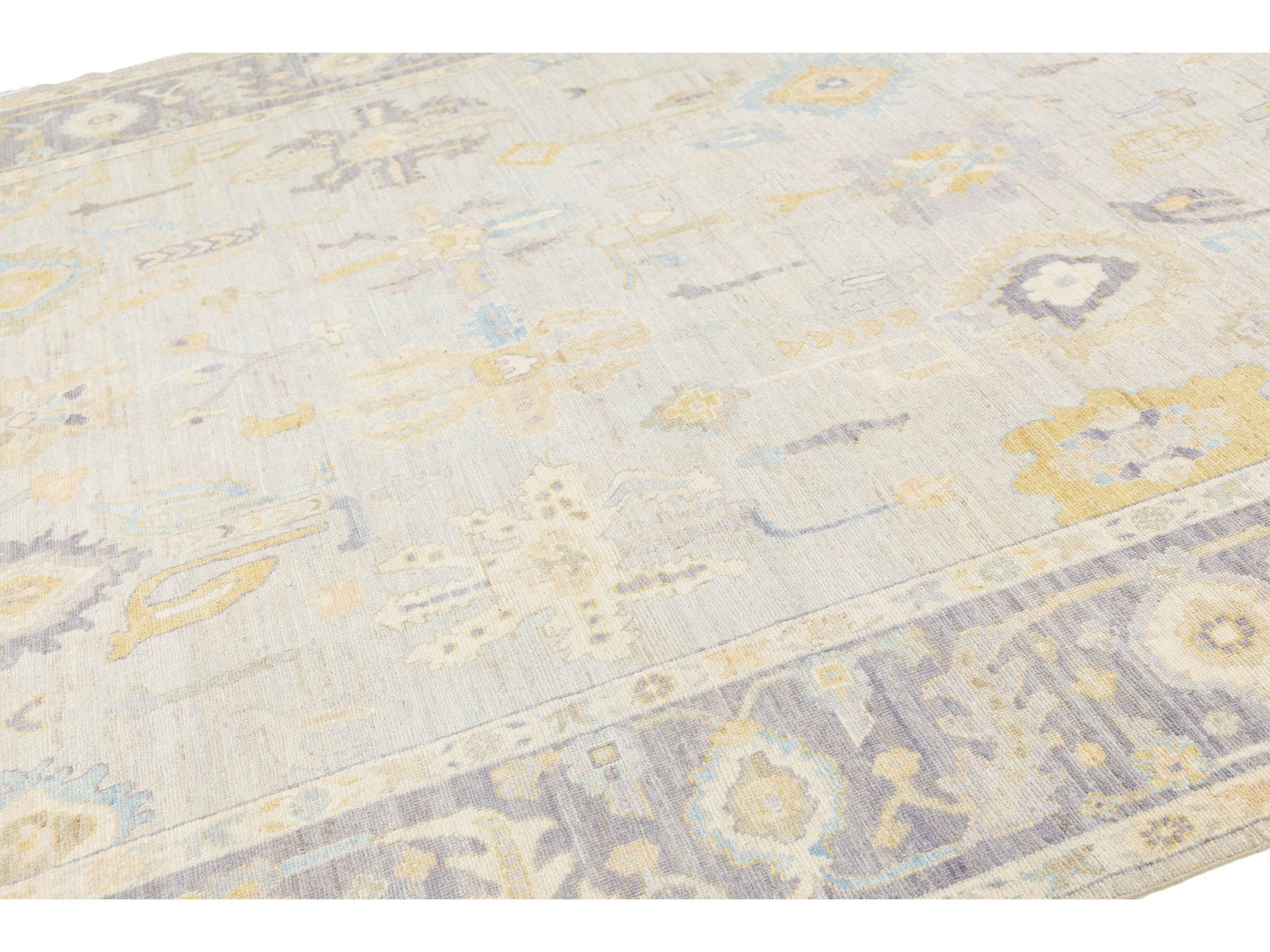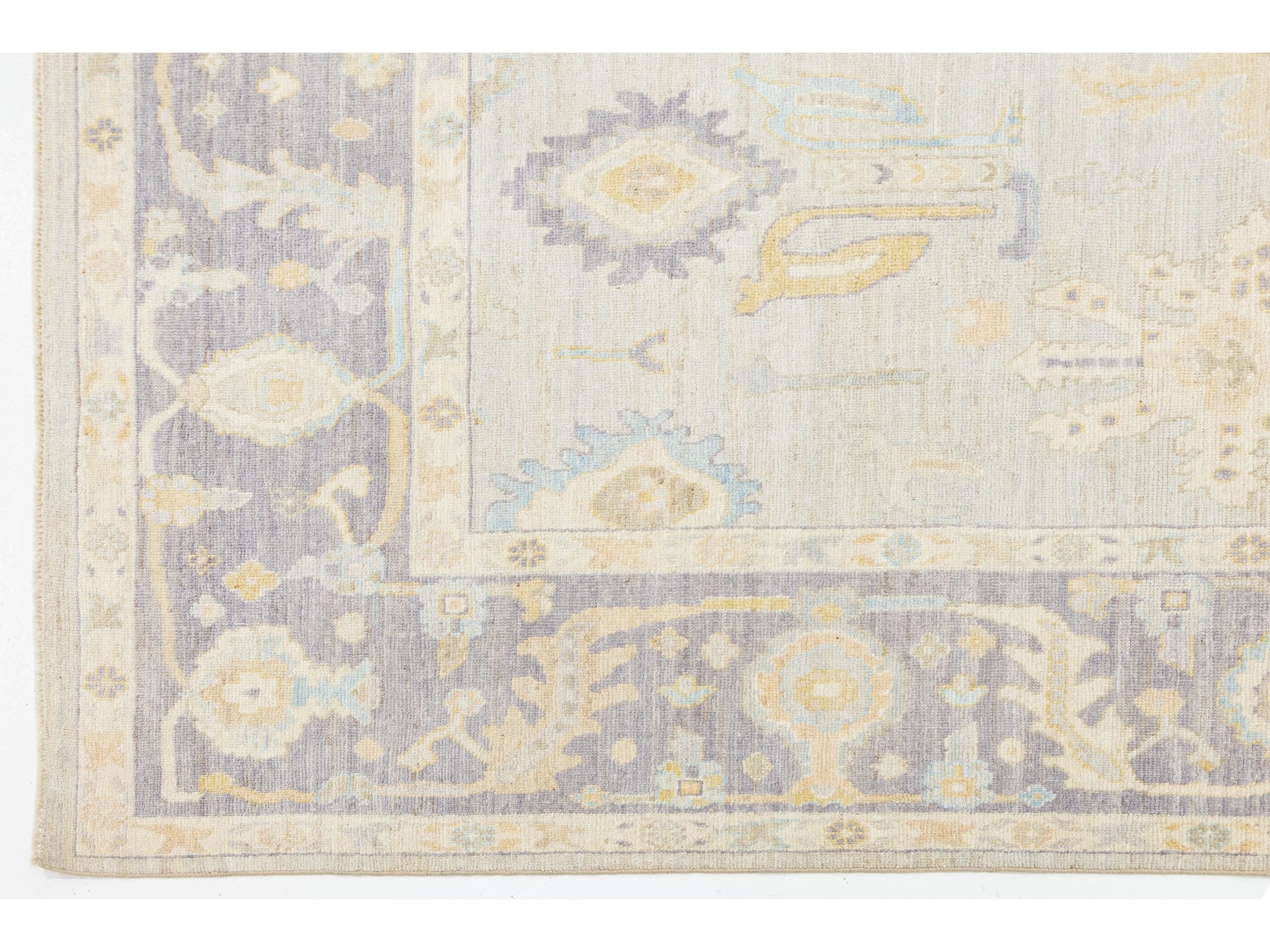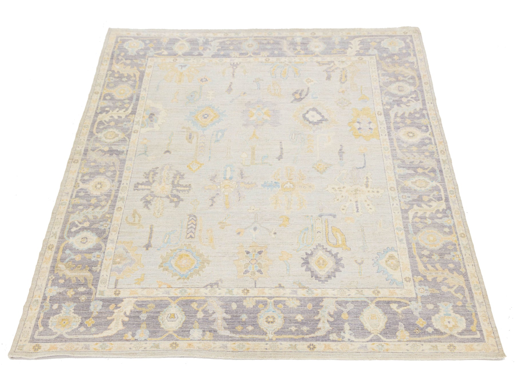 Elevate your space with the elegance of this Modern Oushak Style Wool Rug, blending Turkish design with a contemporary palette. Featuring a muted silver and ivory field with oversized botanical motifs in lavender, gold, and dusty blue, it offers a luxurious low-pile texture. The hand-knotted wool construction is durable and soft underfoot, while the subtle lavender-toned border enhances its serene aesthetic, making it perfect for transitional, coastal, or modern farmhouse interiors. This rug measures 9' x 11'10".