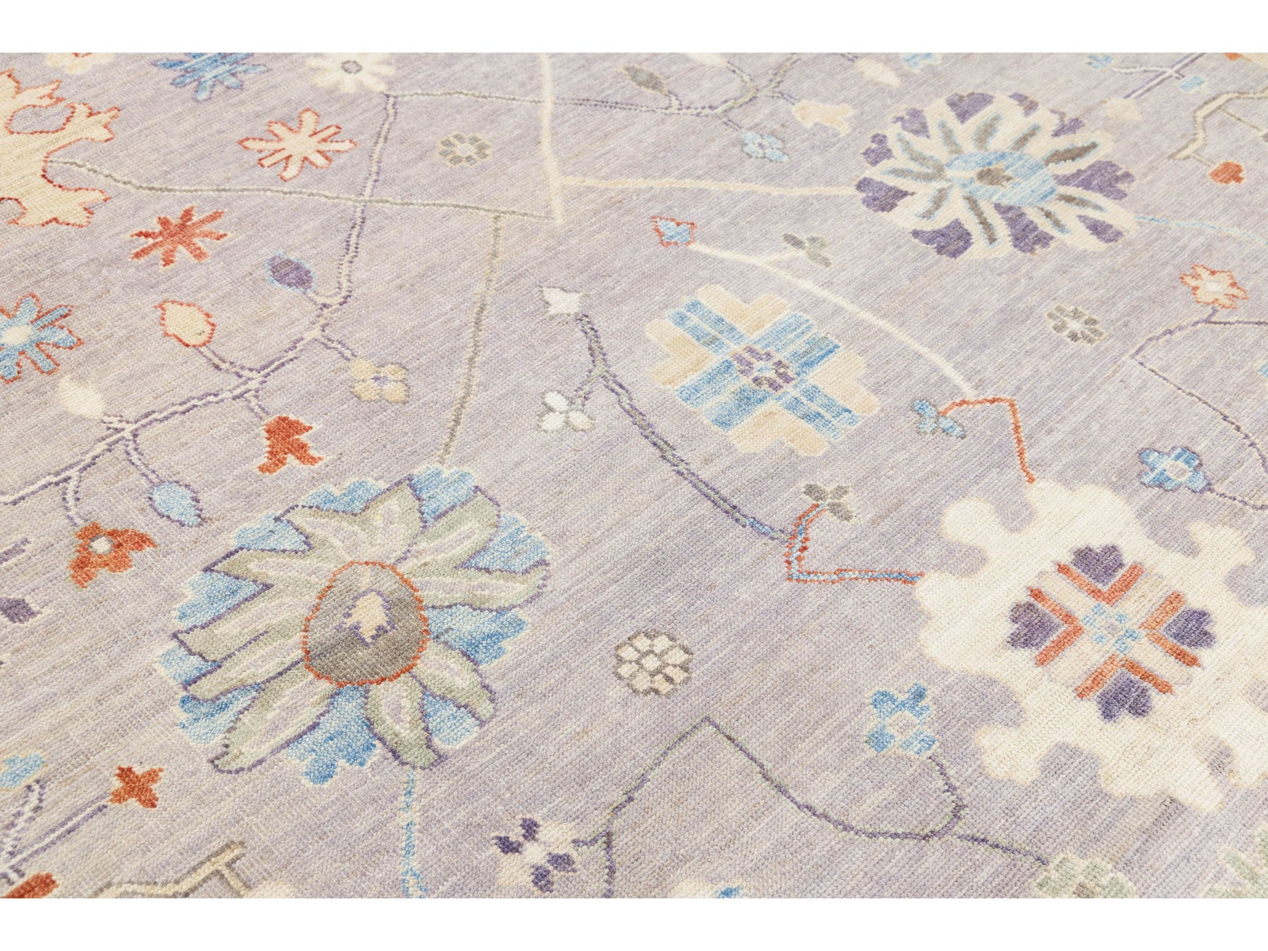 Elevate your space with this beautiful Modern Oushak style rug, hand-knotted from high-pile wool. It features a sophisticated lavender and muted lilac field adorned with an oversized floral motif in soft shades of sage green, terracotta, powder blue, and cream. The deep purple border adds elegance, while the distressed finish captures the charm of an antique Oushak. Its airy design makes it perfect for contemporary, bohemian, or coastal-inspired living areas. This rug measures 9'1" x 11'8".